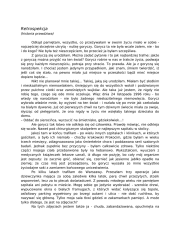 Retrospekcja (historia prawdziwa) Odkąd pamiętam, wszystko, co przeżywałam w swoim życiu miało w sobie najczęściej skrzętnie ukrytą - nutkę goryczy. Gorycz ta nie była wcale żalem, nie - bo i do kogo? Nie była też nieszczęściem, bo przecież ja byłam szczęśliwa. Z goryczą się urodziłam. Można zadać pytanie i to jak najbardziej trafne: jakże z goryczą można przyjść na ten świat? Gorycz rośnie w nas w trakcie życia, podwaja się przy każdym nieszczęściu, potraja przy stracie. To prawda. Ale ja z goryczą się narodziłam. I chociaż jestem jedynym przypadkiem, jaki znam, śmiem twierdzić, iż jeśli coś się stało, na pewno miało już miejsce w przeszłości bądź mieć miejsce dopiero będzie... Nikt nie planował mnie takiej… Takiej, jaką się urodziłam. Miałam być słodkim i nieskazitelnym niemowlakiem, śmiejącym się do wszystkich wokół i podziwianym przez pulchne ciotki oraz zarośniętych wujków. Ale taka już jestem, że nigdy nie robię tego, czego się ode mnie oczekuje. Więc dnia 24 listopada 1996 roku - bo wtedy się narodziłam - nie było żadnego nieskazitelnego niemowlęcia. Gorycz wybrała właśnie mnie, by wyjrzeć na ten świat - i rozlała się po mnie jak czekolada na białym dywanie. Już od pierwszych chwil na tym dziwnym świecie miała za swoje, słysząc od pielęgniarki, że ona nigdy w życiu nie wzięłaby takiego dzieciaka do domu. – Oddać do sierocińca, wyrzucić na śmietnisko, gdziekolwiek…! Ale gorycz tak łatwo nie odkleja się od człowieka. Prawdę mówiąc, nie odkleja się wcale. Nawet pod chirurgicznym skalpelem w najlepszym szpitalu w stolicy. Jakoś tam w końcu trafiłam - po wielu innych szpitalach i klinikach, w których gościłam, a było ich niemało - choćby krakowski Prokocim, gdzie byłam w wieku trzech miesięcy, zdiagnozowana jako śmiertelnie chora i poddawana serii szalonych badań. Jednak zupełnie bez przyczyny - byłam całkowicie zdrowa. Tylko niektóre części mojego ciała przebarwione były na hebanowo. Wykształceni, wyuczeni z medycznych książeczek lekarze uznali, iż długo nie pożyję, bo cały mój organizm jest zepsuty: że zacznie gnić, obierać się, czernieć jak jesienne jabłko opadłe na ziemię; że czas mój jest przesądzony, bo gorycz wyssała ze mnie wszystkie życiodajne soki z zamiarem końcowego unicestwienia. Po kilku latach trafiłam do Warszawy. Przeszłam trzy operacje jako dziewczynka mająca za sobą zaledwie kilka latek, parę chwil przeżytych, stosik wspomnień, lecz za to plecak doświadczeń. Z powodu młodego wieku nie pamiętam szpitala ani pobytu w mieście. Mogę sobie go jedynie wyobrażać - szerokie drzwi, wypucowane okna o białych framugach, z których widać kołyszące się topole, asfaltowy parking wypełniony po brzegi autami i ulica - nie dość ruchliwa, by nazywać się główną. Tylko moja sala tkwi gdzieś w zakamarkach pamięci. A może tylko dlatego, że jest na zdjęciach? Na tych zdjęciach jestem także ja - chuda, zabandażowana, opuchnięta na buzi, w białej pidżamie w niebieskie kropki. Spałam na górnym łóżku, a z okna obserwowałam ponure miejskie życie - szare, powielające się, monotonne, monotematyczne, monochromatyczne życie... Ja, kilkuletnie zmizerniałe licho w sterylnym bielutkim szpitalu pośród innych bladych, opuchniętych, zabandażowanych lub nie, pacjentów. Lecz mimo tego wszystkiego - bolącej twarzy w dzień po operacji, zamglonego widoku z okien o białych framugach - skakałam na jednej nodze z wielkim uśmiechem od ucha do ucha. A za każdym razem gdy się uśmiechałam, twarz jeszcze bardziej bolała, jeszcze bardziej piekła. Jednak wkrótce o tym zapominałam, wciągnięta w wir fascynacji nowym otoczeniem. - Prawdziwa góralka! - mówiły pielęgniarki gdy tańczyłam, śpiewając "Hej sokoły". - No, ładnie - mówił doktor gdy przed obchodem kłóciłam się z salową, bo nie chciałam wejść do łóżka, tylko jeszcze bawić się i skakać niczym młoda kózka. Biegałam do sali obok, podkradałam zabawki i przynosiłam je niby trofeum, które wszyscy mogliśmy podziwiać. - Dzielna - mówił w końcu dziadek... Pamiętam także innych pacjentów: chłopiec, niewiele starszy ode mnie, z twarzą skażoną bliznami po oparzeniu, czerwonymi, deformującymi młode, kiedyś gładkie policzki dziecka. Wokoło głowy miał zawinięty biały bandaż. Jakby blizn już było za wiele, jakby ktoś chciał ukryć ich drastyczny nadmiar. Była też dziewczyna w wieku nastu lat. Nie była wcale poparzona, naznaczona, opuchnięta czy zniekształcona. Była naprawdę ładna, miała jasnobrązowe włosy i błyszczące oczy, tylko jej twarz nabrała koloru tych szpitalnych ścian. Nigdy nie wstawała z łóżka. Pamiętam ją gdy patrzyłam na nią z dołu i o czymś zawzięcie opowiadałam, a ona się do mnie ze spokojem uśmiechała. I jej jasne oczy błyszczały bardziej. Czasem zastanawiam się jak też wyglądać może ich życie. Czy słyszą te same słowa, co i ja, słowa, co hartują i uczą prawdy o ludziach, której nikt inny nie jest w stanie pojąć? Czy myślą czasem o tym szpitalu w Warszawie? I o czarnowłosej dziewczynce, która pewnego dnia przyjechała do tego miasta z jakiejś zielonej wsi na końcu świata, bawiła się z nimi i podkradała dla nich zabawki? Czy ich rany się zagoiły, oparzenia odstąpiły, a blizny wsiąkły w skórę? Dla innych moje życie mogłoby wydawać się koszmarem. I prawdę mówiąc, tak właśnie jest – widzę to w ich oczach, pełnych mieszaniny strachu, współczucia, litości i odrzucenia. Wszak ich widok jest mi niemal codzienny, toteż nie czuję się ani urażona, ani zniechęcona do nowo poznanych ludzi, dla których mój los jest tragiczny a życie niespełnione. Takie naznaczenie na ciele jakby ktoś bawił się w malowanie pisanek, tylko to nie Wielkanoc. Źle dobrana farba rozlana nierównomiernie po budynku, tylko ja ni