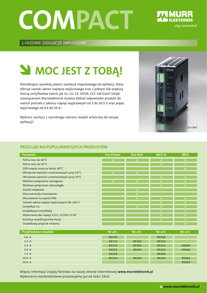 COMPACT 1-FAZOWE ZASILACZE IMPULSOWE Moc jest z Tobą! Potrzebujesz wysokiej jakości zasilacza impulsowego do aplikacji, który oferuje szeroki zakres napięcia wejściowego oraz z jednym lub większą ilością certyfikatów takich jak UL, GL, CE, ODVA, CCC lub Gost? Dzięki rozwiązaniom Murrelektronik możesz dobrać odpowiedni produkt do swoich potrzeb z zakresu napięć wyjściowych od 5 do 30.5 V oraz prądu wyjściowego od 0.6 do 20 A. Wybierz zasilacz z szerokiego zakresu modeli właściwy do swojej aplikacji! Eco-Rail PRZEGLĄD NAJPOPULARNIEJSZYCH PRODUKTÓW Parametr Eco PowerEco Rail MCS x x x Pełna moc do 55°C x x 20% więcej mocy w temp. 40°C x Pełna moc do 40°C Obniżenie wartości znamionowych przy 55°C x MCS-B x x x x x x x Możliwe połączenie równoległe x x Obniżenie wartości znamionowych przy 70°C Możliwe połączenie szeregowe x Zaciski wtykowe x Dwa warianty mocowania x Mocowanie na szynie DIN x x x Szeroki zakres napięć wejściowych 90..265 V x x x x x Dodatkowe certyfikaty x x Wykonania dla napięć 5/12..15/30.5 V DC x x Korekcja współczynnika mocy x x Dodatkowy przycisk restartu x Certyfikat UL Przykładowe modele: Nr art. Nr art. Nr art. 0.6 A 85150 85160 1.3 A 85151 85301 85161 2.5 A 85152 85302 85162 5.0 A 85153 85303 85163 7.5 A 85154 85164 10.0 A 85155 85305 85165 20.0 A Nr art. 85064 85061 85062 85063 Więcej informacji znajdą Państwo na naszej stronie internetowej www.murrelektronik.pl Wykonania niestandardowe produkujemy już od ilości 10szt. ÔÔ www.murrelektronik.pl COMPACT Zasilacze impulsowe mogą współpracować z następującymi urządzeniami: MB Diode – profilaktyka nieplanowanych przestojów MB Diode odseparowuje i uniezależnia poszczególne źródła zasilania. Zapewnia w przypadku awarii jednego zasilacza automatyczne i bezprzerwowe włączenie zasilania rezerwowego bez zakłócenia toku produkcji. • Kompaktowa obudowa; • Sygnalizacja diodami LED na każdym kanale; • Informacja o awarii poprzez zintegrowane styki bezpośrednio do PLC. MB Cap i MB Cap Ultra – proste i bezpieczne buforowanie Moduły buforowe spełniające wszystkie wymagania przemysłowe i komercyjne zasilaczy 24 V DC! • Bezobsługowe – brak kosztów eksploatacyjnych dzięki zastosowaniu kondensatorów zamiast akumulatorów; • Odporne na prawie wszystkie rodzaje zakłóceń w sieci zasilającej; • Styki pomocnicze do sygnalizacji stanu modułu umożliwiające połączenie z systemem nadzorującym; • Interfejs USB do ustawienia parametrów wyłączania urządzeń (poprzez oprogramowanie MB Cap Ultra Control Software). MICO – inteligentna dystrybucja prądu • Monitorowanie prądów, sygnalizacja po osiągnięciu 90% prądu znamionowego. Zakres prądowy ustawiany skokowo na każdym kanale; • Każdy kanał posiada możliwość manualnego restartu lub odłączenia; • Przełączanie obciążeń pojemnościowych do 20000µF na kanał; • Zaciski sprężynowe; • Sprawdzony system mostków łączeniowych; • Certyfikat cCSAus. MODUŁY IBUFOROWE I REDUNDANTNE (Napięcie wejściowe 24 V DC) mb cap MB CAP ULTRA Modele 85394 (200 ms / 20 A) 85467 (10 A/38 s) Model 85468 (20 A/16 s) Model 85460 (3 A/7 s) Model 85462 (Moduł rozsz.) mb diode 85396 (2x20 A oraz 1x 40 A) mico (24 V DC) 2 kanały Modele 4 kanały Modele mico 2.4 (1 A/2 A/3 A/4 A) 9000-41042-0100400 MICO 4.4 (1 A/2 A/ 3A/4 A) 9000-41034-0100400 mico 2.6 (1 A/2 A/4 A/6 A)mico 2.10 (4 A/6 A/8 A/10 A) 9000-41042-0100600 9000-41042-0401000 mico 4.6 (1 A/2 A/4 A/6 A)mico 4.10 (4 A/6 A/8 A/10 A) 9000-41034-0100600 9000-41034-0401000 ÔÔ www.murrelektronik.pl