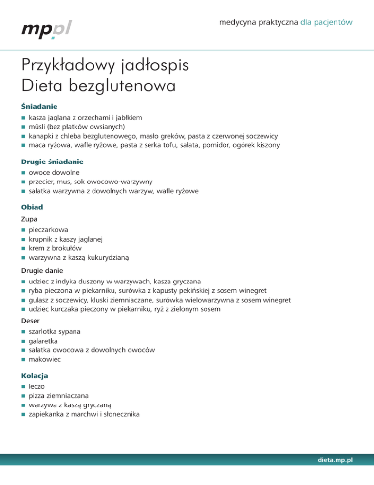 medycyna praktyczna dla pacjentów Przykładowy jadłospis Dieta bezglutenowa Śniadanie kasza jaglana z orzechami i jabłkiem müsli (bez płatków owsianych) kanapki z chleba bezglutenowego, masło greków, pasta z czerwonej soczewicy maca ryżowa, wafle ryżowe, pasta z serka tofu, sałata, pomidor, ogórek kiszony Drugie śniadanie owoce dowolne przecier, mus, sok owocowo-warzywny sałatka warzywna z dowolnych warzyw, wafle ryżowe Obiad Zupa pieczarkowa krupnik z kaszy jaglanej krem z brokułów warzywna z kaszą kukurydzianą Drugie danie udziec z indyka duszony w warzywach, kasza gryczana ryba pieczona w piekarniku, surówka z kapusty pekińskiej z sosem winegret gulasz z soczewicy, kluski ziemniaczane, surówka wielowarzywna z sosem winegret udziec kurczaka pieczony w piekarniku, ryż z zielonym sosem Deser szarlotka sypana galaretka sałatka owocowa z dowolnych owoców makowiec Kolacja leczo pizza ziemniaczana warzywa z kaszą gryczaną zapiekanka z marchwi i słonecznika dieta.mp.pl