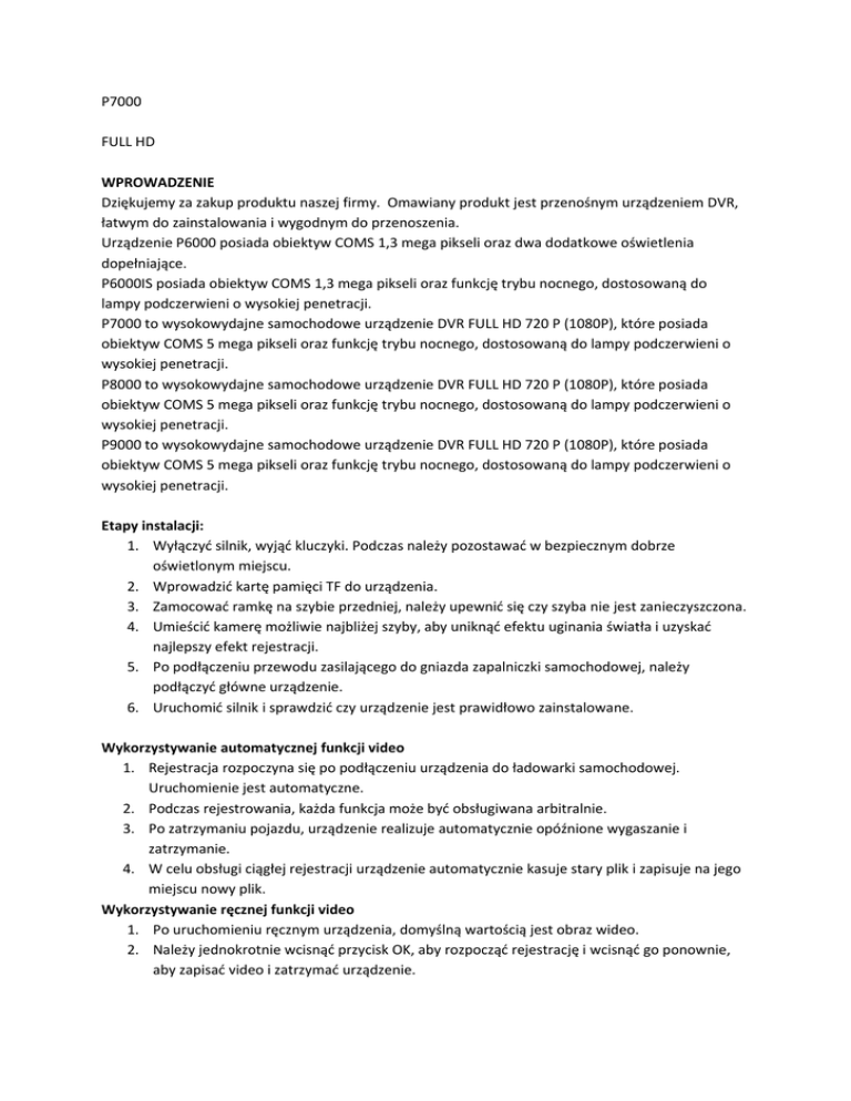 P7000 FULL HD WPROWADZENIE Dziękujemy za zakup produktu naszej firmy. Omawiany produkt jest przenośnym urządzeniem DVR, łatwym do zainstalowania i wygodnym do przenoszenia. Urządzenie P6000 posiada obiektyw COMS 1,3 mega pikseli oraz dwa dodatkowe oświetlenia dopełniające. P6000IS posiada obiektyw COMS 1,3 mega pikseli oraz funkcję trybu nocnego, dostosowaną do lampy podczerwieni o wysokiej penetracji. P7000 to wysokowydajne samochodowe urządzenie DVR FULL HD 720 P (1080P), które posiada obiektyw COMS 5 mega pikseli oraz funkcję trybu nocnego, dostosowaną do lampy podczerwieni o wysokiej penetracji. P8000 to wysokowydajne samochodowe urządzenie DVR FULL HD 720 P (1080P), które posiada obiektyw COMS 5 mega pikseli oraz funkcję trybu nocnego, dostosowaną do lampy podczerwieni o wysokiej penetracji. P9000 to wysokowydajne samochodowe urządzenie DVR FULL HD 720 P (1080P), które posiada obiektyw COMS 5 mega pikseli oraz funkcję trybu nocnego, dostosowaną do lampy podczerwieni o wysokiej penetracji. Etapy instalacji: 1. Wyłączyć silnik, wyjąć kluczyki. Podczas należy pozostawać w bezpiecznym dobrze oświetlonym miejscu. 2. Wprowadzić kartę pamięci TF do urządzenia. 3. Zamocować ramkę na szybie przedniej, należy upewnić się czy szyba nie jest zanieczyszczona. 4. Umieścić kamerę możliwie najbliżej szyby, aby uniknąć efektu uginania światła i uzyskać najlepszy efekt rejestracji. 5. Po podłączeniu przewodu zasilającego do gniazda zapalniczki samochodowej, należy podłączyć główne urządzenie. 6. Uruchomić silnik i sprawdzić czy urządzenie jest prawidłowo zainstalowane. Wykorzystywanie automatycznej funkcji video 1. Rejestracja rozpoczyna się po podłączeniu urządzenia do ładowarki samochodowej. Uruchomienie jest automatyczne. 2. Podczas rejestrowania, każda funkcja może być obsługiwana arbitralnie. 3. Po zatrzymaniu pojazdu, urządzenie realizuje automatycznie opóźnione wygaszanie i zatrzymanie. 4. W celu obsługi ciągłej rejestracji urządzenie automatycznie kasuje stary plik i zapisuje na jego miejscu nowy plik. Wykorzystywanie ręcznej funkcji video 1. Po uruchomieniu ręcznym urządzenia, domyślną wartością jest obraz wideo. 2. Należy jednokrotnie wcisnąć przycisk OK, aby rozpocząć rejestrację i wcisnąć go ponownie, aby zapisać video i zatrzymać urządzenie. 3. Podczas rejestrowania, należy wcisnąć jednokrotnie przycisk MODE, po czym plik SOS zostanie zabezpieczony 4. W trybie obrazu video, należy wcisnąć MENU, aby uzyskać dostęp do menu ustawień 5. W menu ustawień, w celu dokonania wyboru należy wciskać przyciski Up <w górę> i Down <W dół> i potwierdzić wybór przyciskiem OK 6. Gdy rozdzielczość obrazu jest większa niż 1280 x 729, nie ma możliwości użycia cyfrowego zoomu. Wykorzystywanie funkcji kamery 1. Po uruchomieniu, należy jednokrotnie wcisnąć przycisk MODE, następnie można wykonać zdjęcie. 2. Przycisk OK jest przyciskiem przesłony, w związku z tym można wykonać zdjęcie naciskając go jednokrotnie. 3. W trybie obrazu kamery należy wcisnąć przycisk MENU aby wejść do menu ustawień. 4. W menu ustawień, w celu dokonania wyboru należy wciskać przyciski Up <w górę> i Down <W dół> i potwierdzić wybór przyciskiem OK Wykorzystywanie funkcji odtwarzania 1. Po uruchomieniu urządzenia, należy wcisnąć przycisk MODE dwukrotnie aby uzyskać dostęp do funkcji odtwarzania. 2. Wszystkie zdjęcia i video znajdują się w pliku 3. Należy posługiwać się przyciskami Up i Down aby wybrać dany plik i wcisnąć przycisk OK w celu odtworzenia. 4. Po wciśnięciu przycisku MENU, pojawią się usuwane obrazy. Ustawianie systemu 1. Należy wcisnąć przycisk MENU w trybie video (jeśli nie ma rejestracji) 2. Wcisnąć przycisk OK ponownie, aby uzyskać dostęp do menu systemu Funkcja wyjścia obrazu 1. Należy podłączyć linię transmisji HDMI, gdy zasilanie jest włączone, lub przejść do trybu odtwarzania. 2. Obrazy mogą być transmitowane do TV Funkcja awaryjnego zapisywania 1. Wcisnąć przycisk MODE podczas rejestrowania 2. Zostanie wyświetlony symbol blokady 3. Oznacza on, że aktualnie rejestrowane pliki będą chronione. 4. Po zabezpieczeniu zawartości karty nie będzie możliwości usunięcia plików poprzez cyklicznie rejestrowany obraz video. 5. Prosimy zauważyć, że pliki będą usuwane, jeśli przyjęto format. Diagnostyka i usuwanie usterek 1. Urządzenie nie może zostać uruchomione – prosimy sprawdzić czy urządzenie jest całkowicie naładowane. 2. Jeśli zapis zatrzymuje się podczas odtwarzania, prosimy o sprawdzenie czy karta pamięci jest kartą klasy 6 lub wyższej. 3. Jeśli nie ma możliwości zapisu cyklicznego, prosimy o sprawdzenie, czy pliki na karcie pamięci nie są chronione. 4. Urządzenie nie może zostać uruchomione po podłączeniu do gniazda zapalniczki samochodowej. Prosimy o sprawdzenie czy ładowarka samochodowa jest wprowadzona do odpowiedniego gniazda zapalniczki P7000 Konstrukcja produktu 1 Dioda IR trybu nocnego 2 Obiektyw 3 Wskaźnik stanu zasilania 5 Mikrofon 6 Ekran LCD 10 Przycisk zasilania 11 MENU (funkcja) 12 Przycisk MODE 3 Gniazdo karty Micro SD 7 Głośnik 8 Wspornik montażowy 9 Przycisk Reset 13 OK 14 Przycisk Down 15 Przycisk Up 16 Interfejs USB/AVOUT 17 Interfejs HDMI Akcesoria produktu 1) Urządzenie główne 2) Ładowarka samochodowa 3) Linia transmisji USB 4) specjalna linia transmisji HDMI tylko dla TV (opcjonalna) 5) Podręcznik użytkownika 6) Ramka montażowa 7) Karta pamięci TF (opcjonalną) Przy zakupie produktu należy sprawdzić kompletność akcesoriów Pełne Menu funkcji HD oraz ustawień systemu Tryb Menu Wybór ustawienia U Obraz Wielkość 1920x1080/1440x1080/1280x720/8 s 48x480 EV EV-2 – EV+2 t a Audio Wł/Wył w a Balans bieli Automatyczny/oświetlenie i fluorescencyjne /żarówką n wolframowa/dzień pochmurny/ i dzień słoneczny e Kontrast Standardowy/słaby/wysoki o b r a z u 