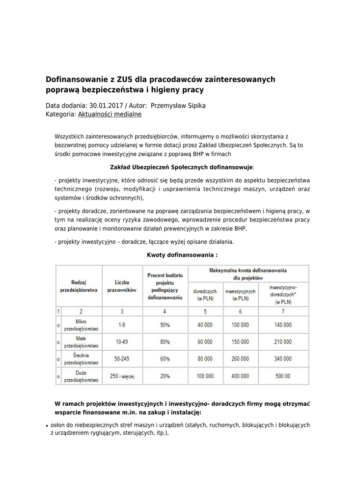 Dofinansowanie z ZUS dla pracodawców zainteresowanych poprawą bezpieczeństwa i higieny pracy Data dodania: 30.01.2017 / Autor: Przemysław Sipika Kategoria: Aktualności medialne Wszystkich zainteresowanych przedsiębiorców, informujemy o możliwości skorzystania z bezzwrotnej pomocy udzielanej w formie dotacji przez Zakład Ubezpieczeń Społecznych. Są to środki pomocowe inwestycyjne związane z poprawą BHP w firmach Zakład Ubezpieczeń Społecznych dofinansowuje: - projekty inwestycyjne, które odnosić się będą przede wszystkim do aspektu bezpieczeństwa technicznego (rozwoju, modyfikacji i usprawnienia technicznego maszyn, urządzeń oraz systemów i środków ochronnych), - projekty doradcze, zorientowane na poprawę zarządzania bezpieczeństwem i higieną pracy, w tym na realizację oceny ryzyka zawodowego, wprowadzenie procedur bezpieczeństwa pracy oraz planowanie i monitorowanie działań prewencyjnych w zakresie BHP, - projekty inwestycyjno – doradcze, łączące wyżej opisane działania. Kwoty dofinansowania : W ramach projektów inwestycyjnych i inwestycyjno- doradczych firmy mogą otrzymać wsparcie finansowane m.in. na zakup i instalację: ● osłon do niebezpiecznych stref maszyn i urządzeń (stałych, ruchomych, blokujących i blokujących z urządzeniem ryglującym, sterujących, itp.), ● ● ● ● ● ● ● ● ● ● ● urządzeń ochronnych czułych na nacisk (mat, podłóg, obrzeży, krawędzi, itp., odnoszących się bezpośrednio do maszyn), elementów systemów sterowania realizujących funkcje bezpieczeństwa (oburęcznych urządzeń sterujących, urządzeń blokujących zezwalających, wyłączników krańcowych, urządzeń sterujących krokowych, urządzeń wyłączania awaryjnego, itp., odnoszących się bezpośrednio do maszyn), urządzeń i elementów sygnalizacji, ostrzegania i informacji o zagrożeniach, wyrobów i ustrojów przeciw-drganiowych (wibroizolatorów, amortyzatorów itp.), neutralizatorów elektryczności statycznej, urządzeń oczyszczających i uzdatniających powietrze (np.: filtrów, filtropochłaniaczy, itp.), urządzeń i elementów wentylacji miejscowej wywiewnej oraz nawiewnej (obudowy, okapy, ssawki, itp.), urządzeń i elementów wentylacji ogólnej nawiewno-wywiewnej, maszyn i urządzeń służących poprawie bezpieczeństwa prac na wysokości, np. podesty stacjonarne oraz rusztowania ruchome (przejezdne), podesty ruchome (wiszące, masztowe, stacjonarne), podesty ruchome przejezdne (wolnobieżne, samojezdne mocowane na pojeździe oraz przewoźne). urządzeń (bez własnego napędu / nie samojezdnych) służących ograniczeniu obciążenia układu mięśniowo-szkieletowego przy pracach ręcznych związanych z przemieszczaniem przedmiotów, ładunków lub materiałów np. ręczne wózki paletowe, wózki magazynowe, ręczne wózki platformowe dwunożycowe, wciągniki i żurawiki do 450 kg, wózków jezdniowych podnośnikowych i innych urządzeń samojezdnych służących ograniczeniu obciążenia układu mięśniowo-szkieletowego. W ramach projektów doradczych firmy mogą otrzymać wsparcie finansowane m.in. na: 1. Identyfikację zagrożeń w miejscu pracy i ocenę ryzyka zawodowego związanego z tymi zagrożeniami, 2. Wykonanie pomiarów stężeń i natężeń czynników szkodliwych i uciążliwych, występujących w miejscu pracy, takich jak: ● ● ● ● czynniki chemiczne i pyły, czynniki biologiczne, czynniki fizyczne (hałas, ogólne i miejscowe drgania, pole i promieniowanie elektromagnetyczne, promieniowanie optyczne, mikroklimat, itp.), czynniki uciążliwe (oświetlenie, nadmierne obciążenie wysiłkiem fizycznym dynamicznym i/lub statycznym, itp.). 1. Dokonanie doboru środków ochrony indywidualnej do zidentyfikowanych zagrożeń (bez uwzględniania kosztów zakupu tych środków), 2. Przeprowadzenie analizy i oceny ergonomiczności miejsc pracy, które muszą oddziaływać na poprawę ergonomii stanowisk pracy, 3. Wykonanie oceny bezpieczeństwa maszyn i instalacji technicznych, 4. Opracowanie projektów technicznych środków ochrony zbiorowej, 5. Opracowanie projektów technicznych instalacji sprzętu ochronnego na stanowiskach pracy. Jeśli Państwo są zainteresowani współpracą z Krajowym Stowarzyszeniem Wsparcia Przedsiębiorczości zapraszamy do odwiedzenia Naszych Biur oraz kontaktu z doradcami, którzy udzielą szczegółowych informacji. Telefon: 41 375 14 55 lub 41 260 46 61 e-mail: [email protected] lub [email protected] Informacje dotyczące konkursu dofinansowania z ZUS można znaleźć również na stronie internetowej www.zus.pl.
