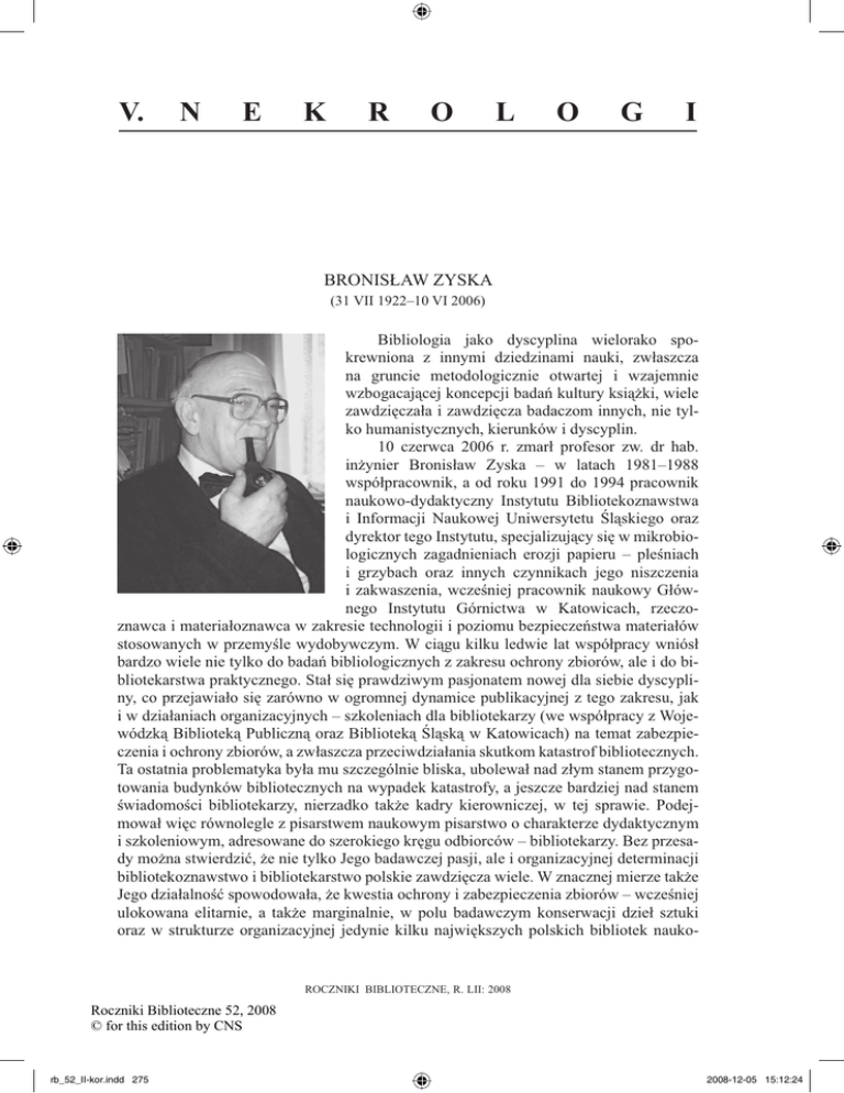 V. N E K R O L O G I BRONISŁAW ZYSKA (31 VII 1922–10 VI 2006) Bibliologia jako dyscyplina wielorako spokrewniona z innymi dziedzinami nauki, zwłaszcza na gruncie metodologicznie otwartej i wzajemnie wzbogacającej koncepcji badań kultury książki, wiele zawdzięczała i zawdzięcza badaczom innych, nie tylko humanistycznych, kierunków i dyscyplin. 10 czerwca 2006 r. zmarł profesor zw. dr hab. inżynier Bronisław Zyska – w latach 1981–1988 współpracownik, a od roku 1991 do 1994 pracownik naukowo-dydaktyczny Instytutu Bibliotekoznawstwa i Informacji Naukowej Uniwersytetu Śląskiego oraz dyrektor tego Instytutu, specjalizujący się w mikrobiologicznych zagadnieniach erozji papieru – pleśniach i grzybach oraz innych czynnikach jego niszczenia i zakwaszenia, wcześniej pracownik naukowy Głównego Instytutu Górnictwa w Katowicach, rzeczoznawca i materiałoznawca w zakresie technologii i poziomu bezpieczeństwa materiałów stosowanych w przemyśle wydobywczym. W ciągu kilku ledwie lat współpracy wniósł bardzo wiele nie tylko do badań bibliologicznych z zakresu ochrony zbiorów, ale i do bibliotekarstwa praktycznego. Stał się prawdziwym pasjonatem nowej dla siebie dyscypliny, co przejawiało się zarówno w ogromnej dynamice publikacyjnej z tego zakresu, jak i w działaniach organizacyjnych – szkoleniach dla bibliotekarzy (we współpracy z Wojewódzką Biblioteką Publiczną oraz Biblioteką Śląską w Katowicach) na temat zabezpieczenia i ochrony zbiorów, a zwłaszcza przeciwdziałania skutkom katastrof bibliotecznych. Ta ostatnia problematyka była mu szczególnie bliska, ubolewał nad złym stanem przygotowania budynków bibliotecznych na wypadek katastrofy, a jeszcze bardziej nad stanem świadomości bibliotekarzy, nierzadko także kadry kierowniczej, w tej sprawie. Podejmował więc równolegle z pisarstwem naukowym pisarstwo o charakterze dydaktycznym i szkoleniowym, adresowane do szerokiego kręgu odbiorców – bibliotekarzy. Bez przesady można stwierdzić, że nie tylko Jego badawczej pasji, ale i organizacyjnej determinacji bibliotekoznawstwo i bibliotekarstwo polskie zawdzięcza wiele. W znacznej mierze także Jego działalność spowodowała, że kwestia ochrony i zabezpieczenia zbiorów – wcześniej ulokowana elitarnie, a także marginalnie, w polu badawczym konserwacji dzieł sztuki oraz w strukturze organizacyjnej jedynie kilku największych polskich bibliotek nauko- ROCZNIKI BIBLIOTECZNE, R. LII: 2008 Roczniki Biblioteczne 52, 2008 © for this edition by CNS rb_52_II-kor.indd 275 2008-12-05 15:12:24 276 NEKROLOGI wych – stała się przedmiotem badań również na gruncie bibliotekoznawstwa, a przede wszystkim, że spopularyzowana, znalazła powszechne zastosowanie w bibliotekarstwie polskim, zwłaszcza publicznym1, czego rezultatem było powoływanie agend odpowiedzialnych za ochronę i konserwację zbiorów oraz szkolenia bibliotekarzy, przede wszystkim kadry kierowniczej, w tym zakresie. Bronisław Zyska urodził się 31 sierpnia 1924 r. w polskiej, patriotycznej rodzinie2 Emanuela Zyski, państwowego urzędnika stanu cywilnego i Marii Antoniny z Korpusów w Wielkich Hajdukach, dzielnicy Królewskiej Huty, przedwojennego Chorzowa. W licznych, także oficjalnych, okolicznościach późniejszy badacz i profesor zawsze akcentował swój narodowy i lokalny, śląski, patriotyzm, a Chorzów pozostał dla niego miastem ponad wszystkie. W latach 1936–1939 był uczniem Państwowego Gimnazjum im Odrowążów w Chorzowie3. Lata wojny i okupacji rzuciły go m.in. do Kankelau pod Hamburgiem, gdzie pracował jako robotnik przymusowy (1939–1940), oraz do obozów UNRRA w Landsbergu i Schongau. Edukację na poziomie średnim, przerwaną wybuchem wojny po 3. klasie gimnazjalnej nauki, ukończył dopiero po wojnie, w roku 1947, uzyskując maturę w Państwowym Koedukacyjnym Gimnazjum i Liceum Ogólnokształcącym dla Dorosłych w Katowicach. Studia na Wydziale Rolniczo-Leśnym Uniwersytetu Poznańskiego w latach 1947– 1951 zwieńczył uzyskaniem dyplomu inżyniera leśnictwa i magistra nauk agrotechnicznych na podstawie pracy dyplomowej Grzyby Kopalni Węgla Kamiennego „Mysłowice” i szkody przez nie wywoływane przygotowanej pod kierunkiem znanego mikologa i fitopatologa prof. Karola Zaleskiego. Wyznaczyła ona kierunek całej jego przyszłej karierze naukowej. Miejscem, gdzie postępował jego naukowy rozwój, stał się Główny Instytut Górnictwa (GIG), instytucja, której pozostał wierny przez 40 lat (1951–1990). Tam powołał Pracownię Drewna Kopalnianego, przekształconą później w Samodzielny Zakład Inżynierii Materiałowej, którym kierował aż do emerytury, tam uzyskiwał kolejno stanowiska adiunkta (1954), docenta (1973) oraz profesora nadzwyczajnego (1978). Badania tam prowadzone nad graniczną wartością grzybobójczą fluorokrzemianów w drewnie4 stały się podstawą uzyskania stopnia naukowego doktora nauk rolniczo-leśnych na Wydzia1 Bronisław ZYSKA, Zagrożenia dla zbiorów bibliotecznych u progu XXI wieku, [w:] Ochrona Narodowego Zasobu Bibliotecznego, materiały i dokumenty ze szkolenia dyrektorów bibliotek, których zbiory w całości lub części tworzą Narodowy Zasób Biblioteczny. Kraków, kwiecień 2001. Ochrona Narodowego Zasobu Bibliotecznego. Red. K. SAŁACIŃSKI, Warszawa: SBP 2001, s. 15– 24. Referaty na temat ochrony zbiorów bibliotecznych wygłaszał również w Centrum Szkolenia Pożarnictwa w Krakowie w ramach szkolenia organizowanego przez Ministerstwo Kultury i Dziedzictwa Narodowego (13 i 20 XI 2000). 2 Dziadek, Jan Korpus, był długoletnim działaczem Zjednoczenia Zawodowego Polskiego w Bochum i Królewskiej Hucie, związkowej i narodowej organizacji robotniczej, ojciec zaś współzałożycielem Stowarzyszenia Miłośników Chorzowa. Prof. Bronisław Zyska przewodniczył temu Stowarzyszeniu w latach 1971–1977. 3 Zob. Wspomnienie przedwojennego gimnazjalisty z lat 1936–1939, [w:] Księg
