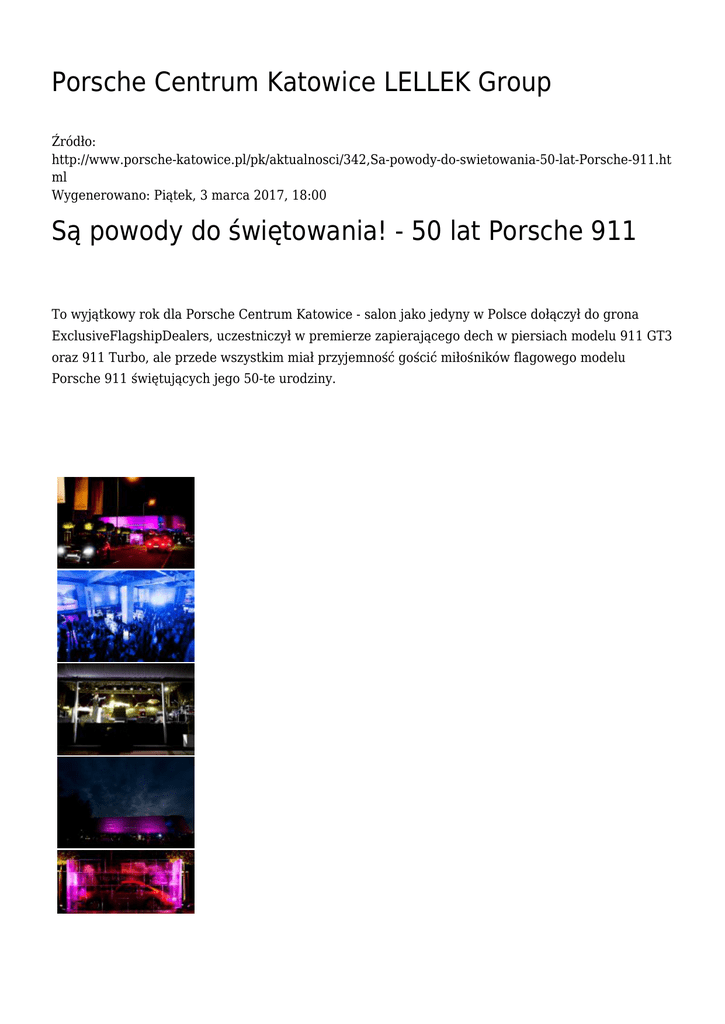 Porsche Centrum Katowice LELLEK Group Źródło: http://www.porsche-katowice.pl/pk/aktualnosci/342,Sa-powody-do-swietowania-50-lat-Porsche-911.ht ml Wygenerowano: Piątek, 3 marca 2017, 18:00 Są powody do świętowania! - 50 lat Porsche 911 To wyjątkowy rok dla Porsche Centrum Katowice - salon jako jedyny w Polsce dołączył do grona ExclusiveFlagshipDealers, uczestniczył w premierze zapierającego dech w piersiach modelu 911 GT3 oraz 911 Turbo, ale przede wszystkim miał przyjemność gościć miłośników flagowego modelu Porsche 911 świętujących jego 50-te urodziny. Tweetnij