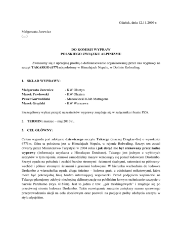 Gdańsk, dnia 12.11.2009 r. Małgorzata Jurewicz (…) DO KOMISJI WYPRAW POLSKIEGO ZWIĄZKU ALPINIZMU Zwracamy się z uprzejmą prośbą o dofinansowanie organizowanej przez nas wyprawy na szczyt TAKARGO (6771m) połoŜony w Himalajach Nepalu, w Dolinie Rolwaling. 1. SKŁAD WYPRAWY: Małgorzata Jurewicz Marek Pawłowski Paweł Garwoliński Marek Grądzki - KW Olsztyn - KW Olsztyn - Mazowiecki Klub Matragona - KW Warszawa Szczegółowy wykaz przejść uczestników wyprawy znajduje się w załączniku i bazie PZA. 2. TERMIN: marzec – maj 2010 r., 3. CEL GŁÓWNY: Celem wyjazdu jest zdobycie dziewiczego szczytu Takargo (inaczej Dragkar-Go) o wysokości 6771m. Góra ta połoŜona jest w Himalajach Nepalu, w rejonie Rolwaling. Szczyt ten został otwarty przez Ministerstwo Turystyki w 2004 roku i jak dotąd nie był atakowany przez Ŝadne wyprawy (informacja uzyskana z Himalayan Database). Takargo jest jednym z wybitnych szczytów w tym rejonie, stanowi samodzielny masyw wznoszący się ponad lodowcem Drolambo. Szczyt opada na południe i zachód bardzo stromymi ścianami skalnymi, natomiast na pólnocnywschód i północ stromymi ścianami i graniami lodowymi. W kierunku wschodnim do lodowca Drolambo z wierzchołka opada długa śnieŜno – lodowa grań, z odcinkami mikstowymi, która moŜe być potencjalną linią bardzo interesującej wspinaczki. Przed podjęciem wspinaczki na Takargo planujemy zdobyć niezbędną aklimatyzację na pobliskim łatwym technicznie szczycie o nazwie Parchamo (wys. 6187m). Jest to jedna z tzw. „gór trekkingowych” i znajduje się po przeciwnej stronie lodowca Drolambo. Takie rozwiązanie znacznie zwiększy szanse sprawnego przeprowadzenia akcji na celu docelowym oraz pozwoli na podjęcie próby zdobycia szczytu w stylu alpejskim. 4. DOKUMENTACJA FOTOGRAFICZNA: Na zdjęciu Takargo widziane z okolic Parchamo, widoczna grań wschodnia. zdjęcie lotnicze od południa, Takargo z lewej strony zdjęcia 5. CELE REZERWOWE: W razie nie pozyskania wystarczających środków finansowych, planujemy działalność w rejonie Khumbu. Naszymi celami były by w tym przypadku szczyty: Cholatse (6440 m, zachodnią, bądź trudniejszym zachodnim Ŝebrem) lub Kusum Kanguru (6367 m, granią północną) a jako cel aklimatyzacyjny Kyajo Ri (wys.6.186m). Szczyty te pomimo, Ŝe wpisane są na listę szczytów trekingowych są wymagające technicznie i prawdopodobnie nie posiadają polskich wejść. Cholatse – na prawo płd-wsch. grań Kusum Kanguru, po lewej północna grań 6. KOSZTORYS: Przelot + cargo Ubezpieczenie WyŜywienie + gaz Zakup dodatkowego sprzętu Opłata za pozwolenie wyposaŜenie bazy, transport, karawana do/z bazy - 14.000 PLN - 2.000 PLN - 2.000 PLN - 6.000 PLN - 6.000 PLN - 18.000 PLN Łączny koszt wyjazdu: 48.000 PLN/ 4 osoby 7. ZASADY DOFINANSOWANIA: udział własny: 32.000/4 osoby PZA: 16.000 PLN/4 osoby 8. DOTYCHCZASOWE DOFINANSOWANIA: 2005r. - wyprawa na dziewiczy szczyt T2 w Himalajach Lahul (udział brali Marek Pawłowski i Paweł Garwoliński) 2009r. – Kaukaz, wyprawa unifikacyjna (Marek Grądzki) Z taternickim pozdrowieniem, Małgorzata Jurewicz