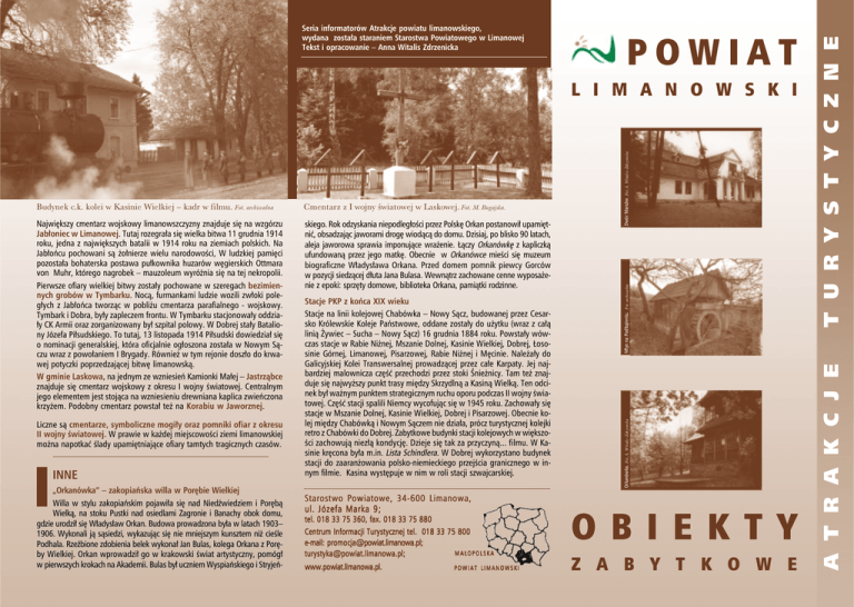 Pierwsze ofiary wielkiej bitwy zostały pochowane w szeregach bezimiennych grobów w Tymbarku. Nocą, furmankami ludzie wozili zwłoki poległych z Jabłońca tworząc w pobliżu cmentarza parafialnego - wojskowy. Tymbark i Dobra, były zapleczem frontu. W Tymbarku stacjonowały oddziały CK Armii oraz zorganizowany był szpital polowy. W Dobrej stały Bataliony Józefa Piłsudskiego. To tutaj, 13 listopada 1914 Piłsudski dowiedział się o nominacji generalskiej, która oficjalnie ogłoszona została w Nowym Sączu wraz z powołaniem I Brygady. Również w tym rejonie doszło do krwawej potyczki poprzedzającej bitwę limanowską. W gminie Laskowa, na jednym ze wzniesień Kamionki Małej – Jastrząbce znajduje się cmentarz wojskowy z okresu I wojny światowej. Centralnym jego elementem jest stojąca na wzniesieniu drewniana kaplica zwieńczona krzyżem. Podobny cmentarz powstał też na Korabiu w Jaworznej. Liczne są cmentarze, symboliczne mogiły oraz pomniki ofiar z okresu II wojny światowej. W prawie w każdej miejscowości ziemi limanowskiej można napotkać ślady upamiętniające ofiary tamtych tragicznych czasów. INNE „Orkanówka” – zakopiańska willa w Porębie Wielkiej Willa w stylu zakopiańskim pojawiła się nad Niedźwiedziem i Porębą Wielką, na stoku Pustki nad osiedlami Zagronie i Banachy obok domu, gdzie urodził się Władysław Orkan. Budowa prowadzona była w latach 1903– 1906. Wykonali ją sąsiedzi, wykazując się nie mniejszym kunsztem niż cieśle Podhala. Rzeźbione zdobienia belek wykonał Jan Bulas, kolega Orkana z Poręby Wielkiej. Orkan wprowadził go w krakowski świat artystyczny, pomógł w pierwszych krokach na Akademii. Bulas był uczniem Wyspiańskiego i Stryjeń- skiego. Rok odzyskania niepodległości przez Polskę Orkan postanowił upamiętnić, obsadzając jaworami drogę wiodącą do domu. Dzisiaj, po blisko 90 latach, aleja jaworowa sprawia imponujące wrażenie. Łączy Orkanówkę z kapliczką ufundowaną przez jego matkę. Obecnie w Orkanówce mieści się muzeum biograficzne Władysława Orkana. Przed domem pomnik piewcy Gorców w pozycji siedzącej dłuta Jana Bulasa. Wewnątrz zachowane cenne wyposażenie z epoki: sprzęty domowe, biblioteka Orkana, pamiątki rodzinne. Stacje PKP z końca XIX wieku Stacje na linii kolejowej Chabówka – Nowy Sącz, budowanej przez Cesarsko Królewskie Koleje Państwowe, oddane zostały do użytku (wraz z całą linią Żywiec – Sucha – Nowy Sącz) 16 grudnia 1884 roku. Powstały wówczas stacje w Rabie Niżnej, Mszanie Dolnej, Kasinie Wielkiej, Dobrej, Łososinie Górnej, Limanowej, Pisarzowej, Rabie Niżnej i Męcinie. Należały do Galicyjskiej Kolei Transwersalnej prowadzącej przez całe Karpaty. Jej najbardziej malownicza część przechodzi przez stoki Śnieżnicy. Tam też znajduje się najwyższy punkt trasy między Skrzydlną a Kasiną Wielką. Ten odcinek był ważnym punktem strategicznym ruchu oporu podczas II wojny światowej. Część stacji spalili Niemcy wycofując się w 1945 roku. Zachowały się stacje w Mszanie Dolnej, Kasinie Wielkiej, Dobrej i Pisarzowej. Obecnie kolej między Chabówką i Nowym Sączem nie działa, prócz turystycznej kolejki retro z Chabówki do Dobrej. Zabytkowe budynki stacji kolejowych w większości zachowują niezłą kondycję. Dzieje się tak za przyczyną... filmu. W Kasinie kręcona była m.in. Lista Schindlera. W Dobrej wykorzystano budynek stacji do zaaranżowania polsko-niemieckiego przejścia granicznego w innym filmie. Kasina występuje w nim w roli stacji szwajcarskiej. Starostwo Powiatowe, 34-600 Limanowa, ul. Józefa Marka 9; tel. 018 33 75 360, fax. 018 33 75 880 Centrum Informacji Turystycznej tel. 018 33 75 800 e-mail: promocja @powiat.limanowa.pl; [email protected]; MAŁOPOLSKA turystyka @powiat.limanowa.pl; [email protected]; www.powiat.limanowa.pl www.powiat.limanowa.pl.. POWIAT LIMANOWSKI Fot. archiwalna Największy cmentarz wojskowy limanowszczyzny znajduje się na wzgórzu Jabłoniec w Limanowej. Tutaj rozegrała się wielka bitwa 11 grudnia 1914 roku, jedna z największych batalii w 1914 roku na ziemiach polskich. Na Jabłońcu pochowani są żołnierze wielu narodowości, W ludzkiej pamięci pozostała bohaterska postawa pułkownika huzarów węgierskich Ottmara von Muhr, którego nagrobek – mauzoleum wyróżnia się na tej nekropolii. Cmentarz z I wojny światowej w Laskowej. Fot. M. Bugajska. Młyn na Podłopieniu. Fot. archiwalna KASINA WIELKA Orkanówka. Fot. A. Witalis–Zdrzenicka Budynek c.k. kolei w Kasinie Wielkiej – kadr w filmu. Dwór Marsów. Fot. A. Witalis–Zdrzenicka L I M A N O W S K I T U R Y S T Y C Z N E POWIAT O B I E K T Y Z A B Y T K O W E A T R A K C J E Seria informatorów Atrakcje powiatu limanowskiego, wydana została staraniem Starostwa Powiatowego w Limanowej Tekst i opracowanie – Anna Witalis Zdrzenicka Dwór w Laskowej z 1677 r. Fot. M. Bugajska Na małopolskim „Szlaku architektury drewnianej” w powiecie limanowskim spotykamy liczne dwory, zabudowania dworskie i wiejskie domy. Najstarsze pochodzą z XVI wieku, a nawet sięgają w stulecie XV. Zachowały się ponadto cenne zabytki murowane i murowano-drewniane. Stosunkowo liczne są barokowe, renesansowe, a nawet gotyckie malowidła ścienne i sztalugowe, polichromie oraz rzeźby. Zachowane dziedzictwo jest tym cenniejsze, że nie oszczędzały tych stron kataklizmy, takie jak liczne pożogi i powodzie, ani wojny, łącznie z obu światowymi. W rejonie Limanowej toczyły się zacięte bitwy 1914 roku, drastycznie, z licznymi pacyfikacjami, przebiegał wrzesień 1939, a także bitwy partyzanckie przez całą okupację. Walki pociągające za sobą zniszczenia prowadzono również w latach powojennych w ramach tzw. „utrwalania władzy ludowej”. DWORY, ZESPOŁY DWORSKIE (kolejność według okresu powstawania) Dwór z 1754 r. w Świdniku. Fot. archiwalna Murowany dwór z XVI/XVIII wieku w Skrzydlnej Kamienne, wysoko sklepione 