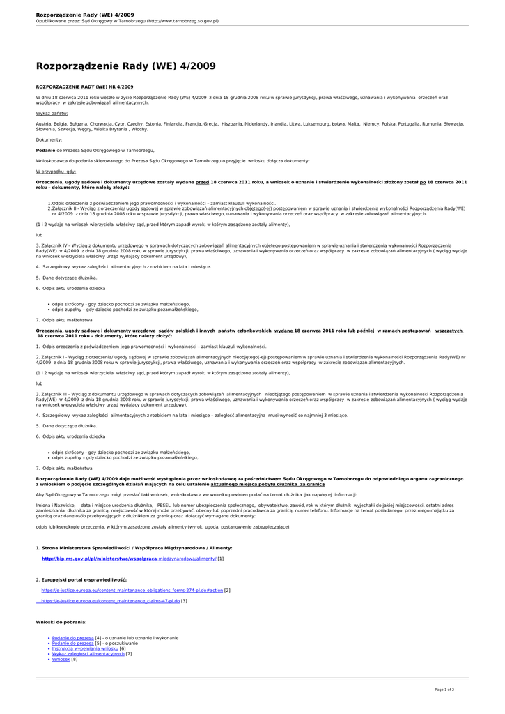 Rozporządzenie Rady (WE) 4/2009 Opublikowane przez: Sąd Okręgowy w Tarnobrzegu (http://www.tarnobrzeg.so.gov.pl) Rozporządzenie Rady (WE) 4/2009 ROZPORZĄDZENIE RADY (WE) NR 4/2009 W dniu 18 czerwca 2011 roku weszło w życie Rozporządzenie Rady (WE) 4/2009 z dnia 18 grudnia 2008 roku w sprawie jurysdykcji, prawa właściwego, uznawania i wykonywania orzeczeń oraz współpracy w zakresie zobowiązań alimentacyjnych. Wykaz państw: Austria, Belgia, Bułgaria, Chorwacja, Cypr, Czechy, Estonia, Finlandia, Francja, Grecja, Hiszpania, Niderlandy, Irlandia, Litwa, Luksemburg, Łotwa, Malta, Niemcy, Polska, Portugalia, Rumunia, Słowacja, Słowenia, Szwecja, Węgry, Wielka Brytania , Włochy. Dokumenty: Podanie do Prezesa Sądu Okręgowego w Tarnobrzegu, Wnioskodawca do podania skierowanego do Prezesa Sądu Okręgowego w Tarnobrzegu o przyjęcie wniosku dołącza dokumenty: W przypadku gdy: Orzeczenia, ugody sądowe i dokumenty urzędowe zostały wydane przed 18 czerwca 2011 roku, a wniosek o uznanie i stwierdzenie wykonalności złożony został po 18 czerwca 2011 roku – dokumenty, które należy złożyć: 1.Odpis orzeczenia z poświadczeniem jego prawomocności i wykonalności – zamiast klauzuli wykonalności. 2.Załącznik II - Wyciąg z orzeczenia/ ugody sądowej w sprawie zobowiązań alimentacyjnych objętego(-ej) postępowaniem w sprawie uznania i stwierdzenia wykonalności Rozporządzenia Rady(WE) nr 4/2009 z dnia 18 grudnia 2008 roku w sprawie jurysdykcji, prawa właściwego, uznawania i wykonywania orzeczeń oraz współpracy w zakresie zobowiązań alimentacyjnych. (1 i 2 wydaje na wniosek wierzyciela właściwy sąd, przed którym zapadł wyrok, w którym zasądzone zostały alimenty), lub 3. Załącznik IV – Wyciąg z dokumentu urzędowego w sprawach dotyczących zobowiązań alimentacyjnych objętego postępowaniem w sprawie uznania i stwierdzenia wykonalności Rozporządzenia Rady(WE) nr 4/2009 z dnia 18 grudnia 2008 roku w sprawie jurysdykcji, prawa właściwego, uznawania i wykonywania orzeczeń oraz współpracy w zakresie zobowiązań alimentacyjnych ( wyciąg wydaje na wniosek wierzyciela właściwy urząd wydający dokument urzędowy), 4. Szczegółowy wykaz zaległości alimentacyjnych z rozbiciem na lata i miesiące. 5. Dane dotyczące dłużnika. 6. Odpis aktu urodzenia dziecka odpis skrócony - gdy dziecko pochodzi ze związku małżeńskiego, odpis zupełny – gdy dziecko pochodzi ze związku pozamałżeńskiego, 7. Odpis aktu małżeństwa Orzeczenia, ugody sądowe i dokumenty urzędowe sądów polskich i innych państw członkowskich wydane 18 czerwca 2011 roku lub później w ramach postępowań 18 czerwca 2011 roku – dokumenty, które należy złożyć: wszczętych 1. Odpis orzeczenia z poświadczeniem jego prawomocności i wykonalności – zamiast klauzuli wykonalności. 2. Załącznik I - Wyciąg z orzeczenia/ ugody sądowej w sprawie zobowiązań alimentacyjnych nieobjętego(-ej) postępowaniem w sprawie uznania i stwierdzenia wykonalności Rozporządzenia Rady(WE) nr 4/2009 z dnia 18 grudnia 2008 roku w sprawie jurysdykcji, prawa właściwego, uznawania i wykonywania orzeczeń oraz współpracy w zakresie zobowiązań alimentacyjnych. (1 i 2 wydaje na wniosek wierzyciela właściwy sąd, przed którym zapadł wyrok, w którym zasądzone zostały alimenty), lub 3. Załącznik III – Wyciąg z dokumentu urzędowego w sprawach dotyczących zobowiązań alimentacyjnych nieobjętego postępowaniem w sprawie uznania i stwierdzenia wykonalności Rozporządzenia Rady(WE) nr 4/2009 z dnia 18 grudnia 2008 roku w sprawie jurysdykcji, prawa właściwego, uznawania i wykonywania orzeczeń oraz współpracy w zakresie zobowiązań alimentacyjnych ( wyciąg wydaje na wniosek wierzyciela właściwy urząd wydający dokument urzędowy), 4. Szczegółowy wykaz zaległości alimentacyjnych z rozbiciem na lata i miesiące – zaległość alimentacyjna musi wynosić co najmniej 3 miesiące. 5. Dane dotyczące dłużnika. 6. Odpis aktu urodzenia dziecka odpis skrócony - gdy dziecko pochodzi ze związku małżeńskiego, odpis zupełny – gdy dziecko pochodzi ze związku pozamałżeńskiego, 7. Odpis aktu małżeństwa. Rozporządzenie Rady (WE) 4/2009 daje możliwość wystąpienia przez wnioskodawcę za pośrednictwem Sądu Okręgowego w Tarnobrzegu do odpowiedniego organu zagranicznego z wnioskiem o podjęcie szczególnych działań mających na celu ustalenie aktualnego miejsca pobytu dłużnika za granicą Aby Sąd Okręgowy w Tarnobrzegu mógł przesłać taki wniosek, wnioskodawca we wniosku powinien podać na temat dłużnika jak najwięcej informacji: Imiona i Nazwisko, data i miejsce urodzenia dłużnika, PESEL lub numer ubezpieczenia społecznego, obywatelstwo, zawód, rok w którym dłużnik wyjechał i do jakiej miejscowości, ostatni adres zamieszkania dłużnika za granicą, miejscowość w której może przebywać, obecny lub poprzedni pracodawca za granicą, numer telefonu. Informacje na temat posiadanego przez niego majątku za granicą oraz dane osób przebywających z dłużnikiem za granicą oraz dołączyć wymagane dokumenty: odpis lub kserokopię orzeczenia, w którym zasądzone zostały alimenty (wyrok, ugoda, postanowienie zabezpieczające). 1. Strona Ministerstwa Sprawiedliwości / Współpraca Międzynarodowa / Alimenty: http://bip.ms.gov.pl/pl/ministerstwo/wspolpraca-miedzynarodowa/alimenty/ [1] 2. Europejski portal e-sprawiedliwość: https://e-justice.europa.eu/content_maintenance_obligations_forms-274-pl.do#action [2] https://e-justice.europa.eu/content_maintenance_claims-47-pl.do [3] Wnioski do pobrania: Podanie do prezesa [4] - o uznanie lub uznanie i wykonanie Podanie do prezesa [5] - o poszukiwanie Instrukcja wypełniania wniosku [6] Wykaz zaległości alimentacyjnych [7] Wniosek [8] Page 1 of 2 Rozporządzenie Rady (WE) 4/2009 Opublikowane przez: Sąd Okręgowy w Tarnobrzegu (http://www.tarnobrzeg.so.gov.pl) Halina Rojek b/d S