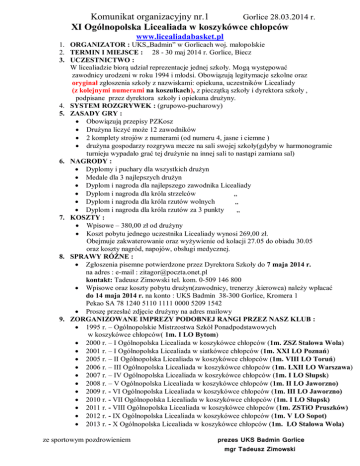 Komunikat organizacyjny nr.1 Gorlice 28.03.2014 r. XI Ogólnopolska Licealiada w koszykówce chłopców www.licealiadabasket.pl 1. ORGANIZATOR : UKS„Badmin” w Gorlicach woj. małopolskie 2. TERMIN I MIEJSCE : 28 - 30 maj 2014 r. Gorlice, Biecz 3. UCZESTNICTWO : W licealiadzie biorą udział reprezentacje jednej szkoły. Mogą występować zawodnicy urodzeni w roku 1994 i młodsi. Obowiązują legitymacje szkolne oraz oryginał zgłoszenia szkoły z nazwiskami: opiekuna, uczestników Licealiady (z kolejnymi numerami na koszulkach), z pieczątką szkoły i dyrektora szkoły , podpisane przez dyrektora szkoły i opiekuna drużyny. 4. SYSTEM ROZGRYWEK : (grupowo-pucharowy) 5. ZASADY GRY : Obowiązują przepisy PZKosz Drużyna liczyć może 12 zawodników 2 komplety strojów z numerami (od numeru 4, jasne i ciemne ) drużyna gospodarzy rozgrywa mecze na sali swojej szkoły(gdyby w harmonogramie turnieju wypadało grać tej drużynie na innej sali to nastąpi zamiana sal) 6. NAGRODY : Dyplomy i puchary dla wszystkich drużyn Medale dla 3 najlepszych drużyn Dyplom i nagroda dla najlepszego zawodnika Licealiady Dyplom i nagroda dla króla strzelców „ Dyplom i nagroda dla króla rzutów wolnych „ Dyplom i nagroda dla króla rzutów za 3 punkty „ 7. KOSZTY : Wpisowe – 380,00 zł od drużyny Koszt pobytu jednego uczestnika Licealiady wynosi 269,00 zł. Obejmuje zakwaterowanie oraz wyżywienie od kolacji 27.05 do obiadu 30.05 oraz koszty nagród, napojów, obsługi medycznej. 8. SPRAWY RÓŻNE : Zgłoszenia pisemne potwierdzone przez Dyrektora Szkoły do 7 maja 2014 r. na adres : e-mail : [email protected] kontakt: Tadeusz Zimowski tel. kom. 0-509 146 800 Wpisowe oraz koszty pobytu drużyn(zawodnicy, trenerzy ,kierowca) należy wpłacać do 14 maja 2014 r. na konto : UKS Badmin 38-300 Gorlice, Kromera 1 Pekao SA 78 1240 5110 1111 0000 5209 1542 Proszę przesłać zdjęcie drużyny na adres mailowy 9. ZORGANIZOWANE IMPREZY PODOBNEJ RANGI PRZEZ NASZ KLUB : 1995 r. – Ogólnopolskie Mistrzostwa Szkół Ponadpodstawowych w koszykówce chłopców( 1m. I LO Bytom) 2000 r. – I Ogólnopolska Licealiada w koszykówce chłopców (1m. ZSZ Stalowa Wola) 2001 r. – I Ogólnopolska Licealiada w siatkówce chłopców (1m. XXI LO Poznań) 2005 r. – II Ogólnopolska Licealiada w koszykówce chłopców (1m. VIII LO Toruń) 2006 r. – III Ogólnopolska Licealiada w koszykówce chłopców (1m. LXII LO Warszawa) 2007 r. – IV Ogólnopolska Licealiada w koszykówce chłopców (1m. I LO Słupsk) 2008 r. – V Ogólnopolska Licealiada w koszykówce chłopców (1m. II LO Jaworzno) 2009 r. - VI Ogólnopolska Licealiada w koszykówce chłopców (1m. III LO Jaworzno) 2010 r. - VII Ogólnopolska Licealiada w koszykówce chłopców (1m. I LO Słupsk) 2011 r. - VIII Ogólnopolska Licealiada w koszykówce chłopców (1m. ZSTiO Pruszków) 2012 r. - IX Ogólnopolska Licealiada w koszykówce chłopców (1m. V LO Sopot) 2013 r. - X Ogólnopolska Licealiada w koszykówce chłopców (1m. LO Stalowa Wola) ze sportowym pozdrowieniem prezes UKS Badmin Gorlice mgr Tadeusz Zimowski