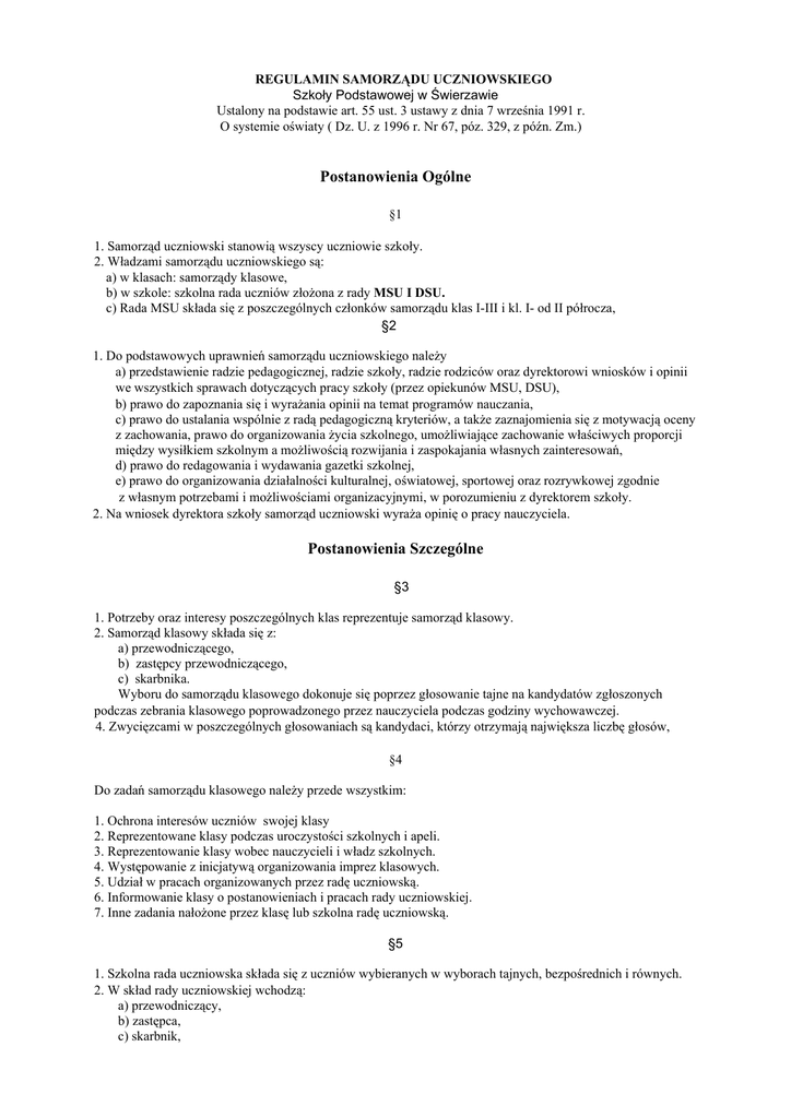 REGULAMIN SAMORZĄDU UCZNIOWSKIEGO Szkoły Podstawowej w Świerzawie Ustalony na podstawie art. 55 ust. 3 ustawy z dnia 7 września 1991 r. O systemie oświaty ( Dz. U. z 1996 r. Nr 67, póz. 329, z późn. Zm.) Postanowienia Ogólne §1 1. Samorząd uczniowski stanowią wszyscy uczniowie szkoły. 2. Władzami samorządu uczniowskiego są: a) w klasach: samorządy klasowe, b) w szkole: szkolna rada uczniów złożona z rady MSU I DSU. c) Rada MSU składa się z poszczególnych członków samorządu klas I-III i kl. I- od II półrocza, §2 1. Do podstawowych uprawnień samorządu uczniowskiego należy a) przedstawienie radzie pedagogicznej, radzie szkoły, radzie rodziców oraz dyrektorowi wniosków i opinii we wszystkich sprawach dotyczących pracy szkoły (przez opiekunów MSU, DSU), b) prawo do zapoznania się i wyrażania opinii na temat programów nauczania, c) prawo do ustalania wspólnie z radą pedagogiczną kryteriów, a także zaznajomienia się z motywacją oceny z zachowania, prawo do organizowania życia szkolnego, umożliwiające zachowanie właściwych proporcji między wysiłkiem szkolnym a możliwością rozwijania i zaspokajania własnych zainteresowań, d) prawo do redagowania i wydawania gazetki szkolnej, e) prawo do organizowania działalności kulturalnej, oświatowej, sportowej oraz rozrywkowej zgodnie z własnym potrzebami i możliwościami organizacyjnymi, w porozumieniu z dyrektorem szkoły. 2. Na wniosek dyrektora szkoły samorząd uczniowski wyraża opinię o pracy nauczyciela. Postanowienia Szczególne §3 1. Potrzeby oraz interesy poszczególnych klas reprezentuje samorząd klasowy. 2. Samorząd klasowy składa się z: a) przewodniczącego, b) zastępcy przewodniczącego, c) skarbnika. Wyboru do samorządu klasowego dokonuje się poprzez głosowanie tajne na kandydatów zgłoszonych podczas zebrania klasowego poprowadzonego przez nauczyciela podczas godziny wychowawczej. 4. Zwycięzcami w poszczególnych głosowaniach są kandydaci, którzy otrzymają największa liczbę głosów, §4 Do zadań samorządu klasowego należy przede wszystkim: 1. Ochrona interesów uczniów swojej klasy 2. Reprezentowane klasy podczas uroczystości szkolnych i apeli. 3. Reprezentowanie klasy wobec nauczycieli i władz szkolnych. 4. Występowanie z inicjatywą organizowania imprez klasowych. 5. Udział w pracach organizowanych przez radę uczniowską. 6. Informowanie klasy o postanowieniach i pracach rady uczniowskiej. 7. Inne zadania nałożone przez klasę lub szkolna radę uczniowską. §5 1. Szkolna rada uczniowska składa się z uczniów wybieranych w wyborach tajnych, bezpośrednich i równych. 2. W skład rady uczniowskiej wchodzą: a) przewodniczący, b) zastępca, c) skarbnik, d) kierownicy i członkowie sekcji -jeżeli sekcje zostaną powołane. 3. Kadencja rady uczniowskiej trwa jeden rok. 4. Przewodniczący rady uczniowskiej koordynuje prace rady i reprezentuje samorząd uczniowski wobec władz szkoły i na zewnątrz szkoły. 5. Rada uczniowska obraduje - na zebraniach zwoływanych przez przewodniczącego lub opiekunów samorządu. §6 1. Do zadań podstawowych szkolnej rady uczniowskiej należy: a) przygotowanie projektów regulaminu samorządu uczniowskiego, b) występowanie do władz szkolnych z nowymi inicjatywami dotyczącymi życia szkolnego i sposobu ich wykonywania, c) gospodarowanie środkami materialnymi samorządu uczniowskiego. d) wykonywanie zadań zleconych przez radę pedagogiczną i dyrekcję szkoły, e) proponowanie kandydata na opiekuna samorządu uczniowskiego. 2. W razie konieczności szkolna rada uczniowska może powołać komisję dyscyplinarną - regulaminową wyłanianą z członków rady. §7 1. W celu usprawnienia swej działalności szkolna rada uczniowska może powoływać sekcje do wykonywania określonych zadań. 2. Na czele wszystkich sekcji stoją kierownicy, powołani na zebraniu szkolnej rady uczniowskiej. 3. W skład sekcji wchodzą uczniowie spoza szkolnej rady uczniowskiej. 4. Członkowie poszczególnych sekcji mogą być odwołani przez kierownika, jeżeli nie wypełniają swych obowiązków. 5. Prace wszystkich sekcji koordynuje przewodniczący szkolnej rady uczniowskiej wraz z nauczycielami opiekunami §8 1. Wybory do szkolnej rady uczniowskiej przeprowadza się w czerwcu 2. Wybory są tajne, bezpośrednie i równe. 3. Czynne i bierne prawo udziału w wyborach do szkolnej rady uczniowskiej mają wszyscy uczniowie szkoły. 4. Wybory do samorządów klasowych przeprowadza się we wrześniu. 5.Czynne i bierne prawo udziału w wyborach do samorządu klasowego mają wszyscy uczniowie danej klasy. §9 1. Wybory zarządza przewodniczący szkolnej rady uczniowskiej w porozumieniu z opiekunem samorządu uczniowskiego i dyrekcją szkoły. 2. Zarządzenie o wyborach rozwiesza się w formie plakatów na terenie szkoły oraz ogłasza się w każdej klasie . §10 1. Komisja wyborcza przeprowadza wybory, liczy głosy i ogłasza wyniki. 2. Komisja składa się z członków rady uczniowskiej. 3. Na czele komisji stoi przewodniczący szkolnej rady uczniowskiej. 4. Komisja działa pod nadzorem opiekunów samorządu uczniowskiego. §11 1. Kandydatów na członków szkolnej rady uczniowskiej mogą zgłaszać wszyscy uczniowie szkoły. 2. Liczba kandydatów jest nieograniczona. 3. Uczniowie, którzy chcą kandydować, muszą uzyskać poparcie conajmniej dziesięciu innych uczniów: 4. Kandydaci na członków szkolnej rady uczniowskiej wywieszają na korytarzach szkolnych w formie pisemnej swoje programy wyborcze, najpóźniej na tydzień przed datą wyborów. 5. Lista kandydatów do rady uczniowskiej rozwieszona zostaje na tablicy ogłoszeń samorządu uczniowskiego. §12 1. Każdy uczeń uprawniony do głosowania otrzymuje kartę wyborczą z nazwiskami kandydatów. 2. Głosować można tylko na jednego kandydata. 3. Wyborca stawia znak „X" obok nazwiska kandydata, na którego głosuje. 4. Wyborca wrzuca kartkę wyborczą do urny w obecności komi
