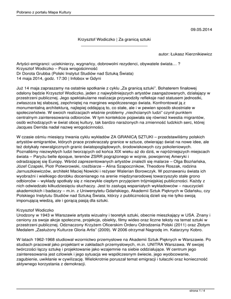 Pobrano z portalu Mapa Kultury 09.05.2014 Krzysztof Wodiczko | Za granicą sztuki ____________________________ autor: Łukasz Kierznikiewicz Artyści-emigranci: uciekinierzy, wygnańcy, dobrowolni rezydenci, obywatele świata… ? Krzysztof Wodiczko – Poza wrogościnność Dr Dorota Grubba (Polski Instytut Studiów nad Sztuką Świata) 14 maja 2014, godz. 17:30 | Infobox w Gdyni Już 14 maja zapraszamy na ostatnie spotkanie z cyklu „Za granicą sztuki”. Bohaterem finałowej odsłony będzie Krzysztof Wodiczko, jeden z najwybitniejszych artystów zaangażowanych, działający w przestrzeni publicznej. Jego spektakularne realizacje przywodziły refleksje nad statusem jednostki, zwłaszcza tej słabszej, zepchniętej na margines współczesnego świata. Konfrontował ją z monumentalną architekturą, najlepiej oddającą to, co stałe, ale i w pewien sposób skostniałe w społeczeństwie. W swoich realizacjach właśnie problemy „niechcianych ludzi” czynił punktem centralnym zainteresowania odbiorców. W tym kontekście pojawiała się również kwestia migrantów, osób wchodzących w świat obcej kultury, tak bardzo narażonych na zmienność ludzkich serc, której Jacques Derrida nadał nazwę wrogościnności. W czasie ośmiu miesięcy trwania cyklu wykładów ZA GRANICĄ SZTUKI – przedstawiliśmy polskich artystów-emigrantów, których prace przekraczały granice w sztuce, otwierając świat na nowe idee, ale też dotykały newralgicznych granic światopoglądowych, środowiskowych czy pokoleniowych. Poznaliśmy niezwykłych ludzi tworzących od końca XIX wieku aż do dziś, w najróżniejszych miejscach świata – Paryżu belle époque, terenów ZSRR pogrążonego w wojnie, powojennej Ameryki i odradzającej się Europy. Wśród zaprezentowanych artystów znaleźli się malarze – Olga Bozńańska, Józef Czapski, Piotr Potworowski, rzeźbiarze – Alina Szapocznikow, Theodore Roszak, rodzina Jarnuszkiewiczów, architekt Maciej Nowicki i reżyser Walerian Borowczyk. W poznawaniu świata ich wyobraźni i wielkiego dorobku docenianego na arenie międzynarodowej towarzyszyło stałe grono odbiorców – wykłady spotkały się z niezwykle ciepłym przyjęciem trójmiejskiej publiczności. Każdy z nich odwiedzało kilkudziesięciu słuchaczy. Jest to zasługą wspaniałych wykładowców – nauczycieli akademickich i badaczy – m.in. z Uniwersytetu Gdańskiego, Akademii Sztuk Pięknych w Gdańsku, czy Polskiego Instytutu Studiów nad Sztuką Świata, którzy z publicznością dzieli się nie tylko swoją imponującą wiedzą, ale i gorącą pasją dla sztuki. Krzysztof Wodiczko Urodzony w 1943 w Warszawie artysta wizualny i teoretyk sztuki, obecnie mieszkający w USA. Znany i ceniony za swoje akcje społeczne, projekcje, obiekty, filmy wideo oraz liczne teksty na temat sztuki w przestrzeni publicznej. Odznaczony Krzyżem Oficerskim Orderu Odrodzenia Polski (2011) oraz Złotym Medalem „Zasłużony Kulturze Gloria Artis” (2009). W 2006 otrzymał Nagrodę im. Katarzyny Kobro. W latach 1962-1968 studiował wzornictwo przemysłowe na Akademii Sztuk Pięknych w Warszawie. Po studiach pracował jako projektant w zakładach przemysłowych, m.in. UNITRA Warszawa. W swojej twórczości łączy sztukę i projektowanie jako wzajemnie na siebie oddziałujące. W centrum jego zainteresowania jest człowiek i jego sytuacja we współczesnym świecie, jego wyobcowanie, zagubienie, uwikłanie w cywilizację. Wielokrotnie poruszał temat emigracji i tułaczki oraz konieczność aktywnego korzystania z demokracji. strona 1 / 4 Pobrano z portalu Mapa Kultury W 1977 wyjechał z Polski, początkowo do Kanady, gdzie pracował na Uniwersytecie Guelph. Jest wykładowcą akademickim – wykładał m.in. w Akademii Sztuk Pięknych w Warszawie i na Politechnice Warszawskiej, École Nationale Supérieure des Beaux Arts w Paryżu, Cooper Union School of Art w Nowym Jorku, University of Hartford w Hartford, Connecticut, Institute of Technology w Nowym Jorku, Ontario College of Art w Toronto. Był dyrektorem Center for Advanced Visual Studies w Massachusetts Institute of Technology, Cambridge. Obecnie wykłada w Szkole Wyższej Psychologii Społecznej w Warszawie. Wodiczko jest autorem projektów na pograniczu sztuki i techniki, które odpowiadały na problemy współczesności, jak np. skonstruowany w 1987 „Pojazd dla bezdomnych”, który przez dwa lata testował na ulicach Nowego Jorku. Przywołując zjawisko emigracji artysta pracował od roku 1992 nad „Laską tułacza”, odwołującą się do chrześcijańskiej ikonografii biblijnych pasterzy, prezentowaną m.in. Barcelonie, Nowym Jorku, Paryżu i Marsylii. Temat emigracji poruszał również w Instalacja „Goście”, zaprezentowana w 2009 na 53. Biennale w Wenecji w Pawilonie Polskim. Jest autorem instalacji „Hiroshima”, pokazanej po raz pierwszy w 1999 Kopule Wojny Atomowej w Hiroshimie. Od początku lat 80. pracował nad projekcjami slajdowymi, a od 1996 także filmowymi na budynkach w przestrzeni miejskiej. Artysta zrealizował także instalację z projekcją na galerii Zachęta w Warszawie w 2005. 25 marca 2012 w Nantes odsłonięto zaprojektowany przez Wodiczkę pomnik obalenia niewolnictwa. Dr Dorota Grubba, która poprowadzi wykład poświęcony Krzysztofowi tak zachęca do udziału w spotkaniu: Krzysztof Wodiczko jest jednym z najwybitniejszych artystów zaangażowanych działających w przestrzeni publicznej, autorem słynnych w międzynarodowym obiegu sztuki projekcji oraz licznych obiektów, najczęściej partycypacyjnych. Wodiczko jest zarazem inspirującym pedagogiem, teoretykiem, twórcą wyrazistej linii filozofii współczesności. Siłą jego twórczości pozostaje ścisły związek myśli z wybitnymi aspektami wizualnymi obrazów wprowadzanych w przestrzeń społeczną, które wydają się zaledwie delikatnie ją dotykać, jakby na podobieństwo przeskalowanych ogromnych figuratywnych średniowiecznych fresków