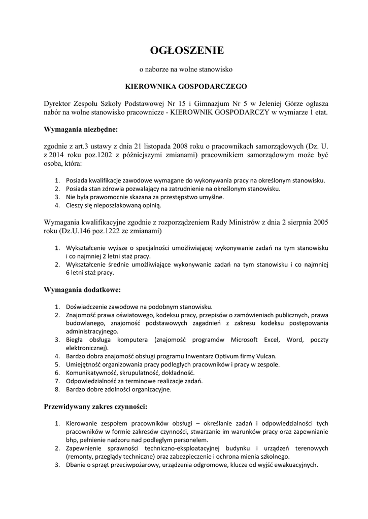 OGŁOSZENIE o naborze na wolne stanowisko KIEROWNIKA GOSPODARCZEGO Dyrektor Zespołu Szkoły Podstawowej Nr 15 i Gimnazjum Nr 5 w Jeleniej Górze ogłasza nabór na wolne stanowisko pracownicze - KIEROWNIK GOSPODARCZY w wymiarze 1 etat. Wymagania niezbędne: zgodnie z art.3 ustawy z dnia 21 listopada 2008 roku o pracownikach samorządowych (Dz. U. z 2014 roku poz.1202 z późniejszymi zmianami) pracownikiem samorządowym może być osoba, która: 1. 2. 3. 4. Posiada kwalifikacje zawodowe wymagane do wykonywania pracy na określonym stanowisku. Posiada stan zdrowia pozwalający na zatrudnienie na określonym stanowisku. Nie była prawomocnie skazana za przestępstwo umyślne. Cieszy się nieposzlakowaną opinią. Wymagania kwalifikacyjne zgodnie z rozporządzeniem Rady Ministrów z dnia 2 sierpnia 2005 roku (Dz.U.146 poz.1222 ze zmianami) 1. Wykształcenie wyższe o specjalności umożliwiającej wykonywanie zadań na tym stanowisku i co najmniej 2 letni staż pracy. 2. Wykształcenie średnie umożliwiające wykonywanie zadań na tym stanowisku i co najmniej 6 letni staż pracy. Wymagania dodatkowe: 1. Doświadczenie zawodowe na podobnym stanowisku. 2. Znajomość prawa oświatowego, kodeksu pracy, przepisów o zamówieniach publicznych, prawa budowlanego, znajomość podstawowych zagadnień z zakresu kodeksu postępowania administracyjnego. 3. Biegła obsługa komputera (znajomość programów Microsoft Excel, Word, poczty elektronicznej). 4. Bardzo dobra znajomość obsługi programu Inwentarz Optivum firmy Vulcan. 5. Umiejętność organizowania pracy podległych pracowników i pracy w zespole. 6. Komunikatywność, skrupulatność, dokładność. 7. Odpowiedzialność za terminowe realizacje zadań. 8. Bardzo dobre zdolności organizacyjne. Przewidywany zakres czynności: 1. Kierowanie zespołem pracowników obsługi – określanie zadań i odpowiedzialności tych pracowników w formie zakresów czynności, stwarzanie im warunków pracy oraz zapewnianie bhp, pełnienie nadzoru nad podległym personelem. 2. Zapewnienie sprawności techniczno-eksploatacyjnej budynku i urządzeń terenowych (remonty, przeglądy techniczne) oraz zabezpieczenie i ochrona mienia szkolnego. 3. Dbanie o sprzęt przeciwpożarowy, urządzenia odgromowe, klucze od wyjść ewakuacyjnych. 4. Dbanie o czystość gmachu oraz przynależnego terenu, zapewnienie opieki nad zielenią szkolną. 5. Sporządzanie sprawozdań dotyczących budynku, środków trwałych i wyposażenia. 6. Inwentaryzacja i oznakowanie sprzętu szkolnego, prowadzenie ksiąg inwentarzowych, organizacja inwentaryzacji rocznej i okresowej. 7. Prowadzenie książek obiektu. 8. Prowadzenie magazynu oleju opałowego, środków czystości i mat. BHP. 9. Prowadzenie archiwum szkoły. 10. Organizacja przetargów na prace remontowe i zakupy inwestycyjne w szkole. 11. Prowadzenie prac remontowych i naprawczych w szkole. 12. Realizacja zakupów materiałów eksploatacyjnych i wyposażenia szkoły. 13. Potwierdzanie pod względem merytorycznym rachunków za media i za dokonywane dla szkoły zakupy. 14. Organizowanie szkoleń w dziedzinie bhp i p.poż. dla pracowników. 15. Współdziałanie z dyrektorem w zakresie prowadzenia przez szkołę działalności gospodarczej (sporządzanie umów najmu, dzierżawy, porozumień, wystawianie rachunków). 16. Wykonywanie prac doraźnych zleconych przez dyrekcję, wynikających z istotnych potrzeb szkoły. Warunki pracy i płacy 1. Zatrudnienia na zastępstwo chorego pracownika, duże prawdopodobieństwo zatrudnienia na stałe. 2. Wynagrodzenie zgodne z Rozporządzeniem Rady Ministrów z dnia 28.02.2006 r. (Dz.U.nr 38 poz.261). Wymagane dokumenty: 1. 2. 3. 4. List motywacyjny i CV. Podanie o przyjęcie na stanowisko objęte naborem. Dokument potwierdzający tożsamość . Dokumenty potwierdzające wykształcenie, dodatkowe uprawnienia, kwalifikacje i odpowiedni staż pracy. 5. Zaświadczenie Krajowego rejestru Karnego o niekaralności za przestępstwa popełnione umyślnie. 6. Oświadczenie zawierające zgodę na przetwarzanie danych osobowych zgodnie z ustawą z dnia 29 sierpnia 1997r o ochronie danych osobowych (Dz. U. z 2002 roku nr 101 póz.926 z późn. zmianami) na potrzeby związane z ogłoszonym naborem. Termin i miejsce składania dokumentów: Dokumenty należy składać w zamkniętej kopercie z podanym adresem i nr telefonu wraz z dopiskiem „Nabór na stanowisko Kierownika Gospodarczego” w sekretariacie Zespołu Szkoły Podstawowej Nr 15 i Gimnazjum Nr 5 w Jeleniej Górze od poniedziałku do piątku w godzinach od 8:00 do 15:00 do dnia 25 lutego 2015 roku. Informujemy, że w celu przeprowadzenia dalszego procesu rekrutacji skontaktujemy się tylko z wybranymi kandydatami w uzgodnionym indywidualnie terminie.