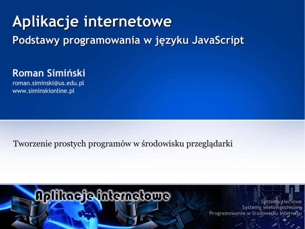 Aplikacje internetowe Podstawy programowania w języku JavaScript Roman Simiński [email protected] www.siminskionline.pl Tworzenie prostych programów w środowisku przeglądarki W jaki sposób umieszczany jest kod JS w dokumencie HTML? Kod umieszcza się w obrębie znacznika <script>: <script> Kod w języku JavaScript </script> Dawniej określało się atrybut type, teraz nie jest to konieczne: <script type="text/javascript"> Kod w języku JavaScript </script> 2 W jaki sposób umieszczany jest kod JS w dokumencie HTML? Przykład: <script> alert("Czołem!\nJavaScript wita :)"); </script> Funkcja alert wyświetla komunikat message w oknie dialogowym wraz z przyciskiem OK. Funkcja alert nie udostępnia rezultatu: alert( message ) Wygląd okna dialogowego może się różnić w zależności od przeglądarki. Ćwiczenie: Proszę sprawdzić wygląd okna dialogowego funkcji alert w różnych przeglądarkach. 3 Gdzie umieszcza się kod JS w dokumencie HTML? Wersja I: kod w obrębie znacznika <body>: <!DOCTYPE html> <html> <body> . . . <script> <script> Kod w języku JavaScript </script> </script> . . . </body> </html> 4 Gdzie umieszcza się kod JS w dokumencie HTML? Wersja I, przykład: Tak Tak umieszczony umieszczony kod kod wykona wykona się się „samoczynnie” „samoczynnie” w w trakcie trakcie interpretacji interpretacji przez przez przeglądarkę przeglądarkę sekcji sekcji body. body. <!DOCTYPE html> <html> <body> <h1>Kod JS w sekcji body</h1> <script> alert("Czołem!\nJavaScript wita :)"); </script> </body> </html> Uwaga Uwaga –– w w niektórych niektórych przeglądarkach przeglądarkach zawartość zawartość sekcji sekcji <h1> <h1> pojawi pojawi się się dopiero dopiero po po zamknięciu zamknięciu okna okna wyświetlanego wyświetlanego funkcją funkcją alert. alert. 5 Gdzie umieszcza się kod JS w dokumencie HTML? Wersja II: kod w obrębie znacznika <head>: <!DOCTYPE html> <html> <head> <script> Kod w języku JavaScript </script> </head> <body> </body> </html> W ten sposób umieszcza się najczęściej kod funkcji. 6 Gdzie umieszcza się kod JS w dokumencie HTML? Wersja II, przykład: Tak Tak umieszczony umieszczony kod kod wykona wykona się się „samoczynnie” „samoczynnie” w w trakcie trakcie interpretacji interpretacji przez przez przeglądarkę przeglądarkę sekcji sekcji head. head. <!DOCTYPE html> <html> <head> <script> alert("Czołem!\nJavaScript wita :)"); </script> </head> <body> <h1>Kod JS w sekcji head</h1> </body> </html> 7 Gdzie umieszcza się kod JS w dokumencie HTML? Wersja III, kod w osobnym pliku: <!DOCTYPE html> <html> <body> <h1>Kod JS w sekcji body</h1> <script src="kodwpliku.js"></script> </body> </html> <!DOCTYPE html> <html> <head> <script src="kodwpliku.js"></script> </head> Kod Kod w w sekcji sekcji body body Kod Kod w w sekcji sekcji head head <body> <h1>Kod JS w sekcji head</h1> </body> </html> 8 Dygresja – JavaScript a programowanie zdarzeniowe Zdarzenie (ang. event) to coś, co może przytrafić się elementowi HTML. Najczęściej spotykane zdarzenia: Zdarzenie Opis onclick Gdy użytkownik kliknie element HTML onchange Gdy element HTML został zmieniony onmouseover Gdy muszka przemieszcza się nad elementem HTML onmouseout Gdy myszka opuszcza element HTML onkeydown Gdy użytkownik naciska klawisz klawiaturowy onload Gdy dokument HTML został załadowany przez przeglądarkę Ogólna składnia aktywowania kodu JS dla zdarzenia: <jakiś-znacznik_HTML jakieś-zdarzenie='kod JavaScript'> <jakiś-znacznik_HTML jakieś-zdarzenie=”kod JavaScript”> 9 Gdzie umieszcza się kod JS w dokumencie HTML? Wersja IV, kod JS aktywowany zdarzeniowo: <!DOCTYPE html> <html> <body onload="alert('Czołem!\nJavaScript wita :)')"> <h1>Kod JS w on load sekcji body</h1> </body> </html> <!DOCTYPE html> <html> <body> <h1>Kod JS w onclick przycisku</h1> <button onclick="alert('Czołem!\nJavaScript wita :)')"> Kliknij proszę </button> </body> </html> 10 Wyprowadzanie informacji wyjściowych Znane już okienko dialogowe alert: <!DOCTYPE html> <html> <body> <h1>Kod JS w onclick przycisku</h1> <button onclick="alert('Czołem!\nJavaScript wita :)')"> Kliknij proszę </button> </body> </html> 11 Wyprowadzanie informacji wyjściowych Bezpośrednie pisanie do dokumentu HTML: <!DOCTYPE html> <html> <body> <h1>Pisanie do dokumentu</h1> <script> document.write("<em>Tekst z JS</em><br />"); document.write(2 * 2); </script> </body> </html> Uwaga Uwaga –– document document to to obiekt obiekt reprezentujący reprezentujący aktualnie aktualnie załadowany załadowany dokument dokument HTML. HTML. Metody Metody tego tego obiektu obiektu mogą mogą być być wywoływane wywoływane zz pominięciem pominięciem jego jego nazwy. nazwy. document.write("<em>Tekst z JS</em><br />"); write("<em>Tekst z JS</em><br />"); 12 Wstawianie danych do elementów HTML Aby kod JS mógł operować na elementach HTML opracowano DOM – Document Object Model. HTML DOM jest standardem określającym jak pobierać, zmieniać, dodawać i usuwać elementy z dokumentu HTML załadowanego do przeglądarki. HTML DOM jest niezależny od środowiska, przeglądarki, języka, pozwala na dynamiczne modyfikowanie zarówno treści elementów dokumentu HTML jak i ich struktury oraz wyglądu. HTML DOM pozwala na: odwoływanie się do elementów HTML jak do obiektów w prog. obiektowym; dostęp do wszystkich właściwości elementu HTML jak do właściwości; dostęp do metod oraz zdarzeń związanych z elementem. 13 Wstawianie danych do elementów HTML Dostęp do konkretnych, unikatowych elementów HTML uzyskuje się poprzez: przydzielenie elementowi unikatowego identyfikatora id, wykorzystanie funkcji getElementById w celu uzyskania referencji do obiektu reprezentującego element HTML w DOM' Wykorzystanie właściwości innerHTML. Pusty Pusty paragraf paragraf zz określonym określonym id id <!DOCTYPE html> <html> <body> <p id="info"></p> Pobranie Pobranie referencji referencji ii zapamiętanie zap
