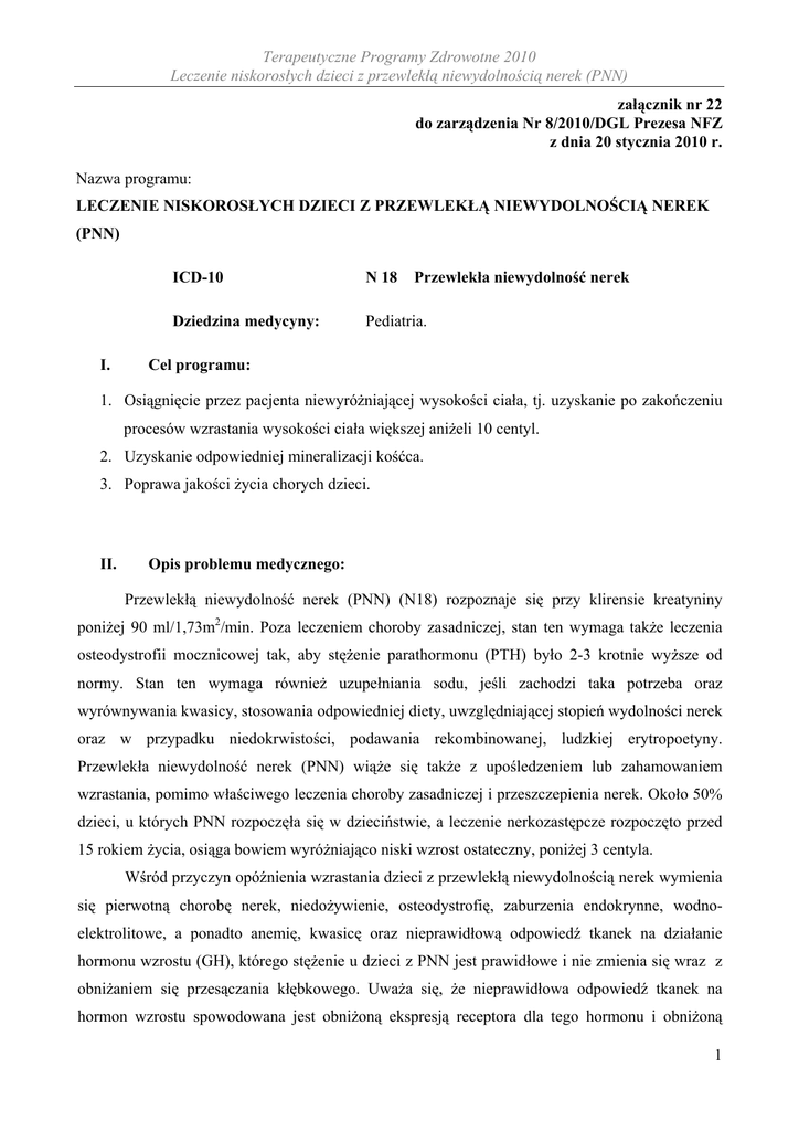 Terapeutyczne Programy Zdrowotne 2010 Leczenie niskorosłych dzieci z przewlekłą niewydolnością nerek (PNN) załącznik nr 22 do zarządzenia Nr 8/2010/DGL Prezesa NFZ z dnia 20 stycznia 2010 r. Nazwa programu: LECZENIE NISKOROSŁYCH DZIECI Z PRZEWLEKŁĄ NIEWYDOLNOŚCIĄ NEREK (PNN) I. ICD-10 N 18 Przewlekła niewydolność nerek Dziedzina medycyny: Pediatria. Cel programu: 1. Osiągnięcie przez pacjenta niewyróżniającej wysokości ciała, tj. uzyskanie po zakończeniu procesów wzrastania wysokości ciała większej aniżeli 10 centyl. 2. Uzyskanie odpowiedniej mineralizacji kośćca. 3. Poprawa jakości życia chorych dzieci. II. Opis problemu medycznego: Przewlekłą niewydolność nerek (PNN) (N18) rozpoznaje się przy klirensie kreatyniny poniżej 90 ml/1,73m2/min. Poza leczeniem choroby zasadniczej, stan ten wymaga także leczenia osteodystrofii mocznicowej tak, aby stężenie parathormonu (PTH) było 2-3 krotnie wyższe od normy. Stan ten wymaga również uzupełniania sodu, jeśli zachodzi taka potrzeba oraz wyrównywania kwasicy, stosowania odpowiedniej diety, uwzględniającej stopień wydolności nerek oraz w przypadku niedokrwistości, podawania rekombinowanej, ludzkiej erytropoetyny. Przewlekła niewydolność nerek (PNN) wiąże się także z upośledzeniem lub zahamowaniem wzrastania, pomimo właściwego leczenia choroby zasadniczej i przeszczepienia nerek. Około 50% dzieci, u których PNN rozpoczęła się w dzieciństwie, a leczenie nerkozastępcze rozpoczęto przed 15 rokiem życia, osiąga bowiem wyróżniająco niski wzrost ostateczny, poniżej 3 centyla. Wśród przyczyn opóźnienia wzrastania dzieci z przewlekłą niewydolnością nerek wymienia się pierwotną chorobę nerek, niedożywienie, osteodystrofię, zaburzenia endokrynne, wodnoelektrolitowe, a ponadto anemię, kwasicę oraz nieprawidłową odpowiedź tkanek na działanie hormonu wzrostu (GH), którego stężenie u dzieci z PNN jest prawidłowe i nie zmienia się wraz z obniżaniem się przesączania kłębkowego. Uważa się, że nieprawidłowa odpowiedź tkanek na hormon wzrostu spowodowana jest obniżoną ekspresją receptora dla tego hormonu i obniżoną 1 Terapeutyczne Programy Zdrowotne 2010 Leczenie niskorosłych dzieci z przewlekłą niewydolnością nerek (PNN) biodostępnością insulinopodobnego czynnika wzrostu - I (IGF-I), który w zdecydowanej większości krąży w krwi w postaci kompleksu związanego z białkami wiążącymi (IGF bindings proteins - IGFBPs), przede wszystkim w postaci IGFBP-3. Poprawę wzrastania po zastosowaniu hormonu wzrostu u dzieci z PNN uzyskuje się głównie dzięki normalizacji stosunku IGF-I do IGFBP-3. Po podaniu hormonu wzrostu w surowicy krwi tych pacjentów stwierdza się bowiem wyższe stężenia wolnego, nie związanego z białkami IGF-I, co zwiększa jego biodostępność dla chrząstki wzrostowej. Dzieci z PNN charakteryzuje znacznego stopnia niedobór wzrostu, pogłębiający się w miarę trwania choroby. Nie podjęcie leczenia hormonem wzrostu powoduje pogłębianie się niedoboru wzrostu, co nieuchronnie prowadzi do trwałego kalectwa, ponieważ na skutek skrajnej niskorosłości zdecydowana większość spośród tych dzieci, pomimo prawidłowego rozwoju intelektualnego, nigdy nie podejmie pracy zawodowej, wymagając od wkroczenia w wiek dojrzały rent inwalidzkich i innych świadczeń społecznych. Znaczna część spośród tych osób ulega także degradacji społecznej, gdyż jest nieakceptowana (izolowana) przez środowisko, zarówno w miejscu zamieszkania, szkole, jak również przy podejmowaniu prób podjęcia pracy zawodowej. Brak akceptacji takiego dziecka przez środowisko prowadzi także do jego gorszego rozwoju, na skutek zmniejszenia aktywności życiowej i intelektualnej, spychając dziecko na margines społeczeństwa. Epidemiologia W okresie dojrzewania niskorosłość mocznicową częściej obserwuje się u chłopców. Udany przeszczep nerki wpływa na przyspieszenie tempa wzrastania, ale nie pozwala na osiągnięcie przez te dzieci wzrostu ostatecznego zbliżonego do zdrowych rówieśników, co nawet przy dobrej rehabilitacji fizycznej i psychicznej bywa przyczyną tragedii życiowych, spychając dziecko na margines społeczeństwa. III. Opis programu W przypadku niskorosłości w przebiegu przewlekłej niewydolności nerek leczenie hormonem wzrostu jest leczeniem z wyboru i prowadzone jest zarówno w okresie przeddializacyjnym, w czasie leczenia nerkozastępczego i niekiedy po przeszczepieniu nerki. W przypadku niepodjęcia takiego leczenia, nawet po udanej transplantacji nerki, dziecko pozostaje bowiem patologicznie niskie. 1. Substancja czynna finansowana w ramach programu: rekombinowany ludzki hormon wzrostu 2 Terapeutyczne Programy Zdrowotne 2010 Leczenie niskorosłych dzieci z przewlekłą niewydolnością nerek (PNN) Opis działania leku Hormon wzrostu spełnia różną funkcję, zależnie od okresu rozwoju organizmu. W okresie wzrastania stymuluje wzrost i podziały komórek, w tym wzrost chrząstki, a oddziałując na chrząstkę przynasadową pobudza wzrost kości na długość. Stymuluje także podziały innych komórek. Moduluje również przebieg dojrzewania płciowego, wpływa na gospodarkę lipidową, węglowodanową i białkową, a ponadto na gospodarkę wodno-elektrolitową, mineralizację szkieletu, układ mięśniowy i krążenia. Hormon wzrostu działa poprzez receptor błonowy, z rodziny receptorów cytokin, w wielu swoich działaniach za pośrednictwem IGF-I. Wpływ hormonu wzrostu na układ kostny, w tym chrząstkę (płytkę) wzrostową (przynasadę) kości długich jest istotny dla pobudzania wzrastania. Zachowanie przyrostu kości na długość wymaga zapewnienia odpowiedniej ich mineralizacji (Bone Mineral Content - BMC), co związane jest z zapewnieniem wysokiego obrotu kostnego, czyli resorpcji i nowotworzenia substancji kostnej. Hormon wzrostu działa na wszystkie te parametry pośrednio i bezpo