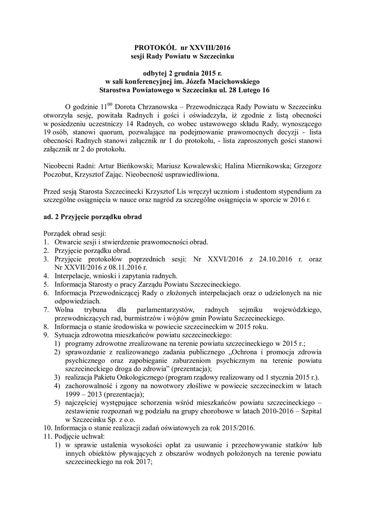 PROTOKÓŁ nr XXVIII/2016 sesji Rady Powiatu w Szczecinku
