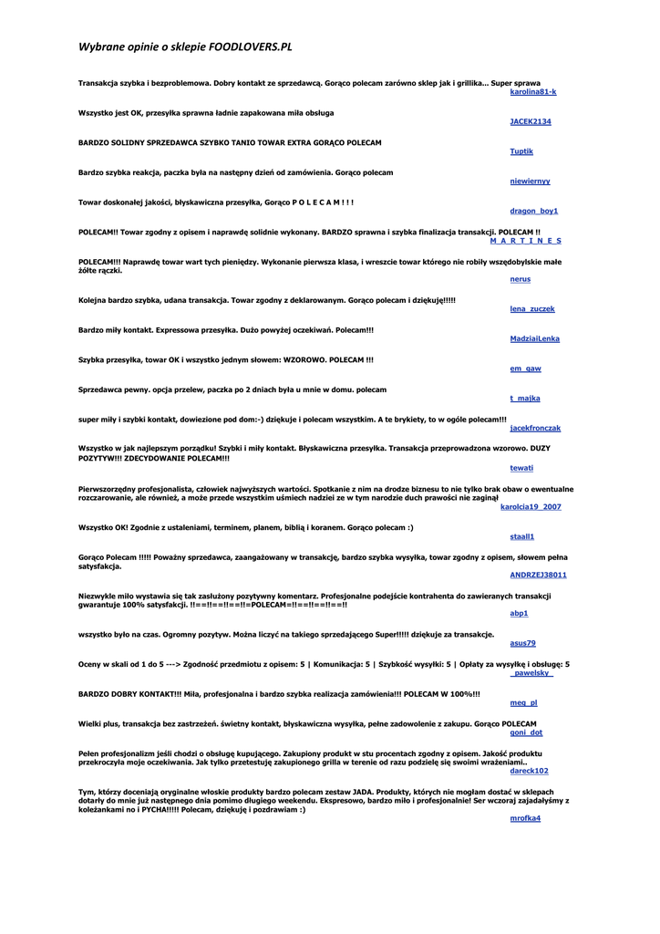 Wybrane opinie o sklepie FOODLOVERS.PL Transakcja szybka i bezproblemowa. Dobry kontakt ze sprzedawcą. Gorąco polecam zarówno sklep jak i grillika... Super sprawa karolina81-k Wszystko jest OK, przesyłka sprawna ładnie zapakowana miła obsługa JACEK2134 BARDZO SOLIDNY SPRZEDAWCA SZYBKO TANIO TOWAR EXTRA GORĄCO POLECAM Tuptik Bardzo szybka reakcja, paczka była na następny dzień od zamówienia. Gorąco polecam niewiernyy Towar doskonałej jakości, błyskawiczna przesyłka, Gorąco P O L E C A M ! ! ! dragon_boy1 POLECAM!! Towar zgodny z opisem i naprawdę solidnie wykonany. BARDZO sprawna i szybka finalizacja transakcji. POLECAM !! M_A_R_T_I_N_E_S POLECAM!!! Naprawdę towar wart tych pieniędzy. Wykonanie pierwsza klasa, i wreszcie towar którego nie robiły wszędobylskie małe Ŝółte rączki. nerus Kolejna bardzo szybka, udana transakcja. Towar zgodny z deklarowanym. Gorąco polecam i dziękuję!!!!! lena_zuczek Bardzo miły kontakt. Expressowa przesyłka. DuŜo powyŜej oczekiwań. Polecam!!! MadziaiLenka Szybka przesyłka, towar OK i wszystko jednym słowem: WZOROWO. POLECAM !!! em_gaw Sprzedawca pewny. opcja przelew, paczka po 2 dniach była u mnie w domu. polecam t_majka super miły i szybki kontakt, dowiezione pod dom:-) dziękuje i polecam wszystkim. A te brykiety, to w ogóle polecam!!! jacekfronczak Wszystko w jak najlepszym porządku! Szybki i miły kontakt. Błyskawiczna przesyłka. Transakcja przeprowadzona wzorowo. DUZY POZYTYW!!! ZDECYDOWANIE POLECAM!!! tewati Pierwszorzędny profesjonalista, człowiek najwyŜszych wartości. Spotkanie z nim na drodze biznesu to nie tylko brak obaw o ewentualne rozczarowanie, ale równieŜ, a moŜe przede wszystkim uśmiech nadziei ze w tym narodzie duch prawości nie zaginął karolcia19_2007 Wszystko OK! Zgodnie z ustaleniami, terminem, planem, biblią i koranem. Gorąco polecam :) staall1 Gorąco Polecam !!!!! PowaŜny sprzedawca, zaangaŜowany w transakcję, bardzo szybka wysyłka, towar zgodny z opisem, słowem pełna satysfakcja. ANDRZEJ38011 Niezwykle miło wystawia się tak zasłuŜony pozytywny komentarz. Profesjonalne podejście kontrahenta do zawieranych transakcji gwarantuje 100% satysfakcji. !!==!!==!!==!!=POLECAM=!!==!!==!!==!! abp1 wszystko było na czas. Ogromny pozytyw. MoŜna liczyć na takiego sprzedającego Super!!!!! dziękuje za transakcje. asus79 Oceny w skali od 1 do 5 ---> Zgodność przedmiotu z opisem: 5 | Komunikacja: 5 | Szybkość wysyłki: 5 | Opłaty za wysyłkę i obsługę: 5 _pawelsky_ BARDZO DOBRY KONTAKT!!! Miła, profesjonalna i bardzo szybka realizacja zamówienia!!! POLECAM W 100%!!! meg_pl Wielki plus, transakcja bez zastrzeŜeń. świetny kontakt, błyskawiczna wysyłka, pełne zadowolenie z zakupu. Gorąco POLECAM goni_dot Pełen profesjonalizm jeśli chodzi o obsługę kupującego. Zakupiony produkt w stu procentach zgodny z opisem. Jakość produktu przekroczyła moje oczekiwania. Jak tylko przetestuję zakupionego grilla w terenie od razu podzielę się swoimi wraŜeniami.. dareck102 Tym, którzy doceniają oryginalne włoskie produkty bardzo polecam zestaw JADA. Produkty, których nie mogłam dostać w sklepach dotarły do mnie juŜ następnego dnia pomimo długiego weekendu. Ekspresowo, bardzo miło i profesjonalnie! Ser wczoraj zajadałyśmy z koleŜankami no i PYCHA!!!!! Polecam, dziękuję i pozdrawiam :) mrofka4