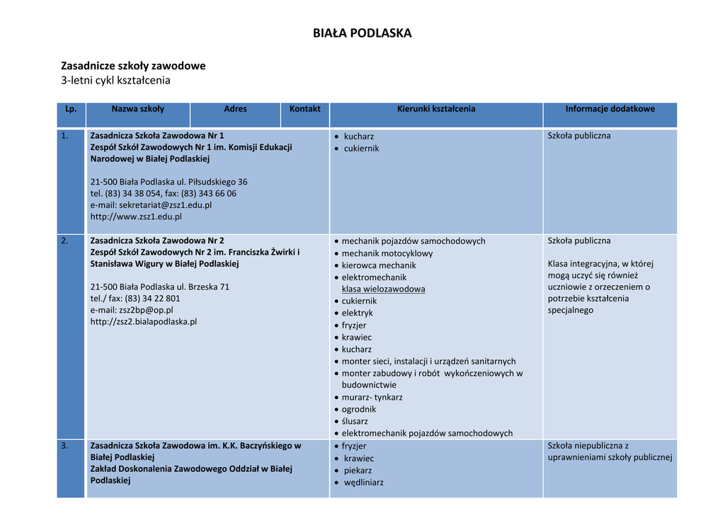 BIAŁA PODLASKA Zasadnicze szkoły zawodowe 3-letni cykl kształcenia Lp. 1. Nazwa szkoły Adres Kontakt Zasadnicza Szkoła Zawodowa Nr 1 Zespół Szkół Zawodowych Nr 1 im. Komisji Edukacji Narodowej w Białej Podlaskiej Kierunki kształcenia Informacje dodatkowe kucharz cukiernik Szkoła publiczna Szkoła publiczna 21-500 Biała Podlaska ul. Piłsudskiego 36 tel. (83) 34 38 054, fax: (83) 343 66 06 e-mail: [email protected] http://www.zsz1.edu.pl 2. Zasadnicza Szkoła Zawodowa Nr 2 Zespół Szkół Zawodowych Nr 2 im. Franciszka Żwirki i Stanisława Wigury w Białej Podlaskiej 21-500 Biała Podlaska ul. Brzeska 71 tel./ fax: (83) 34 22 801 e-mail: [email protected] http://zsz2.bialapodlaska.pl 3. Zasadnicza Szkoła Zawodowa im. K.K. Baczyńskiego w Białej Podlaskiej Zakład Doskonalenia Zawodowego Oddział w Białej Podlaskiej mechanik pojazdów samochodowych mechanik motocyklowy kierowca mechanik elektromechanik klasa wielozawodowa cukiernik elektryk fryzjer krawiec kucharz monter sieci, instalacji i urządzeń sanitarnych monter zabudowy i robót wykończeniowych w budownictwie murarz- tynkarz ogrodnik ślusarz elektromechanik pojazdów samochodowych fryzjer krawiec piekarz wędliniarz Klasa integracyjna, w której mogą uczyć się również uczniowie z orzeczeniem o potrzebie kształcenia specjalnego Szkoła niepubliczna z uprawnieniami szkoły publicznej 4. 21-500 Biała Podlaska Al. Jana Pawła II 97 tel./fax (83) 343 63 62, tel. (83) 343 66 76 e-mail: [email protected] http://www.zdz.bialapodl.pl Rzemieślnicza Zasadnicza Szkoła Zawodowa w Białej Podlaskiej 21-500 Biała Podlaska ul. Warszawska 14 tel./fax: (83) 342 38 12, 343 32 45 e-mail: [email protected] http://www.cechbialski.com.pl cukiernik ogrodnik operator maszyn leśnych rolnik murarz-tynkarz betoniarz - zbrojarz stolarz blacharz ślusarz sprzedawca drukarz elektryk elektromechanik elektromechanik pojazdów samochodowych kucharz mechanik pojazdów samochodowych blacharz samochodowy monter sieci i urządzeń telekomunikacyjnych monter sieci, instalacji i urządzeń sanitarnych monter zabudowy i robót wykończeniowych w budowie ślusarz blacharz samochodowy fryzjer elektromechanik piekarz kucharz cukiernik wędliniarz monter-elektronik elektryk murarz-tynkarz mechanik pojazdów samochodowych elektromechanik pojazdów samochodowych mechanik maszyn i urządzeń drogowych monter zabudowy i robót wykończeniowych w budownictwie monter sieci, instalacji i urządzeń sanitarnych Niepubliczna o uprawnieniach szkoły publicznej stolarz ogrodnik krawiec 5. Zespół Szkół Specjalnych w Białej Podlaskiej Szkoła przysposabiająca do pracy 21-500 Biała Podlaska ul. Orzechowa 58 tel./fax: (83) 341 64 34/35, 343 66 67 e-mail: [email protected] http://www.szkolaspecjalna.bialapodl.pl Technika 4-letni cykl kształcenia Lp. 1. Nazwa szkoły Adres Kontakt Technikum Nr 1 Zespół Szkół Zawodowych Nr 1 im. Komisji Edukacji Narodowej w Białej Podlaskiej 21-500 Biała Podlaska ul. Piłsudskiego 36 tel. (83) 34 38 054, fax: (83) 34 36 606 e-mail: [email protected] http://www.zsz1.edu.pl 2. Technikum Nr 2 Zespół Szkół Zawodowych Nr 2 im. Franciszka Żwirki i Stanisława Wigury w Białej Podlaskiej 21-500 Biała Podlaska ul. Brzeska 71 tel./fax: (83) 34 22 801 e-mail: [email protected] http://www.zsz2.bialapodlaska.pl Kierunki kształcenia Informacje dodatkowe technik ekonomista technik żywienia i usług gastronomicznych technik architektury krajobrazu technik informatyk technik handlowiec technik spedytor technik hotelarstwa technik logistyk technik teleinformatyk kelner Szkoła publiczna technik budownictwa technik cyfrowych procesów graficznych technik elektryk technik energetyk technik informatyk technik pojazdów samochodowych technik mechatronik Szkoła publiczna Klasa integracyjna, w której mogą uczyć się również uczniowie z orzeczeniem o potrzebie kształcenia specjalnego technik urządzeń i systemów energetyki odnawialnej technik elektronik technik przemysłu mody technik organizacji reklamy 3. Technikum im. Krzysztofa Kamila Baczyńskiego Zakład Doskonalenia Zawodowego w Lublinie. Oddział Biała Podlaska 21-500 Biała Podlaska Al. Jana Pawła II 97 tel. (83) 342 56 51, fax: (83) 34 36 362 e-mail: [email protected] http://www.zdzbialapodl.pl 4. Technikum Rzemieślnicze w Białej Podlaskiej 21-500 Biała Podlaska ul. Warszawska 14 tel./fax: (83) 342 38 12, 343 32 45 e-mail: [email protected] http://www.cechbialski.com.pl technik budownictwa technik mechanik technik pojazdów samochodowych technik informatyk technik usług fryzjerskich technik żywienia i usług gastronomicznych kelner technik geodeta technik spedytor technik logistyk technik handlowiec technik księgarstwa technik ekonomista technik hotelarstwa technik usługi turystycznej technik turystyki wiejskiej technik inżynierii środowiska i melioracji technik ochrony środowiska technik urządzeń sanitarnych technik handlowiec technik organizacji reklamy technik informatyk technik turystyki wiejskiej Niepubliczna o uprawnieniach szkoły publicznej Kierunki kształcenia Informacje dodatkowe Policealne szkoły zawodowe (2-letni cykl kształcenia) Lp. Nazwa szkoły Adres Kontakt 1. Szkoła Policealna Medyczne Studium Zawodowe im. Marii Minczewskiej w Białej Podlaskiej 21-500 Biała Podlaska, ul. Okopowa 3 tel./fax: (83) 343 61 54 e-mail: [email protected] http://www.studiummedycznebp.pl 2. Szkoła Policealna Novum w Białej Podlaskiej Centrum Kształcenia PLEJADA 21-500 Biała Podlaska Wojska Polskiego 1 tel./fax: (83)343 55 01 e-mail: [email protected] http://www.plejada.edu.pl technik masażysta technik usług kosmetycznych terapeuta zajęciowy opiekun osoby starszej asystent osoby niepełnosprawnej opiekun medyczny opiekunka dziecięca opiekunka środowiskowa Szkoła publiczna asystentka stomatologiczna asystent osoby niepełnosprawnej higienistka stomatologiczna opiekunka dziecięca opiekun medyczny technik administracji technik bezpieczeństwa 