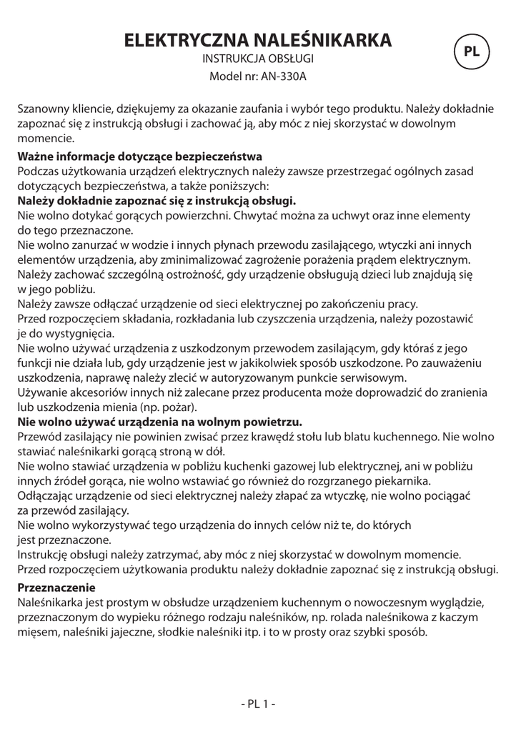 ELEKTRYCZNA NALEŚNIKARKA INSTRUKCJA OBSŁUGI Model nr: AN-330A PL Szanowny kliencie, dziękujemy za okazanie zaufania i wybór tego produktu. Należy dokładnie zapoznać się z instrukcją obsługi i zachować ją, aby móc z niej skorzystać w dowolnym momencie. Ważne informacje dotyczące bezpieczeństwa Podczas użytkowania urządzeń elektrycznych należy zawsze przestrzegać ogólnych zasad dotyczących bezpieczeństwa, a także poniższych: Należy dokładnie zapoznać się z instrukcją obsługi. Nie wolno dotykać gorących powierzchni. Chwytać można za uchwyt oraz inne elementy do tego przeznaczone. Nie wolno zanurzać w wodzie i innych płynach przewodu zasilającego, wtyczki ani innych elementów urządzenia, aby zminimalizować zagrożenie porażenia prądem elektrycznym. Należy zachować szczególną ostrożność, gdy urządzenie obsługują dzieci lub znajdują się w jego pobliżu. Należy zawsze odłączać urządzenie od sieci elektrycznej po zakończeniu pracy. Przed rozpoczęciem składania, rozkładania lub czyszczenia urządzenia, należy pozostawić je do wystygnięcia. Nie wolno używać urządzenia z uszkodzonym przewodem zasilającym, gdy któraś z jego funkcji nie działa lub, gdy urządzenie jest w jakikolwiek sposób uszkodzone. Po zauważeniu uszkodzenia, naprawę należy zlecić w autoryzowanym punkcie serwisowym. Używanie akcesoriów innych niż zalecane przez producenta może doprowadzić do zranienia lub uszkodzenia mienia (np. pożar). Nie wolno używać urządzenia na wolnym powietrzu. Przewód zasilający nie powinien zwisać przez krawędź stołu lub blatu kuchennego. Nie wolno stawiać naleśnikarki gorącą stroną w dół. Nie wolno stawiać urządzenia w pobliżu kuchenki gazowej lub elektrycznej, ani w pobliżu innych źródeł gorąca, nie wolno wstawiać go również do rozgrzanego piekarnika. Odłączając urządzenie od sieci elektrycznej należy złapać za wtyczkę, nie wolno pociągać za przewód zasilający. Nie wolno wykorzystywać tego urządzenia do innych celów niż te, do których jest przeznaczone. Instrukcję obsługi należy zatrzymać, aby móc z niej skorzystać w dowolnym momencie. Przed rozpoczęciem użytkowania produktu należy dokładnie zapoznać się z instrukcją obsługi. Przeznaczenie Naleśnikarka jest prostym w obsłudze urządzeniem kuchennym o nowoczesnym wyglądzie, przeznaczonym do wypieku różnego rodzaju naleśników, np. rolada naleśnikowa z kaczym mięsem, naleśniki jajeczne, słodkie naleśniki itp. i to w prosty oraz szybki sposób. - PL 1 - Popis částí výrobku: Opis elementów produktu: Powierzchnia robocza Pečící plocha Wyłącznik Vypínač Uchwyt Rukojeť Misa nana ciasto Miska těsto Przewód Přívodnízasilający kabel Model nr Výrobek č. Moc: Napięcie zasilania: Temperatura powierzchni Výkon Napětí Teplota povrchu roboczej: 800 W 220-240 V 210 °C 800 W 220-240 V 210°C Częstotliwość: Frekvence AN-330A 50 Hz/60 Hz AN-330A 50 Hz/60 Hz Návod k použití Instrukcja obsługi Tento výrobek určen pouze pro použitído v domácnosti. Produkt ten jestjeprzeznaczony wyłącznie użytku w gospodarstwie domowym. Začínáme Na początek Z výrobku zbytkywszystkie balení a ochranné fólie. produktuodstraňte należy usunąć pozostałości opakowania. Navlhčeným látkou či houbičkou z pečící plochy setřete případný prach.lub Plochu Zetrzyj prochhadříkem, mogący znajdować się na powierzchni roboczej nawilżoną szmatką gąbką. následně do sucharoboczą jemnounależy látkovou či papírovou kuchyňskou utěrkou. místo, Następnieutřete powierzchnię wytrzeć do sucha miękką szmatką lubVyberte papierowym na kterém výrobek používat. Kolem spotřebiče bysteurządzenia měli nechatnależy dostatek volného ręcznikiem. Wybierzbudete lokalizację dla produktu. W sąsiedztwie zabezpieczyć místa, abyste umožnili odvádění tepla a předešli poškozeníciepła zdí či kuchyňských skříněk. Zapojte odpowiednią ilość miejsca, aby umożliwić odprowadzanie i uniknąć uszkodzenia zástrčku elektrické zásuvky poté spotřebič zapněte. Rozsvítí seičervené kontrolní světlo, mebli lubdo pokrycia ścian. Włóż awtyczkę do gniazdka elektrycznego załącz urządzenie. Zapali které značí, želampka, je spotřebič v pracovním režimu. Výrobek je vybaven termostatem, který se się czerwona co oznacza, że urządzenie zostało uruchomione. Produkt posiada vtermostat, průběhu który používání výrobku budesteruje opakovaně zapínati awyłączaniem vypínat, čímžgrzałki, spotřebič bude udržopodczas wypieku załączaniem i w związku vat ideální teplotubędzie pro přípravu pokrmu a zároveň bude chráněn před přehřátím. Po použití z tym urządzenie utrzymywać idealną temperaturę do przygotowania potrawy a spotřebič vypněte, odpojte z elektrické zásuvky a před ho nechte při jednocześnie będzie chronione przed przegrzaniem. Počištěním zakończeniu pracyvychladnout należy wyłączyć pokojové teplotě. urządzenie, odłączyć je od sieci elektrycznej i pozostawić do wystygnięcia. Ważne ostrzeżenia: Důležitá upozornění: Uwaga: Pozor: 1. Po rozpakowaniu należy wyrzucić do kosza worek foliowy, którymTímto produkt był zapakow1) rozbalení výrobku vyhoďte igelitový sáček, ve které byl w zabalen. zabráníte dětem, any, aby zminimalizować ryzyko uduszenia się w trakcie dziecięcej zabawy. aby si s ním začaly hrát a mohly se nechtěně udusit. 2. Nie wolno neponořujte zanurzać urządzenia wodzie ani w jiné jakimkolwiek – ich wniknięcie 2) Spotřebič do vodyw nebo jakékoliv tekutiny –innym mohlypłynie by proniknout do do wnętrza może doprowadzić to powstania zwarcia. Gdy woda dostanie się wnętrza vnitřní části a způsobit elektrický zkrat. Pokud do spotřebiče voda již pronikla,do znovu ho urządzenia, go załączać do sieci elektrycznej na aniservisním 