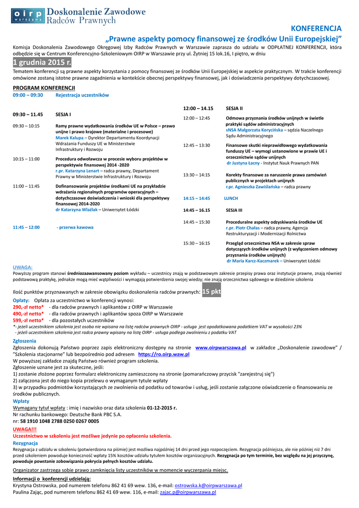 KONFERENCJA „Prawne aspekty pomocy finansowej ze środków Unii Europejskiej” Komisja Doskonalenia Zawodowego Okręgowej Izby Radców Prawnych w Warszawie zaprasza do udziału w ODPŁATNEJ KONFERENCJI, która odbędzie się w Centrum Konferencyjno-Szkoleniowym OIRP w Warszawie przy ul. Żytniej 15 lok.16, I piętro, w dniu 1 grudnia 2015 r. Tematem konferencji są prawne aspekty korzystania z pomocy finansowej ze środków Unii Europejskiej w aspekcie praktycznym. W trakcie konferencji omówione zostaną istotne prawne zagadnienia w kontekście obecnej perspektywy finansowej, jak i doświadczenia perspektywy dotychczasowej. PROGRAM KONFERENCJI 09:00 – 09:30 Rejestracja uczestników 09:30 – 11.45 SESJA I 09:30 – 10:15 Ramy prawne wydatkowania środków UE w Polsce – prawo unijne i prawo krajowe (materialne i procesowe) Marek Kalupa – Dyrektor Departamentu Koordynacji Wdrażania Funduszy UE w Ministerstwie Infrastruktury i Rozwoju 10:15 – 11:00 11:00 – 11:45 11:45 – 12:00 Procedura odwoławcza w procesie wyboru projektów w perspektywie finansowej 2014 -2020 r.pr. Katarzyna Lenart – radca prawny, Departament Prawny w Ministerstwie Infrastruktury i Rozwoju Dofinansowanie projektów środkami UE na przykładzie wdrażania regionalnych programów operacyjnych – dotychczasowe doświadczenia i wnioski dla perspektywy finansowej 2014-2020 dr Katarzyna Wlaźlak – Uniwersytet Łódzki 12:00 – 14.15 SESJA II 12:00 – 12:45 Odmowa przyznania środków unijnych w świetle praktyki sądów administracyjnych sNSA Małgorzata Korycińska – sędzia Naczelnego Sądu Administracyjnego 12:45 – 13:30 Finansowe skutki nieprawidłowego wydatkowania funduszy UE – wymogi ustanowione w prawie UE i orzecznictwie sądów unijnych dr Justyna Łacny - Instytut Nauk Prawnych PAN 13:30 – 14:15 Korekty finansowe za naruszenie prawa zamówień publicznych w projektach unijnych r.pr. Agnieszka Zawiślańska – radca prawny 14:15 – 14:45 LUNCH 14:45 – 16.15 SESJA III 14:45 – 15:30 Proceduralne aspekty odzyskiwania środków UE r.pr. Piotr Chałas – radca prawny, Agencja Restrukturyzacji i Modernizacji Rolnictwa 15:30 – 16:15 Przegląd orzecznictwa NSA w zakresie spraw dotyczących środków unijnych (z wyłączeniem odmowy przyznania środków unijnych) dr Maria Karcz-Kaczmarek – Uniwersytet Łódzki - przerwa kawowa UWAGA: Powyższy program stanowi średniozaawansowany poziom wykładu – uczestnicy znają w podstawowym zakresie przepisy prawa oraz instytucje prawne, znają również podstawową praktykę, jednakże mogą mieć wątpliwości i wymagają potwierdzenia swojej wiedzy; nie znają orzecznictwa sądowego w dziedzinie szkolenia Ilość punktów przyznawanych w zakresie obowiązku doskonalenia radców prawnych: 15 pkt .\ Opłaty: Opłata za uczestnictwo w konferencji wynosi: 290,-zł netto* - dla radców prawnych i aplikantów z OIRP w Warszawie 490,-zł netto* - dla radców prawnych i aplikantów spoza OIRP w Warszawie 599,-zł netto* - dla pozostałych uczestników *- jeżeli uczestnikiem szkolenia jest osoba nie wpisana na listę radców prawnych OIRP - usługa jest opodatkowana podatkiem VAT w wysokości 23% - jeżeli uczestnikiem szkolenia jest radca prawny wpisany na listę OIRP - usługa podlega zwolnieniu z podatku VAT Zgłoszenia Zgłoszenia dokonują Państwo poprzez zapis elektroniczny dostępny na stronie www.oirpwarszawa.pl w zakładce „Doskonalenie zawodowe” / ”Szkolenia stacjonarne” lub bezpośrednio pod adresem https://ro.oirp.waw.pl W powyższej zakładce znajdą Państwo również program szkolenia. Zgłoszenie uznane jest za skuteczne, jeśli: 1) zostanie złożone poprzez formularz elektroniczny zamieszczony na stronie (pomarańczowy przycisk "zarejestruj się") 2) załączona jest do niego kopia przelewu o wymaganym tytule wpłaty 3) w przypadku podmiotów korzystających ze zwolnienia od podatku od towarów i usług, jeśli zostanie załączone oświadczenie o finansowaniu ze środków publicznych. Wpłaty Wymagany tytuł wpłaty : imię i nazwisko oraz data szkolenia 01-12-2015 r. Nr rachunku bankowego: Deutsche Bank PBC S.A. nr: 58 1910 1048 2788 0250 0267 0005 UWAGA!!! Uczestnictwo w szkoleniu jest możliwe jedynie po opłaceniu szkolenia. Rezygnacja Rezygnacja z udziału w szkoleniu (potwierdzona na piśmie) jest możliwa najpóźniej 14 dni przed jego rozpoczęciem. Rezygnacja późniejsza, ale nie później niż 7 dni przed szkoleniem powoduje konieczność wpłaty 15% kosztów udziału tytułem kosztów organizacyjnych. Rezygnacja po tym terminie, bez względu na jej przyczynę, powoduje powstanie zobowiązania pokrycia pełnych kosztów udziału. Organizator zastrzega sobie prawo zamknięcia listy uczestników w momencie wyczerpania miejsc. Informacji o konferencji udzielają: Krystyna Ostrowska, pod numerem telefonu 862 41 69 wew. 136, e-mail: [email protected] Paulina Zając, pod numerem telefonu 862 41 69 wew. 116, e-mail: [email protected]