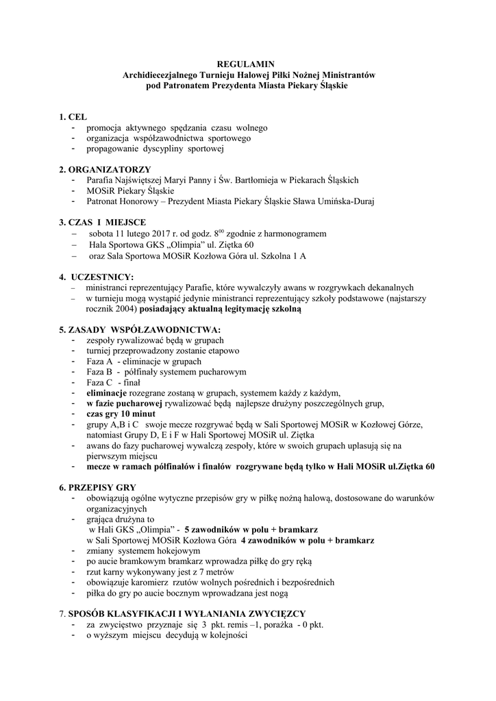 REGULAMIN Archidiecezjalnego Turnieju Halowej Piłki Nożnej Ministrantów pod Patronatem Prezydenta Miasta Piekary Śląskie 1. CEL - promocja aktywnego spędzania czasu wolnego - organizacja współzawodnictwa sportowego - propagowanie dyscypliny sportowej 2. ORGANIZATORZY - Parafia Najświętszej Maryi Panny i Św. Bartłomieja w Piekarach Śląskich - MOSiR Piekary Śląskie - Patronat Honorowy – Prezydent Miasta Piekary Śląskie Sława Umińska-Duraj 3. CZAS I MIEJSCE sobota 11 lutego 2017 r. od godz. 800 zgodnie z harmonogramem Hala Sportowa GKS „Olimpia” ul. Ziętka 60 oraz Sala Sportowa MOSiR Kozłowa Góra ul. Szkolna 1 A 4. UCZESTNICY: ministranci reprezentujący Parafie, które wywalczyły awans w rozgrywkach dekanalnych w turnieju mogą wystąpić jedynie ministranci reprezentujący szkoły podstawowe (najstarszy rocznik 2004) posiadający aktualną legitymację szkolną 5. ZASADY WSPÓŁZAWODNICTWA: - zespoły rywalizować będą w grupach - turniej przeprowadzony zostanie etapowo - Faza A - eliminacje w grupach - Faza B - półfinały systemem pucharowym - Faza C - finał - eliminacje rozegrane zostaną w grupach, systemem każdy z każdym, - w fazie pucharowej rywalizować będą najlepsze drużyny poszczególnych grup, - czas gry 10 minut - grupy A,B i C swoje mecze rozgrywać będą w Sali Sportowej MOSiR w Kozłowej Górze, natomiast Grupy D, E i F w Hali Sportowej MOSiR ul. Ziętka - awans do fazy pucharowej wywalczą zespoły, które w swoich grupach uplasują się na pierwszym miejscu - mecze w ramach półfinałów i finałów rozgrywane będą tylko w Hali MOSiR ul.Ziętka 60 6. PRZEPISY GRY - obowiązują ogólne wytyczne przepisów gry w piłkę nożną halową, dostosowane do warunków organizacyjnych - grająca drużyna to w Hali GKS „Olimpia” - 5 zawodników w polu + bramkarz w Sali Sportowej MOSiR Kozłowa Góra 4 zawodników w polu + bramkarz - zmiany systemem hokejowym - po aucie bramkowym bramkarz wprowadza piłkę do gry ręką - rzut karny wykonywany jest z 7 metrów - obowiązuje karomierz rzutów wolnych pośrednich i bezpośrednich - piłka do gry po aucie bocznym wprowadzana jest nogą 7. SPOSÓB KLASYFIKACJI I WYŁANIANIA ZWYCIĘZCY - za zwycięstwo przyznaje się 3 pkt. remis –1, porażka - 0 pkt. - o wyższym miejscu decydują w kolejności - ilość zdobytych punktów, wynik bezpośredniego meczu, lepsza różnica bramek, większa ilość strzelonych bramek, rzuty karne. w fazie pucharowej musi wyłoniony być zwycięzca, stąd w przypadku remisu wykonywane będą rzuty karne, seria 3, a w dalszej kolejności po 1 aż do skutku 6.SĘDZIOWIE: - sędziów rozgrywek zabezpiecza organizator 7. NAGRODY: - wyróżnienia dla 3 najlepszych drużyn - dyplomy dla wszystkich drużyn - wyróżnienia dla najlepszego bramkarza, strzelca i zawodnika fazy finałowej 8. UBEZPIECZENIE - drużyny ubezpiecza organizator 9. SPRAWY ORGANIZACYJNE: - opiekunowie drużyn zobowiązani są do przedstawienia wykazu zawodników zawierającego numery legitymacji szkolnych. Wykaz powinien być potwierdzony przez Proboszcza macierzystej Parafii. - ze względów organizacyjnych prosimy o przestrzeganie wyznaczonych terminów, punktualne zgłaszanie się na parkiecie czas oczekiwania na drużynę nie może przekroczyć 5 minut. - w przypadkach spornych lub nie objętych regulaminem ostateczną decyzję, bez prawa wnoszenia odwołania, podejmują przedstawiciele organizatorów - ksiądz Adam Zgodzaj - Parafia NMP i Św. Bartłomieja w Piekarach Śląskich - Krzysztof Seweryn - MOSiR Piekary Śląskie