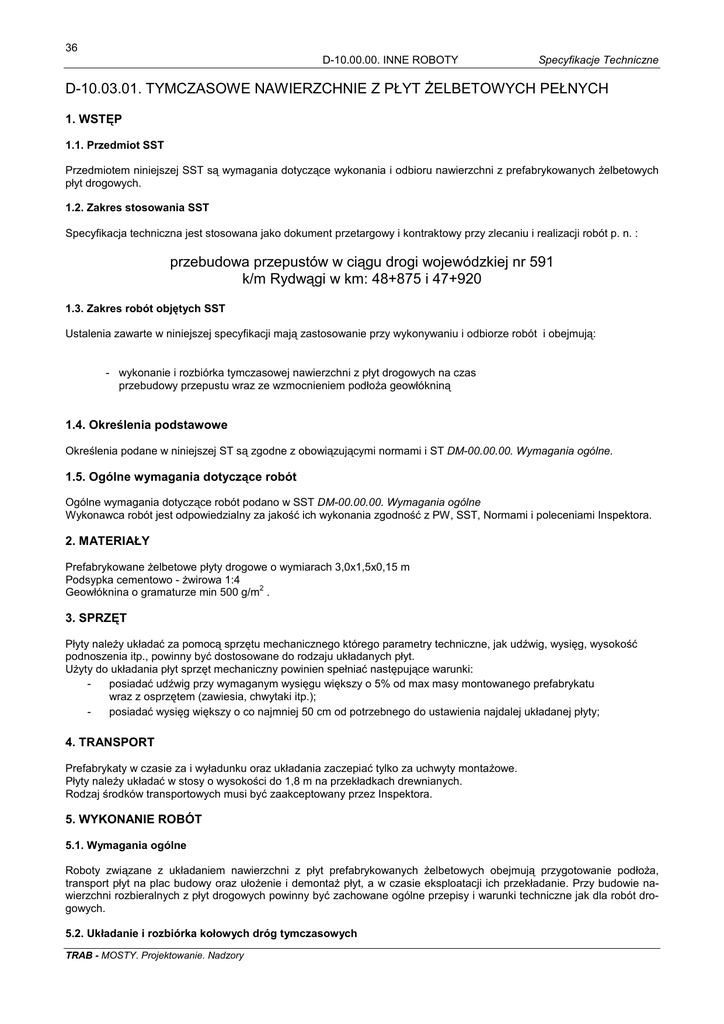 36 D-10.00.00. INNE ROBOTY Specyfikacje Techniczne D-10.03.01. TYMCZASOWE NAWIERZCHNIE Z PŁYT ŻELBETOWYCH PEŁNYCH 1. WSTĘP 1.1. Przedmiot SST Przedmiotem niniejszej SST są wymagania dotyczące wykonania i odbioru nawierzchni z prefabrykowanych żelbetowych płyt drogowych. 1.2. Zakres stosowania SST Specyfikacja techniczna jest stosowana jako dokument przetargowy i kontraktowy przy zlecaniu i realizacji robót p. n. : przebudowa przepustów w ciągu drogi wojewódzkiej nr 591 k/m Rydwągi w km: 48+875 i 47+920 1.3. Zakres robót objętych SST Ustalenia zawarte w niniejszej specyfikacji mają zastosowanie przy wykonywaniu i odbiorze robót i obejmują: - wykonanie i rozbiórka tymczasowej nawierzchni z płyt drogowych na czas przebudowy przepustu wraz ze wzmocnieniem podłoża geowłókniną 1.4. Określenia podstawowe Określenia podane w niniejszej ST są zgodne z obowiązującymi normami i ST DM-00.00.00. Wymagania ogólne. 1.5. Ogólne wymagania dotyczące robót Ogólne wymagania dotyczące robót podano w SST DM-00.00.00. Wymagania ogólne Wykonawca robót jest odpowiedzialny za jakość ich wykonania zgodność z PW, SST, Normami i poleceniami Inspektora. 2. MATERIAŁY Prefabrykowane żelbetowe płyty drogowe o wymiarach 3,0x1,5x0,15 m Podsypka cementowo - żwirowa 1:4 2 Geowłóknina o gramaturze min 500 g/m . 3. SPRZĘT Płyty należy układać za pomocą sprzętu mechanicznego którego parametry techniczne, jak udźwig, wysięg, wysokość podnoszenia itp., powinny być dostosowane do rodzaju układanych płyt. Użyty do układania płyt sprzęt mechaniczny powinien spełniać następujące warunki: posiadać udźwig przy wymaganym wysięgu większy o 5% od max masy montowanego prefabrykatu wraz z osprzętem (zawiesia, chwytaki itp.); posiadać wysięg większy o co najmniej 50 cm od potrzebnego do ustawienia najdalej układanej płyty; 4. TRANSPORT Prefabrykaty w czasie za i wyładunku oraz układania zaczepiać tylko za uchwyty montażowe. Płyty należy układać w stosy o wysokości do 1,8 m na przekładkach drewnianych. Rodzaj środków transportowych musi być zaakceptowany przez Inspektora. 5. WYKONANIE ROBÓT 5.1. Wymagania ogólne Roboty związane z układaniem nawierzchni z płyt prefabrykowanych żelbetowych obejmują przygotowanie podłoża, transport płyt na plac budowy oraz ułożenie i demontaż płyt, a w czasie eksploatacji ich przekładanie. Przy budowie nawierzchni rozbieralnych z płyt drogowych powinny być zachowane ogólne przepisy i warunki techniczne jak dla robót drogowych. 5.2. Układanie i rozbiórka kołowych dróg tymczasowych TRAB - MOSTY. Projektowanie. Nadzory 37 Specyfikacje Techniczne D-10.00.00. INNE ROBOTY Korpus drogi powinien być odwodniony i wyprofilowany. Warstwa odsączająca z piasku gr. 20 cm na geowłókninie powinna być wyprofilowana bez zagłębień i wybrzuszeń większych niż 2 cm. Płyty drogowe należy układać na warstwie wyrównawczej z podsypki cementowo żwirowej 1:4 grubości 5 cm i na szerokość przewidzianą w projekcie przy użyciu dźwigu z zachowaniem minimalnych szczelin stykowych. Szczeliny stykowe (spoiny) o rozstawie do 1 cm między płytami należy zamulić piaskiem a na łukach wypełnić tłuczniem. W połączeniach z konstrukcją drogi należy zastosować beton asfaltowy . 5.3. Konserwacja nawierzchni z płyt Nawierzchnia powinna być w czasie eksploatacji na bieżąco utrzymana poprzez: przekładanie lub wymiana płyt sklawiszowanych, zniszczonych pod wpływem ruchu; zamulenie szczelin piaskiem, uzupełnienie przerw pomiędzy płytami tłuczniem lub betonem asfaltowym; 5.4. Układanie rur osłonowych Przebiegające uzbrojenie podziemne pod projektowaną jezdnią tymczasową należy ochronić dwudzielnymi rurami osłonowymi w obsypce piaskowej lub żwirowej grub. 15 cm. 6. KONTROLA JAKOŚCI ROBÓT 6.1. Badania przed przystąpieniem do robót Każda płyta (prefabrykat) musi posiadać deklarację zgodności wydaną przez Producenta. Ponadto Producent winien przedłożyć Wykonawcy: Protokóły badań jakości cementu, kruszywa i wody. Receptury mieszanki betonowej. Protokóły badań jakości betonu - wytrzymałość na ściskanie, nasiąkliwość, wodoszczelność, mrozoodporność. Odbiorca w czasie odbioru ma prawo dokonania badań betonu metodami nieniszczącymi na wybranych losowo prefabrykatach. W przypadku kwestionowania rzetelności badań laboratoryjnych prowadzonych przez Producenta lub przedstawionych przez niego Deklaracji zgodności, Kupujący prefabrykaty ma prawo do zlecenia niezależnej jednostce wykonania badań sprawdzających. Jeżeli badania sprawdzające potwierdzą zastrzeżenia Kupującego, koszt tych badań obciąża Producenta prefabrykatów, a zakwestionowane wyroby zostaną zwrócone. Związane z tym koszty ponosi Producent prefabrykatów. Inspektor ma prawo do udziału w badaniach i odbiorach prefabrykatów, przeznaczonych na nadzorowaną przez niego budową. Brak zgłoszenia zastrzeżeń przez Inspektora w trakcie dokonywanych odbiorów prefabrykatów przy jego udziale, wyklucza wyżej opisane postępowanie reklamacyjne. 6.2. Badania w czasie robót Częstotliwość i zakres badań kontrolnych należy prowadzić według tabeli: Częstotliwość badań Lp Wyszczególnienie 1 Badania podłoża 2 Deklaracja zgodności Minimalna ilość badań na dziennej działce roboczej Max powierzchnia nawierzchni przypadającej na jedno badanie 2 300 m 2 Dla każdej partii dostawy oraz na każde żądanie Inspektora Przy odbiorze płyt na budowie należy: sprawdzić zgodność z wykazem liczby i typów; sprawdzić stan techniczny; sporządzić protokół w przypadku uszkodzeń . 6.3. Badania i pomiary wykonanej nawierzchni Nierówności podłużne nawierzchni należy mierzyć 4–metrową łatą w osi jezdni. Nierówności poprzeczne i podłużne nie powinny przekraczać 20 mm. Spadki poprzeczne mogą wykazywać tolerancje względem projektu o ± 0,5%. Rzędne w osi jezdni i na jej kraw