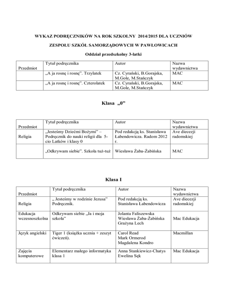 WYKAZ PODRĘCZNIKÓW NA ROK SZKOLNY 2014/2015 DLA UCZNIÓW ZESPOŁU SZKÓŁ SAMORZĄDOWYCH W PAWŁOWICACH Oddział przedszkolny 3-latki Tytuł podręcznika Autor „A ja rosnę i rosnę”. Trzylatek Cz. Cyrański, B.Gorajska, M.Gole, M.Stańczyk Cz. Cyrański, B.Gorajska, M.Gole, M.Stańczyk Przedmiot „A ja rosnę i rosnę”. Czterolatek Nazwa wydawnictwa MAC MAC Klasa „0” Tytuł podręcznika Autor „Jesteśmy Dziećmi Bożymi” – Podręcznik do nauki religii dla 5cio Latków i klasy 0 Pod redakcją ks. Stanisława Łabendowicza. Radom 2012 r. Przedmiot Religia „Odkrywam siebie”. Szkoła tuż-tuż Wiesława Żaba-Żabińska Nazwa wydawnictwa Ave diecezji radomskiej MAC Klasa I Tytuł podręcznika Autor „ Jesteśmy w rodzinie Jezusa” Podręcznik. Pod redakcją ks. Stanisława Łabendowicza Przedmiot Religia Nazwa wydawnictwa Ave diecezji radomskiej Edukacja Odkrywam siebie „Ja i moja wczesnoszkolna szkoła” Jolanta Faliszewska Wiesława Żaba-Żabińska Grażyna Lech Język angielski Tiger 1 (książka ucznia + zeszyt ćwiczeń). Carol Read Mark Ormerod Magdalena Kondro Macmillan Zajęcia komputerowe Elementarz małego informatyka klasa 1 Anna Stankiewicz-Chatys Ewelina Sęk Mac Edukacja Mac Edukacja Klasa II Tytuł podręcznika Autor Religia „Kochamy Pana Jezusa” Podręcznik + zeszyt ćwiczeń ks. Stanisław Łabendowicz Radom 2012 r. Język angielski „English Adventure 2” Zajęcia komputerowe Elementarz małego informatyka. Klasa 2. Cristiana Bruni Anna Worrall Anna Stankiewicz-Chatys Ewelina Sęk Wydawnictwo Pearson Mac. Edukacja Jolanta Faliszewska Wiesława Żaba-Żabińska Grażyna Lech Mac Edukacja Przedmiot Edukacja Okrywam siebie „Ja i moja wczesnoszkolna szkoła” Nazwa wydawnictwa Ave diecezji radomskiej Klasa III Tytuł podręcznika Autor „Przyjmujemy Pana Jezusa” podręcznik i zeszyt ćwiczeń Edukacja Odkrywam siebie „Ja i moja wczesnoszkolna szkoła” ks. Stanisław Łabendowicz Nazwa wydawnictwa Ave diecezji radomskiej Jolanta Faliszewska Mac Edukacja Język angielski „English Adrenture 3” Zajęcia komputerowe Zajęcia komputerowe – Podręcznik z ćwiczeniami cz. 3. Anna Worrall Mariola Bogucka Ewa Stolarczyk Wydawnictwo Pearson Wyd. Szkolne PWN Przedmiot Religia Klasa IV Przedmiot Tytuł podręcznika Autor Nazwa wydawnictwa „Jestem chrześcijaninem”podręcznik + zeszyt ćwiczeń Ks. Stanisław Łebendowicz Radom 2012 r. Ave diecezji radomskiej Discover English STARTER Książka ucznia Zeszyt Ćwiczeń “My i historia” – podręcznik “My i historia” - ćwiczeniówka Catherine Bright Kate Wakeman Longman Wiesława Surdyk – Fertsch, Bogumiła Szeweluk – Wyrwa Wydawnictwo PWN „Przygoda z czytaniem” - Zapraszamy na słówko Piotr Zbróg, Małgorzata Jas Wydawnictwo MAC „Przygoda z pisaniem” cz. 1 i 2 Piotr Zbróg, Małgorzata Jas Matematyka Podręcznik „Matematyka 2001” 4 Zbiór zadań WSiP Przyroda Podręcznik dla klasy czwartej szkoły podstawowej – „Tajemnice przyrody”. Zeszyt ćwiczeń cz. 1 i 2 . „Muzyczny Świat” 4 klasa Podręcznik (NOWOŚĆ ! ) „Muzyczny Świat” – 4 klasa Zeszyt ćwiczeń (NOWOŚĆ !) „Lubię tworzyć”- podręcznik klasa 4 (NOWOŚĆ !) „Zajęcia techniczne- część komunikacyjna” Jerzy Chodnicki Krystyna Dałek Mirosław Dąbrowski Maria Marko-Worłowska Feliks Szlajfer Joanna Stwarz Teresa Wójcik MAC Edukacja Wojciech Sygut Marzena Kwiecień Urszula Białka Jerzy Chrabąszcz MAC Edukacja M.Gulgowski J.Lipski Czarny Kruk Religia Język angielski Historia Język polski Muzyka Plastyka Zajęcia techniczne Zajęcia „Komputerowe opowieści „ komputerowe podręcznik Nowa Era OPERON Klasa V Tytuł podręcznika Autor Nazwa wydawnictwa „Wierzę w Boga”- podręcznik i zeszyt ćwiczeń „Discover English 2 książka ucznia” „Discover English 2 zeszyt ćwiczeń „My i historia” – podręcznik „My i historia” - ćwiczeniówka Ks. Stanisław Łabendowicz Ave diecezji radomskiej Pearson Wiesława Surdyk – Fertsch Bogumiła Szeweluk – Wyrwa. Wydawnictwo PWN „Przygoda z czytaniem. Zapraszamy na słówko” kl. V – podręcznik. „Przygoda z pisaniem. Zapraszamy na słówko” k. V część I i II. Piotr Zbróg Małgorzata Janas MAC Edukacja Przyroda Podręcznik dla klasy piątej szkoły podstawowej „Tajemnice przyrody” zeszyt ćwiczeń część 1 i część 2. J. Ślósarczyk R. Kozik F. Szlajfer Nowa Era Matematyka Podręcznik Matematyka 2001 Zeszyt ćwiczeń cz.1 i 2 kl. V Matematyka 2001 „Zajęcia techniczne – część techniczna” J. Chodnicki M. Dąbrowski Agnieszka Pfeiffer Urszula Białka WSiP Zajęcia komputerowe „Komputerowe opowieści „ podręcznik M.Gulgowski J.Lipski Czarny Kruk Muzyka T. Wójcik Mac Edukacja W. Sygut M. Kwiecień Mac Edukacja Przedmiot Religia Język angielski Historia Język polski Technika Plastyka „Muzyczny Świat” (nowość !) Podręcznik + zeszyt ćwiczeń klasa 5. „Lubię tworzyć” (nowość !) Podręcznik klasa 5 J. Wildman I. Hearn M.Bogucka Piotr Zbróg Małgorzata Janas Wydawnictwo Operon Klasa VI Tytuł podręcznika Autor Nazwa wydawnictwa Ks. Stanisaw Łabendowicz Ave diecezji radomskiej Przedmiot „Uświęceni w Duchu Świętym” – Religia podręcznik + zeszyt ćwiczeń „Discover English 3 książka Język ucznia” angielski „Discover English 3 zeszyt ćwiczeń Język polski „Przygoda z czytaniem” – Zapraszamy na słówko – podręcznik. Zeszyt ćwiczeń cz. I i II „Przygoda z pisaniem” Zapraszamy na słówko Przyroda Podręcznik „Tajemnice przyrody” Historia Zeszyt ćwiczeń część 1 i 2 „My i historia” – podręcznik „My i historia” – ćwiczeniówka Matematyka Podręcznik „Matematyka 2001” 6 Zbiór zadań Informatyka „Informatyka 2000” – podręcznik Plastyka Muzyka „Lubię tworzyć” podręcznik klasa 6 (nowość!) „Muzyczny Świat”- podręcznik klasa 6 (nowość!) Zeszyt ćwiczeń klasa 6 J. Wildman M.Bogucka Wydawnictwo