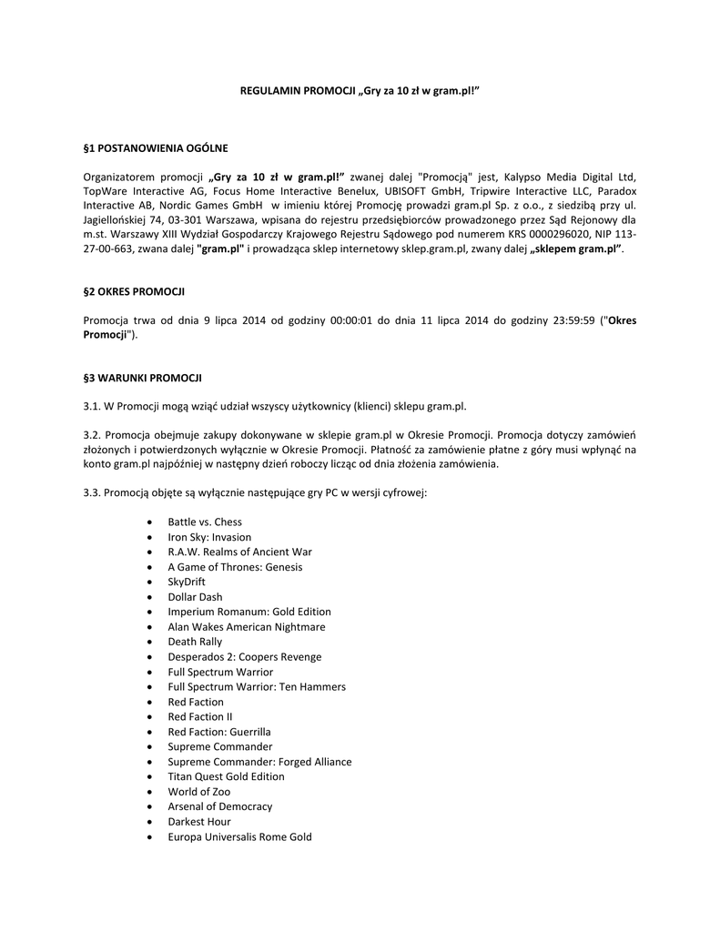 Organizatorem promocji „Gry za 10 zł w gram.pl!” zwanej dalej "Promocją" jest, Kalypso Media Digital Ltd,