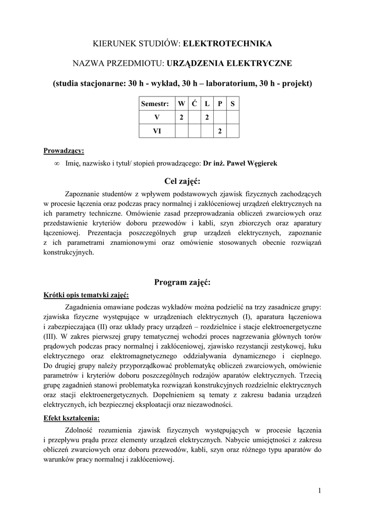 KIERUNEK STUDIÓW: ELEKTROTECHNIKA NAZWA PRZEDMIOTU: URZĄDZENIA ELEKTRYCZNE (studia stacjonarne: 30 h - wykład, 30 h – laboratorium, 30 h - projekt) Semestr: V W Ć L 2 2 VI P S 2 Prowadzący: • Imię, nazwisko i tytuł/ stopień prowadzącego: Dr inż. Paweł Węgierek Cel zajęć: Zapoznanie studentów z wpływem podstawowych zjawisk fizycznych zachodzących w procesie łączenia oraz podczas pracy normalnej i zakłóceniowej urządzeń elektrycznych na ich parametry techniczne. Omówienie zasad przeprowadzania obliczeń zwarciowych oraz przedstawienie kryteriów doboru przewodów i kabli, szyn zbiorczych oraz aparatury łączeniowej. Prezentacja poszczególnych grup urządzeń elektrycznych, zapoznanie z ich parametrami znamionowymi oraz omówienie stosowanych obecnie rozwiązań konstrukcyjnych. Program zajęć: Krótki opis tematyki zajęć: Zagadnienia omawiane podczas wykładów można podzielić na trzy zasadnicze grupy: zjawiska fizyczne występujące w urządzeniach elektrycznych (I), aparatura łączeniowa i zabezpieczająca (II) oraz układy pracy urządzeń – rozdzielnice i stacje elektroenergetyczne (III). W zakres pierwszej grupy tematycznej wchodzi proces nagrzewania głównych torów prądowych podczas pracy normalnej i zakłóceniowej, zjawisko rezystancji zestykowej, łuku elektrycznego oraz elektromagnetycznego oddziaływania dynamicznego i cieplnego. Do drugiej grupy należy przyporządkować problematykę obliczeń zwarciowych, omówienie parametrów i kryteriów doboru poszczególnych rodzajów aparatów elektrycznych. Trzecią grupę zagadnień stanowi problematyka rozwiązań konstrukcyjnych rozdzielnic elektrycznych oraz stacji elektroenergetycznych. Dopełnieniem są tematy z zakresu badania urządzeń elektrycznych, ich bezpiecznej eksploatacji oraz niezawodności. Efekt kształcenia: Zdolność rozumienia zjawisk fizycznych występujących w procesie łączenia i przepływu prądu przez elementy urządzeń elektrycznych. Nabycie umiejętności z zakresu obliczeń zwarciowych oraz doboru przewodów, kabli, szyn oraz różnego typu aparatów do warunków pracy normalnej i zakłóceniowej. 1 Wykład: Zawartość tematyczna poszczególnych godzin wykładowych 1. Liczba godzin Podstawowe pojęcia i definicje. Kryteria podziału i klasyfikacja urządzeń, środowiskowe i techniczne warunki eksploatacji 2 Nagrzewanie torów prądowych: źródła ciepła, wpływ temperatury na właściwości materiałów, formy przekazywania ciepła, termiczne oddziaływanie prądów roboczych i zakłóceniowych, obciążalność prądowa długotrwała i w warunkach zakłóceniowych 2 Zestyki elektryczne: rezystancja zestykowa, konstrukcje styków i ich nagrzewanie, obciążalność prądowa w warunkach pracy normalnej i zakłóceniowej, materiały stykowe 2 Zjawisko łuku elektrycznego: właściwości, charakterystyki statyczne i dynamiczne dla prądu stałego i prądu przemiennego w obwodach o różnym charakterze obciążenia 2 5. Metody gaszenia łuku elektrycznego prądu stałego i przemiennego 2 6. Obliczenia zwarciowe: cel przeprowadzania, schemat postępowania, impedancje zwarciowe poszczególnych urządzeń, rodzaje prądów zwarciowych i sposoby wyznaczania ich wartości 2 Aparatura łączeniowa: kryteria podziału i rodzaje aparatów, budowa, elementy składowe, parametry techniczne i zasady doboru poszczególnych rodzajów 2 8. Aparatura łączeniowa: przykłady aparatów i ich cechy charakterystyczne 2 9. Przekładniki prądowe i napięciowe: parametry, kryteria doboru, układy pracy i ich możliwości pomiarowe oraz przeznaczenie 2 10. Przewody, kable i szyny zbiorcze: budowa i zasady oznaczania, kryteria doboru 2 11. Rozdzielnice elektryczne niskiego i średniego napięcia: podstawowe rozwiązania konstrukcyjne, rodzaje obudów i wyposażenie, przykłady wykonań, parametry i zasady doboru 2 12. Stacje elektroenergetyczne: podział, i bezszynowe układy połączeń 2 2. 3. 4. 7. elementy składowe, szynowe 13. Małogabarytowe stacje transformatorowo – rozdzielcze: przykładowe rozwiązania, ich zalety, wady i przeznaczenie 2 14. Badania okresowe i diagnostyczne urządzeń elektrycznych, Niezawodność aparatów i układów elektrycznych. Ochrona przeciwporażeniowa w urządzeniach elektrycznych 2 15. Zasady realizacji procesu budowlanego w branży elektrycznej: wymagane kwalifikacje i rodzaje potwierdzających je uprawień, odpowiedzialność zawodowa 2 2 Laboratorium: W programie przewidziano wykonanie 12-tu ćwiczeń laboratoryjnych swoim zakresem odpowiadających tematyce wykładów: Badanie właściwości łuku prądu stałego – charakterystyki statyczne Gaszenie łuku elektrycznego z wykorzystaniem wydmuchu elektromagnetycznego Badanie rezystancji zestykowej Diagnostyka wyłączników sieciowych niskiego napięcia przy użyciu programu „NZM-XPC-Soft” 5. Badanie wyłączników sieciowych niskiego napięcia 6. Wykorzystanie przekaźników swobodnie programowalnych w układach sterowania urządzeń elektrycznych 7. Badanie układu samoczynnego załączania rezerwy 8. Układy przekładników prądowych 9. Układy przekładników napięciowych 10. Badanie układów kompensacji mocy biernej 11. Kompensacja prądów ziemnozwarciowych w sieciach z izolowanym punktem neutralnym 12. Pomiary ochronne w urządzeniach i instalacjach elektrycznych niskiego napięcia 1. 2. 3. 4. Projekt: Zajęcia mają formę warsztatów komputerowych w ramach których studenci praktycznie poznają specjalistyczne programy wykorzystywane w procesie projektowania urządzeń i instalacji elektrycznych. Program przewiduje realizację czterech bloków tematycznych: 1. Obliczenia zwarciowe, dobór zabezpieczeń, aparatury łączeniowej, szyn, kabli i przewodów 2. Projektowanie układów zasilania i rozdziału energii elektrycznej 3. Rozdzielnice elektryczne – wyposażenie, układy połączeń, obudowy 4. Rysowanie schematów ideowych i strukturalnych, widoki wewnętrzne i zewnętrz