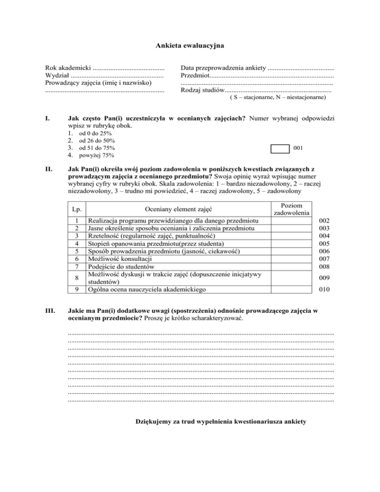 Ankieta ewaluacyjna Rok akademicki ......................................... Wydział ..................................................... Prowadzący zajęcia (imię i nazwisko) .................................................................... Data przeprowadzenia ankiety ...................................... Przedmiot....................................................................... ....................................................................................... Rodzaj studiów............................................................. ( S – stacjonarne, N – niestacjonarne) I. Jak często Pan(i) uczestniczyła w ocenianych zajęciach? Numer wybranej odpowiedzi wpisz w rubrykę obok. 1. od 0 do 25% 2. od 26 do 50% 3. od 51 do 75% 001 4. powyżej 75% II. Jak Pan(i) określa swój poziom zadowolenia w poniższych kwestiach związanych z prowadzącym zajęcia z ocenianego przedmiotu? Swoja opinię wyraź wpisując numer wybranej cyfry w rubryki obok. Skala zadowolenia: 1 – bardzo niezadowolony, 2 – raczej niezadowolony, 3 – trudno mi powiedzieć, 4 – raczej zadowolony, 5 – zadowolony Lp. 1 2 3 4 5 6 7 8 9 III. Oceniany element zajęć Poziom zadowolenia Realizacja programu przewidzianego dla danego przedmiotu Jasne określenie sposobu oceniania i zaliczenia przedmiotu Rzetelność (regularność zajęć, punktualność) Stopień opanowania przedmiotu(przez studenta) Sposób prowadzenia przedmiotu (jasność, ciekawość) Możliwość konsultacji Podejście do studentów Możliwość dyskusji w trakcie zajęć (dopuszczenie inicjatywy studentów) Ogólna ocena nauczyciela akademickiego 002 003 004 005 006 007 008 009 010 Jakie ma Pan(i) dodatkowe uwagi (spostrzeżenia) odnośnie prowadzącego zajęcia w ocenianym przedmiocie? Proszę je krótko scharakteryzować. ........................................................................................................................................................ ........................................................................................................................................................ ........................................................................................................................................................ ........................................................................................................................................................ ........................................................................................................................................................ ........................................................................................................................................................ ........................................................................................................................................................ ........................................................................................................................................................ ........................................................................................................................................................ ........................................................................................................................................................ Dziękujemy za trud wypełnienia kwestionariusza ankiety