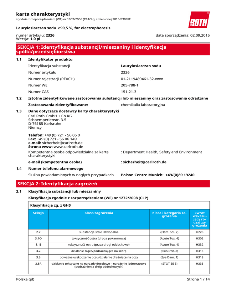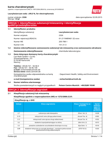 karta charakterystyki zgodnie z rozporządzeniem (WE) nr 1907/2006 (REACH), zmienionej 2015/830/UE Laurylosiarczan sodu ≥99,5 %, for electrophoresis numer artykułu: 2326 Wersja: 1.0 pl data sporządzenia: 02.09.2015 SEKCJA 1: Identyfikacja substancji/mieszaniny i identyfikacja spółki/przedsiębiorstwa 1.1 1.2 Identyfikator produktu Identyfikacja substancji Laurylosiarczan sodu Numer artykułu 2326 Numer rejestracji (REACH) 01-2119489461-32-xxxx Numer WE 205-788-1 Numer CAS 151-21-3 Istotne zidentyfikowane zastosowania substancji lub mieszaniny oraz zastosowania odradzane Zastosowania zidentyfikowane: 1.3 chemikalia laboratoryjna Dane dotyczące dostawcy karty charakterystyki Carl Roth GmbH + Co KG Schoemperlenstr. 3-5 D-76185 Karlsruhe Niemcy Telefon: +49 (0) 721 - 56 06 0 Fax: +49 (0) 721 - 56 06 149 e-mail: [email protected] Strona www: www.carlroth.de 1.4 Kompetentna osoba odpowiedzialna za kartę charakterystyki : Department Health, Safety and Environment e-mail (kompetentna osoba) : [email protected] Numer telefonu alarmowego Służba powiadamianych w nagłych przypadkach Poison Centre Munich: +49/(0)89 19240 SEKCJA 2: Identyfikacja zagrożeń 2.1 Klasyfikacja substancji lub mieszaniny Klasyfikacja zgodnie z rozporządzeniem (WE) nr 1272/2008 (CLP) Klasyfikacja zg. z GHS Sekcja Klasa zagrożenia Klasa i kategoria zagrożenia Zwrot wskazujący rodzaj zagrożenia 2.7 substancje stałe łatwopalne (Flam. Sol. 2) H228 3.1O toksyczność ostra (droga pokarmowa) (Acute Tox. 4) H302 3.1I toksyczność ostra (przez drogi oddechowe) (Acute Tox. 4) H332 3.2 działanie żrące/podrażniające na skórę (Skin Irrit. 2) H315 3.3 poważne uszkodzenie oczu/działanie drażniące na oczy (Eye Dam. 1) H318 3.8R działanie toksyczne na narządy docelowe – narażenie jednorazowe (podrażnienia dróg oddechowych) (STOT SE 3) H335 Polska (pl) Strona 1 / 14 karta charakterystyki zgodnie z rozporządzeniem (WE) nr 1907/2006 (REACH), zmienionej 2015/830/UE Laurylosiarczan sodu ≥99,5 %, for electrophoresis numer artykułu: 2326 Klasyfikacja zg. z GHS Sekcja Klasa zagrożenia Klasa i kategoria zagrożenia Zwrot wskazujący rodzaj zagrożenia 4.1C stwarzające zagrożenie dla środowiska wodnego - zagrożenie przewlekłe (Aquatic Chronic 3) H412 Uwagi Pełny tekst zwrotów R oraz zwrotów wskazujących rodzaj zagrożenia i zwrotów EUH: zob. SEKCJA 16. 2.2 Elementy oznakowania Oznakowania zgodnie z rozporządzeniem (WE) nr 1272/2008 (CLP) Hasło ostrzegawcze Niebezpieczeństwo Piktogramy Zwroty wskazujące rodzaj zagrożenia H228 H302+H332 H315 H318 H335 H412 Substancja stała łatwopalna. Działa szkodliwie po połknięciu lub w następstwie wdychania. Działa drażniąco na skórę. Powoduje poważne uszkodzenie oczu. Może powodować podrażnienie dróg oddechowych. Działa szkodliwie na organizmy wodne, powodując długotrwałe skutki. Zwroty wskazujące środki ostrożności Zwroty wskazujące środki ostrożności - zapobieganie P210 P261 P280 Przechowywać z dala od źródeł ciepła, gorących powierzchni, źródeł iskrzenia, otwartego ognia i innych źródeł zapłonu. Nie palić. Unikać wdychania pyłu. Stosować rodzież ochronną/ ochronę oczu. Zwroty wskazujące środki ostrożności - reagowanie P302+P352 P305+P351+P338 P312 W PRZYPADKU KONTAKTU ZE SKÓRĄ: Umyć dużą ilością wody. W PRZYPADKU DOSTANIA SIĘ DO OCZU: ostrożnie płukać wodą przez kilka minut. Wyjąć soczewki kontaktowe, jeżeli są i można je łatwo usunąć. Kontynuować płukanie. W przypadku złego samopoczucia skontaktować się z OŚRODKIEM ZATRUĆ/lekarzem. Oznakowanie opakowań, których zawartość nie przekracza 125 ml Hasło ostrzegawcze: Niebezpieczeństwo Polska (pl) Strona 2 / 14 karta charakterystyki zgodnie z rozporządzeniem (WE) nr 1907/2006 (REACH), zmienionej 2015/830/UE Laurylosiarczan sodu ≥99,5 %, for electrophoresis numer artykułu: 2326 Symbol(-e) H318 H412 Powoduje poważne uszkodzenie oczu. Działa szkodliwie na organizmy wodne, powodując długotrwałe skutki. P280 Stosować rękawice ochronne/odzież ochronną/ochronę oczu/ochronę twarzy. P305+P351+P338 W PRZYPADKU DOSTANIA SIĘ DO OCZU: ostrożnie płukać wodą przez kilka minut. Wyjąć soczewki kontaktowe, jeżeli są i można je łatwo usunąć. Kontynuować płukanie. 2.3 Inne zagrożenia Nie ma dodatkowych informacji. SEKCJA 3: Skład/informacja o składnikach 3.1 Substancje Nazwa substancji Laurylosiarczan sodu Numer rejestracji (REACH) 01-2119489461-32-xxxx Numer WE 205-788-1 Numer CAS 151-21-3 Wzór cząsteczkowy C12H26O4S.Na Masa cząsteczkowa 288,4 g/mol SEKCJA 4: Środki pierwszej pomocy 4.1 Opis środków pierwszej pomocy Uwagi ogólne Zdjąć zanieczyszczoną odzież. Po narażeniu przez drogi oddechowe Zapewnić dostęp do świeżego powietrza. Zasięgnąć porady lekarza w przypadku pojawienia się jakichkolwiek wątpliwości, lub jeżeli objawy nie ustępują. Po kontakcie ze skórą Spłukać skórę pod strumieniem wody/prysznicem. Zasięgnąć porady lekarza w przypadku pojawienia się jakichkolwiek wątpliwości, lub jeżeli objawy nie ustępują. Po kontakcie z oczami W przypadku przedostania się do oczu natychmiast przemywać przez 10 do 15 minut przy otwartej powiece bieżącą wodą i zasięgnąć porady lekarza. Po narażeniu przez przewód pokarmowy Przepłukać usta wodą (tylko, gdy osoba jest przytomna). Skontaktować się z lekarzem. Polska (pl) Strona 3 / 14 karta charakterystyki zgodnie z rozporządzeniem (WE) nr 1907/2006 (REACH), zmienionej 2015/830/UE Laurylosiarczan sodu ≥99,5 %, for electrophoresis numer artykułu: 2326 4.2 Najważniejsze ostre i opóźnione objawy oraz skutki narażenia Jeśli nastąpił kontakt z oczami: Ryzyko poważnego uszkodzenia oczu, W następstwie kontaktu ze skórą: Świąd, Miejscowe zaczerwienienie, W wyniku zakrztuszenia: Ból brzucha, Wymioty, Powoduje od niewielkiego do umiarkowanego podrażnienia, Po wdechu: Kaszel, Duszność, Podrażnienie płuc 4.3 W