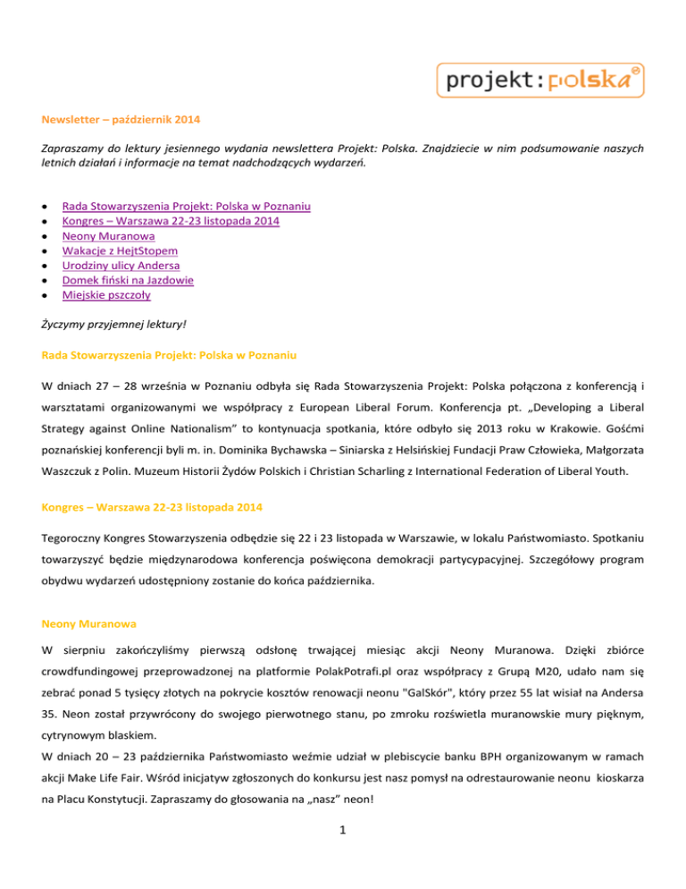 Newsletter – październik 2014 Zapraszamy do lektury jesiennego wydania newslettera Projekt: Polska. Znajdziecie w nim podsumowanie naszych letnich działań i informacje na temat nadchodzących wydarzeń. Rada Stowarzyszenia Projekt: Polska w Poznaniu Kongres – Warszawa 22-23 listopada 2014 Neony Muranowa Wakacje z HejtStopem Urodziny ulicy Andersa Domek fiński na Jazdowie Miejskie pszczoły Życzymy przyjemnej lektury! Rada Stowarzyszenia Projekt: Polska w Poznaniu W dniach 27 – 28 września w Poznaniu odbyła się Rada Stowarzyszenia Projekt: Polska połączona z konferencją i warsztatami organizowanymi we współpracy z European Liberal Forum. Konferencja pt. „Developing a Liberal Strategy against Online Nationalism” to kontynuacja spotkania, które odbyło się 2013 roku w Krakowie. Gośćmi poznańskiej konferencji byli m. in. Dominika Bychawska – Siniarska z Helsińskiej Fundacji Praw Człowieka, Małgorzata Waszczuk z Polin. Muzeum Historii Żydów Polskich i Christian Scharling z International Federation of Liberal Youth. Kongres – Warszawa 22-23 listopada 2014 Tegoroczny Kongres Stowarzyszenia odbędzie się 22 i 23 listopada w Warszawie, w lokalu Państwomiasto. Spotkaniu towarzyszyć będzie międzynarodowa konferencja poświęcona demokracji partycypacyjnej. Szczegółowy program obydwu wydarzeń udostępniony zostanie do końca października. Neony Muranowa W sierpniu zakończyliśmy pierwszą odsłonę trwającej miesiąc akcji Neony Muranowa. Dzięki zbiórce crowdfundingowej przeprowadzonej na platformie PolakPotrafi.pl oraz współpracy z Grupą M20, udało nam się zebrać ponad 5 tysięcy złotych na pokrycie kosztów renowacji neonu "GalSkór", który przez 55 lat wisiał na Andersa 35. Neon został przywrócony do swojego pierwotnego stanu, po zmroku rozświetla muranowskie mury pięknym, cytrynowym blaskiem. W dniach 20 – 23 października Państwomiasto weźmie udział w plebiscycie banku BPH organizowanym w ramach akcji Make Life Fair. Wśród inicjatyw zgłoszonych do konkursu jest nasz pomysł na odrestaurowanie neonu kioskarza na Placu Konstytucji. Zapraszamy do głosowania na „nasz” neon! 1 Wakacje z HejtStopem W lipcu odbyły się wewnętrzne warsztaty HejtStopu, w których wzięli udział członkowie Projektu: Polska z Koszalina, Łodzi, Poznania i Warszawy. W wakacje promowaliśmy idee HejtStopu jeżdżąc po kraju i prezentując się na rozmaitych festiwalach. 27 i 28 czerwca byliśmy na Life Festival Oświęcim – piątej edycji festiwalu którego celem jest pokazanie przyjaznego, wielokulturowego oblicza miasta Oświęcim kojarzonego ze znajdującym się tam podczas II wojny światowej obozem zagłady. Zdecydowanie najważniejszą dla nas imprezą była dwudziesta odsłona Przystanku Woodstock. Podczas trzech dni festiwalu odbyliśmy setki rozmów, rozdaliśmy tysiące wlepek i przede wszystkim – rewelacyjnie się bawiliśmy. Pod koniec wakacji wybraliśmy się do Barcic Dolnych pod Starym Sączem, gdzie razem z organizatorami Pannonica Folk Festival tworzyliśmy strefę wolną od hejta. Nasz wolontariusz z Krakowa Tomek Pytko przeprowadził warsztaty, podczas których opowiedział w jaki sposób walczymy z nienawiścią na murach polskich miast. Byliśmy również aktywni lokalnie. 10 sierpnia, podczas święta ulicy Władysława Andersa zorganizowaliśmy spacer śladami napisów które zamierzaliśmy zamalować 6 września, podczas pikniku HejtStopu pt. „Posprzątaj swoje podwórko z hejtów”. Sam piknik odbył się w rewelacyjnej atmosferze. Razem z naszymi przyjaciółmi z Muzeum Historii Żydów Polskich, Centrum Kultury Jidysz, Amnesty International i organizacji Kibice Razem malowaliśmy w 13 miejscach na warszawskim Muranowie. Zamalowaliśmy około 20 hejtów. Eskaer, ceniony twórca street-artu, wykonał mural nawiązujący do wielokulturowej historii Muranowa. Urodziny ulicy Andersa 10 sierpnia w Państwomiasto odbyły się obchody drugich miejskich urodzin Władysława Andersa. Plan dnia zawierał takie atrakcje jak: sąsiedzki pchli targ, pokazy filmów, warsztaty plastyczne dla dzieci, spacer śladami muranowskich murali. Partnerami wydarzenia byli: HejtStop, Muzeum Historii Żydów Polskich, Warszawex, Stowarzyszenie Kibice Razem, Bank Credit Agricole, sklep Poster Plate, Restaurant & Bar La MaMa, Ćwierćfunciak. Domek fiński na Jazdowie W maju Państwomiasto powiększyło się o nową przestrzeń - PM na trawie - domek fiński na osiedlu Jazdów. PM na trawie jest otwartym, nieodpłatnym miejscem spotkań i współpracy społecznych inicjatyw lokalnych. Współpracujemy z szeregiem organizacji lokalnych m. in.: 2 - - Społecznościowym System Wymiany – Wymiennik, który umożliwia bezpieniężną wymianę dóbr i usług pomiędzy członkami lokalnej społeczności; - Stowarzyszeniem Mieszkańców Domków Fińskich Jazdów; - Rośnij WAW, które gościmy w związku z XXXI edycją konkursu na najpiękniejszy zielony obiekt w mieście pt. „Warszawa w kwiatach”. W PM na trawie odbyła się np. wyprzedaż garażowa – Jazdowisko i akcja Fundacji Greenpeace Polska „Adoptuj Pszczołę”. W naszej przestrzeni odbywają się cyklicznie warsztaty Akademii Młodego Hakera i warsztaty uważności MINDFULNESS. Miejskie pszczoły Inicjatywa Miejskie Pszczoły powstała po to aby rozwijać i promować w Warszawie miejskie pszczelarstwo. Przez kilka ostatnich miesięcy Miejskie Pszczoły postawiły w stolicy kilkadziesiąt uli m. in. w parku Królikarnia, na dachu jednej z warszawskich kamienic i na osiedlu domków fińskich Jazdów. Odpowiedzią na duże zainteresowanie projektem jest Akademia Miejskiego Pszczelarstwa, w której ramach kilkadziesiąt osób uczy się pszczelarstwa poprzez sezonową opiekę nad naszymi ulami. Grupa Miejskie Pszczoły aktywnie działała na rzecz zalegalizowania miejskiego pszczelarstwa w Warszawie. Możemy pochwalić się pierwszymi sukcesami: w ubiegłym miesiącu na posiedzeniu Ra