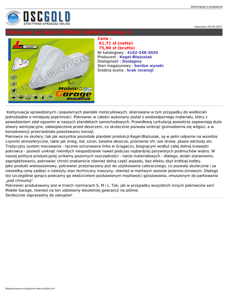 Informacje o produkcie Utworzono 03-03-2017 Pokrowiec na skuter MOBILE GARAGE rozmiar L Cena : 61,71 zł (netto) 75,90 zł (brutto) Nr katalogowy : 4162-248-3020 Producent : Kegel-Błażusiak Dostępność : Dostępny Stan magazynowy : bardzo wysoki Średnia ocena : brak recenzji Kontynuacja sprawdzonych i popularnych plandek motocyklowych, skierowana w tym przypadku do wielbicieli jednośladów o mniejszej pojemności. Pokrowiec w całości wykonany został z wodoodpornego materiału, który z powodzeniem zdał egzamin w naszych plandekach samochodowych. Prawidłową cyrkulację powietrza zapewniają duże otwory wentylacyjne, zabezpieczone przed deszczem, co skutecznie pozwala uniknąć gromadzenia się wilgoci, a w konsekwencji przeciwdziała powstawaniu korozji. Pokrowce na skutery, tak jak wszystkie pozostałe plandeki produkcji Kegel-Błażusiak, są w pełni odporne na wszelkie czynniki atmosferyczne, takie jak śnieg, lód, szron, kwaśne deszcze, promienie UV, sok drzew, ptasie odchody etc. Tradycyjny system mocowania - ręcznie sznurowana linka w ściągaczu, biegnącym wzdłuż całej dolnej krawędzi pokrowca - pozwoli uniknąć niemiłych niespodzianek nawet podczas najbardziej porywistych podmuchów wiatru. W naszej polityce produkcyjnej unikamy pozornych oszczędności – także materiałowych - dlatego, dzięki starannemu zaprojektowaniu, pokrowiec chroni znakomicie również dolną część pojazdu, bez efektu zbyt krótkiej kołdry. Jako produkt wielosezonowy, pokrowiec przeznaczony jest do użytkowania całorocznego, co pozwala skutecznie i za niewielką cenę zadbać o należyty stan techniczny maszyny, również w martwym sezonie jesienno-zimowym. Dlatego też szczególnie gorąco polecamy go właścicielom pozbawionym możliwości garażowania, zmuszonym do parkowania „pod chmurką”. Pokrowiec produkowany jest w trzech rozmiarach S, M i L. Tak, jak w przypadku wszystkich innych pokrowców serii Mobile Garage, również na ten udzielamy dwuletniej gwarancji na piśmie. Serdecznie zapraszamy do zakupów! Wygenerowano w programie www.oscGold.com