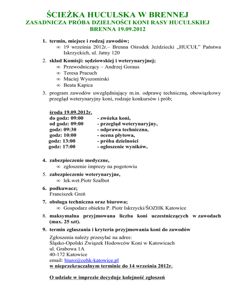 ŚCIEŻKA HUCULSKA W BRENNEJ ZASADNICZA PRÓBA DZIELNOŚCI KONI RASY HUCULSKIEJ BRENNA 19.09.2012 1. termin, miejsce i rodzaj zawodów; • 19 września 2012r.– Brenna Ośrodek Jeździecki „HUCUŁ” Państwa Iskrzyckich, ul. Jatny 120 2. skład Komisji: sędziowskiej i weterynaryjnej; • Przewodniczący – Andrzej Goraus • Teresa Pracuch • Maciej Wyszomirski • Beata Kapica 3. program zawodów uwzględniający m.in. odprawę techniczną, obowiązkowy przegląd weterynaryjny koni, rodzaje konkursów i prób; środa 19.09.2012r. do godz: 09:00 od godz: 09:00 godz: 09:30 godz: 10:00 godz: 13:00 godz: 17:00 - zwózka koni, - przegląd weterynaryjny, - odprawa techniczna, - ocena płytowa, - próba dzielności - ogłoszenie wyników, 4. zabezpieczenie medyczne, • zgłoszenie imprezy na pogotowiu 5. zabezpieczenie weterynaryjne, • lek.wet.Piotr Szalbot 6. podkuwacz; Franciszek Greń 7. obsługa techniczna oraz biurowa; • Gospodarz obiektu P. Piotr Iskrzycki/ŚOZHK Katowice 8. maksymalna przyjmowana liczba koni uczestniczących w zawodach (max. 25 szt). 9. termin zgłaszania i kryteria przyjmowania koni do zawodów Zgłoszenia należy przesyłać na adres: Śląsko-Opolski Związek Hodowców Koni w Katowicach ul. Grabowa 1A 40-172 Katowice email: [email protected] w nieprzekraczalnym terminie do 14 września 2012r. O udziale w imprezie decyduje kolejność zgłoszeń (formularz zgłoszeniowy w załączeniu); 10.wymogi i warunki uczestnictwa dla zawodników i ekip; • Zawodnik powinien posiadać aktualne zaświadczenie lekarskie o braku przeciwwskazań do uprawiania jeździectwa (ważność badania 6 m-cy). • Zawodnik powinien posiadać toczek i buty jeździeckie. • Wiek zawodników min. 10 lat. • Od zawodników, którzy nie ukończyli 18 lat organizator wymaga pisemnej zgody rodziców lub prawnych opiekunów na uczestnictwo w zawodach. 11.warunki dla koni; Wszystkie konie muszą posiadać paszport z aktualnymi szczepieniami przeciw grypie według jednego schematu: • zaświadczenie o stanie zdrowia konia wystawione przez lekarza weterynarii • szczepienie podstawowe: pierwsze szczepienie – w dniu rozpoczęcia szczepień drugie szczepienie – nie wcześniej niż 21-go dnia i nie później niż 92 dnia od daty pierwszego szczepienia • szczepienie przypominające: co 6 miesięcy od daty ostatniego szczepienia (dopuszczalny jest 21dniowy okres przekroczenia terminu) żadne szczepienie przypominające nie może się odbyć później niż na 7 dni przed przybyciem na zawody • Wszystkie dane dotyczące szczepień muszą być wpisane w paszporcie we właściwych rubrykach. Wpisy muszą być staranne, pismem drukowanym nie budzącym wątpliwości co do treści. Każdy wpis zostaje potwierdzony starannym podpisem i pieczęcią lekarza weterynarii przeprowadzającego szczepienie. • Koń, który uczestniczy w zawodach po raz pierwszy musi mieć potwierdzone w paszporcie minimum szczepienie podstawowe. • Konie bez ważnych szczepień oraz wykazujące objawy chorobowe nie zostaną dopuszczone do udziału w zawodach. • Konie na zawody należy dostarczyć własnym transportem, zabierając paszę treściwą na okres trwania zawodów, siano i słoma będzie zabezpieczona nieodpłatnie. Koszty transportu nie zostaną zwrócone. • Organizatorzy zabezpieczają miejsce w stajni (boksy lub stanowiska) 12.wymagane opłaty; • Za ocenę wartości użytkowej klaczy w próbie dzielności (polowe próby dzielności) PK – 20 zł 13.charakterystyka terenu i podłoża (określenie różnicy wzniesień) Teren górski wysokość ok. 500 m.n.p.m, względna różnica poziomów do 100 m, podłoże trawiaste, kamieniste górskie drogi i szlaki, nachylenie przeszkód zjazdów i podjazdów nie przekracza 45 stopni, 14. „Kodeks postępowania z koniem” (w załączeniu). • Na wszystkich etapach treningu i przygotowań konia do startu w zawodach, dobro konia musi stać ponad wszelkimi innymi wymaganiami. Dotyczy to stałej opieki, metod treningu, starannego obrządku, kucia i transportu. • Konie i jeźdźcy muszą być wytrenowani, kompetentni i zdrowi zanim wezmą udział w zawodach. Odnosi się to także do podawania leków i środków medycznych, zabiegów chirurgicznych zagrażających dobru konia lub ciąży klaczy oraz do przypadków nadużywania pomocy. • Zawody nie mogą zagrażać dobru konia. Wymaga to zwrócenia szczególnej uwagi na teren zawodów, powierzchnię podłoża, pogodę, warunki stajenne, kondycję koni i ich bezpieczeństwo, także podczas podróży powrotnej z zawodów. • Należy dołożyć wszelkich starań, aby zapewnić koniom staranną opiekę po zakończeniu zawodów, a także humanitarne traktowanie po zakończeniu kariery sportowej. Dotyczy to właściwej opieki weterynaryjnej, obrażeń odniesionych na zawodach, spokojnej starości, ewentualnie eutanazji. • PZJ zachęca wszystkie osoby działające w sporcie jeździeckim do stałego podnoszenia swojej wiedzy oraz umiejętności dotyczących wszelkich aspektów współpracy z koniem.