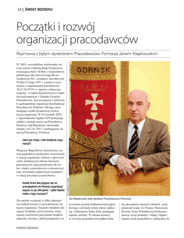 18 | ŚWIAT BIZNESU Początki i rozwój organizacji pracodawców Rozmowa z byłym dyrektorem Pracodawców Pomorza Janem Klapkowskim W 1989 r. powołaliśmy nieformalne stowarzyszenie Gdańską Radę Dyrektorów, zrzeszającą około 30 firm z województwa gdańskiego jako przeciwwagę dla powstałych po 80 r. związków zawodowych. W dniu 23 maja 1991 r. weszła w życie ustawa o organizacjach pracodawców /Dz.U.Nr.55/91/ w oparciu o którą rejestrujemy w Sądzie Rejestrowym w Gdańsku pod numerem 1 Gdański Związek Pracodawców. Jest on jednym z założycieli ogólnopolskiej organizacji Konfederacji Pracodawców Polskich. Od tego czasu następuje szybki dynamiczny rozwój naszej organizacji. W IV kwartale 2010 r. Zgromadzenie Ogólne GZP podejmuje uchałę o zmianie nazwy na Pracodawcy Pomorza. Sąd Rejestrowy zatwierdza zmianę i od 1.01.2011 r. posługujemy się nazwą Pracodawcy Pomorza. Jaka jest misja i cele działania organizacji? Każda firma decydująca się na przystąpienie do Waszej organizacji zapyta co jej oferujecie i jakie będzie miała z tego korzyści? Nie sposób wymienić w kilku zdaniach wszystkich korzyści z przynależności do naszej organizacji. Naszym członkom oferujemy bezpłatny serwis prawny, wskazujemy możliwości pozyskania środków unijnych, mówiąc z jakich programów na EXPRESS BIZNESU Fot. Andrzej J. Gojke Misją jest długofalowy, dynamiczny rozwój gospodarczy podmiotów zrzeszonych w naszej organizacji. Jednym z głównych celów działania jest obrona interesów pracodawców, reprezentowanie ich wobec władzy ustawodawczo-wykonawczej oraz utrzymanie poprawnych stosunków w relacji pracodawca-pracobiorca. Jan Klapkowski, były dyrektor Pracodawców Pomorza co można uzyskać dofinansowanie,gdzie do kogo i do kiedy należy złożyć aplikację, wskazujemy firmy, które pomagają napisać wnioski. W ramach pomocy w rozwoju gospodarczym podpowiada- my jak poprzez naszych członków poza granicami kraju: we Francji, Niemczech, Szwecji, Korei Południowej można promować swoje produkty i usługi. Organizujemy misje gospodarcze, zachęcamy do ŚWIAT BIZNESU | 19 udziału w targach krajowych i międzynarodowych. Pomagamy w organizowaniu szkoleń dla kadry zarządzającej i pracowników. Na bieżąco informujemy członków o zmianach w przepisach prawnych. Czy łatwo namówić przedsiębiorców do integracji w strukturach pracodawczych? Głównym celem działalności gospodarczej jest wypracowanie zysku. Przedsiębiorcy z sektora MŚP, z którego zrzeszamy nasze firmy, koncentrują się głównie na kontroli prawidłowości działania firmy i mają niewiele czasu na działalność społeczną w organizacjach pracodawczo- biznesowych. Przynależność do organizacji jest fakultatywna ,a nie obligatoryjna jak np. w Niemczech. Najskuteczniej liczebności członków można zwiększyć poprzez zarekomendowanie naszej organizacji nowej firmie przez aktualnego członka. Należy przekonywać niezdecydowanych, że jeden silny palec nie jest tak silny jak cała ręka. Pojedyncza firma nie ma takich możliwości jak duża, silna, reprezentatywna organizacja pracodawcza. Zrzeszacie około 600 firm. Jak wygląda codzienna merytoryczna działalność organizacji? Aby zintegrować przedsiębiorców o wspólnych zainteresowaniach powołaliśmy 12 sekcji branżowych i oddziały terenowe. Podczas spotkań organizowanych w zależności od potrzeb członków 1-3 razy w kwartale każda z firm prezentuje swoją działalność zachęcając do wzajemnej współpracy. Na bazie sekcji branżowych powstają klastry przemysłowe. Wymiana doświadczeń, nawiązywanie kontaktów wzmacnia strukturę organizacji, daje firmom szanse na pozyskanie nowych zleceń. Preferujemy zasadę wzajemnego wspierania się w świadczeniu usług i zakupu produktów od naszych członków. Posiadamy oddziały w każdym powiecie woj. pomorskiego, gdzie liderzy lokalni prezentują lokalnym władzom problemy z jakimi spotykają się przedsiębiorcy w codziennej działalności gospodarczej. Stwierdzić należy dużą przychylność władz w tworzeniu lokalnych struktur pracodawczych ułatwiających wzajemną komunikację. Jak promujecie Waszą organizację? Nowy, aktywny, kreatywny Prezes Pracodawców Pomorza dr Zbigniew Canowiecki wprowadził od 2011 r. specjalną nagrodę dla wyróżniających się firm pomorskich ,,Pracodawca Roku” . Statuetka wręczana jest w 3-ch kategoriach /mikro, małe, średnie firmy/ na początku roku kalendarzowego. Zorganizował w czerwcu wspaniałą Galę Biznesu w Sopocie w czasie której wręczono statuetki osobom wyróżniającym się w działalności rządowej, bankowej, samorządowej i gospodarczej. Zorganizował warsztaty Biznes-Uczelnie Pomorza oraz Biznes-Szkoły Zawodowe, na których omówiono zasady wzajemnej współpracy i wytyczono cele działania na najbliższe lata. Te wszystkie spotkania zacji w prasie i mediach. Jest to jedna ze słabszych stron naszej działalności. Mimo dynamicznego wzrostu liczebności członków z 30 do ok. 600 w chwili obecnej zachęcanie firm do integracji w strukturach pracodawczych nie jest łatwe. Na tym polu mamy jeszcze wiele do zrobienia. Czy prawdą jest, że budujecie nową siedzibę Pracodawców Pomorza? Czterem byłym przewodniczącym naszej organizacji nie udało się pozyskać od władz miasta budynku na nową siedzibę. Dokonał tego Prezes Zbigniew Canowiecki podpisując akt notarialny przejęcia wymagającego kapitalnego remontu budynku przy Al. Zwycięstwa w Gdańsku. Kapitalny remont w konsultacji z konserwatorem zabytków będzie kosztowny. W remoncie tym wspomagają nas firmy członkowskie, które przekazują materiały i świadczą Misją jest długofalowy, dynamiczny rozwój gospodarczy podmiotów zrzeszonych w naszej organizacji. Jednym z głównych celów działania jest obrona interesów pracodawców, reprezentowanie ich wobec władzy... były znakomitą promocją naszej organizacji. Promujemy naszą organizac
