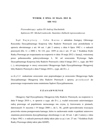 WYROK Z DNIA 10 MAJA 2012 R. SDI 9/12 Przewodniczący: sędzia SN Andrzej Siuchniński. Sędziowie SN: Michał Laskowski, Stanisław Zabłocki (sprawozdawca). Sąd Najwyższy – Izba K a r n a z udziałem Zastępcy Głównego Rzecznika Dyscyplinarnego Krajowej Izby Radców Prawnych oraz protokólanta w sprawie obwinionego z art. 64 ust. 1 pkt 2 ustawy z dnia 6 lipca 1982 r. o radcach prawnych (Dz. U. z 2002 r. Nr 123, poz. 1059 ze zm.) i art. 27 ust. 7 Kodeksu Etyki Radcy Prawnego po rozpoznaniu na rozprawie w dniu 10 maja 2012 r. kasacji, wniesionej przez pełnomocnika pokrzywdzonego L. M. od orzeczenia Wyższego Sądu Dyscyplinarnego Krajowej Izby Radców Prawnych z dnia 8 lutego 2011 r., sygn. akt WO (...), utrzymującego w mocy orzeczenie Okręgowego Sądu Dyscyplinarnego Okręgowej Izby Radców Prawnych z dnia 9 lutego 2010 r., sygn. akt D (...) u c h y l i ł zaskarżone orzeczenie oraz poprzedzające je orzeczenie Okręgowego Sądu Dyscyplinarnego Okręgowej Izby Radców Prawnych i sprawę p r z e k a z a ł do ponownego rozpoznania temu ostatniemu Sądowi Dyscyplinarnemu. UZASADNIENIE Okręgowy Sąd Dyscyplinarny Okręgowej Izby Radców Prawnych, na rozprawie w dniu 9 lutego 2010 r., w sprawie o sygn. akt D (...), wydał orzeczenie uniewinniające radcę prawnego od popełnienia zarzucanego mu czynu, tj. kierowania w pismach, datowanych 31 stycznia i 19 lutego 2008 r., do L. M., gróźb spowodowania wszczęcia przeciwko niemu postępowania karnego, które to zachowanie miało wypełniać ustawowe znamiona przewinienia dyscyplinarnego określonego w art. 64 ust. 1 pkt 2 ustawy z dnia 6 lipca 1982 r. o radcach prawnych (dalej także jako u.r.p.) i art. 27 ust. 7 Kodeksu Etyki Radcy Prawnego (dalej także jako KERP). 2 Od powyższego orzeczenia odwołanie złożył pokrzywdzony L. M. Wyższy Sąd Dyscyplinarny przy Krajowej Izbie Radców Prawnych, orzeczeniem z dnia 8 lutego 2011 r., sygn. akt WO (...), utrzymał w mocy zaskarżone orzeczenie Okręgowego Sądu Dyscyplinarnego. Orzeczenie to zostało zaskarżone kasacją przez pełnomocnika pokrzywdzonego, który sformułował następujące zarzuty: 1. rażącego naruszenia art. 64 ust. 1 pkt 2 u.r.p. w zw. z art. 27 ust. 7 Kodeksu Etyki Radcy Prawnego poprzez ich błędną wykładnię polegającą na przyjęciu, że sformułowania użyte przez radcę prawnego A. M. w skierowanych do pokrzywdzonego pismach z dnia 31 stycznia 2008 r. oraz z dnia 19 lutego 2008 r. nie stanowią przewinienia dyscyplinarnego w postaci posłużenia się przez obwinionego w jego zawodowych wystąpieniach groźbami wszczęcia postępowania karnego; 2. rażącego naruszenia art. 64 ust. 1 pkt 2 u.r.p. w zw. z art. 27 ust. 3 Kodeksu Etyki Radcy Prawnego poprzez uznanie za okoliczność ekskulpującą obwinionego istnienie poważnego konfliktu interesów pokrzywdzonego oraz mocodawców obwinionego, co pozostaje w oczywistej sprzeczności z regulacją art. 27 ust. 3 KERP, z której wprost wynika, że negatywne nastawienie klienta do strony przeciwnej nie powinno mieć wpływu na postawę radcy prawnego; 3. rażącego naruszenia art. 64 ust. 1 pkt 1 u.r.p. w zw. z art. 11 ust. 1 u.r.p. w zw. z art. 27 ust. 6 Kodeksu Etyki Radcy Prawnego poprzez przyjęcie, że zachowanie obwinionego polegające na posłużeniu się w swoich zawodowych wystąpieniach groźbami podania do wiadomości osób trzecich nieprawdziwych informacji mogących narażać pokrzywdzonego na utratę zaufania potrzebnego do pełnienia funkcji zarządczych w spółkach kapitałowych oraz prowadzenia działalności gospodarczej nie stanowi przewinienia dyscyplinarnego, polegającego na przekroczeniu zasady wolności słowa i pisma ponad rzeczową potrzebę. W konkluzji kasacji, pełnomocnik pokrzywdzonego wniósł o uchylenie zaskarżonego orzeczenia w całości i przekazanie niniejszej sprawy do ponownego rozpoznania Wyższemu Sądowi Dyscyplinarnemu Krajowej Izby Radców Prawnych. 3 Na rozprawie kasacyjnej pełnomocnik pokrzywdzonego poparł kasację wraz z jej wnioskami końcowymi, a Zastępca Głównego Rzecznika Dyscyplinarnego Krajowej Izby Radców Prawnych przyłączył się do tego stanowiska. Sąd Najwyższy zważył, co następuje: Rozpoznając kasację w niniejszej sprawie, w pierwszej kolejności, niejako dla „oczyszczenia przedpola”, należy zaznaczyć, iż postępowanie dyscyplinarne w sprawach radców prawnych prowadzone jest w oparciu o przepisy Rozdziału 6 (zatytułowanego „Odpowiedzialność dyscyplinarna”) u.r.p. Zgodnie z treścią art. 741 tej ustawy, w sprawach nieuregulowanych do postępowania dyscyplinarnego stosuje się odpowiednio przepisy Kodeksu postępowania karnego. Sąd Najwyższy wielokrotnie podkreślał w swoim orzecznictwie, w tym także z zakresu odpowiedzialności dyscyplinarnej radców prawnych (np. w wyroku z dnia 15 grudnia 2010 r., sygn. akt SDI 24/10), że oczywistym jest w związku z tym, że w postępowaniu przed Wyższym Sądem Dyscyplinarnym mają pełne zastosowanie zawarte w procedurze karnej unormowania określające obowiązki sądu odwoławczego, w szczególności zawarte w art. 433 § 2 k.p.k. W myśl tego przepisu sąd drugiej instancji obowiązany jest rozważyć wszystkie wnioski i zarzuty wskazane w środku odwoławczym, chyba że ustawa stanowi inaczej. Prawidłowe zrealizowanie dyspozycji art. 433 § 2 k.p.k. znajduje z kolei swoje odzwierciedlenie w pisemnym uzasadnieniu orzeczenia sądu drugiej instancji, którego wymogi określił ustawodawca w odpowiednio stosowanym w postępowaniu w przedmiocie odpowiedzialności dyscyplinarnej radców prawnych przepisie art. 457 § 3 k.p.k. Zgodnie zatem z dyspozycją art. 457 § 3 k.p.k., uzasadnienie orzeczenia Wyższego Sądu Dyscyplinarnego powinno wskazywać czym kierował się sąd wydając orzeczenie oraz dlaczego zarzuty i wnioski odwołania uznał za zasadne albo niezasadne. Patrząc przez pryzmat powyższych tez na treść uzasadnienia orzeczenia Wyższego Sądu Dyscyplinarnego Kra