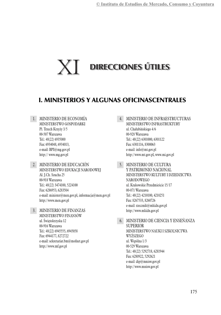 © Instituto de Estudios de Mercado, Consumo y Coyuntura I. MINISTERIOS Y ALGUNAS OFICINASCENTRALES 1. MINISTERIO DE ECONOMÍA MINISTERSTWO GOSPODARKI Pl. Trzech Krzyży 3/5 00-507 Warszawa Tel.: 48(22) 6935000 Fax: 6934048, 6934013, e-mail: [email protected] http:// www.mg.gov.pl 2. MINISTERIO DE EDUCACIÓN MINISTERSTWO EDUKACJI NARODOWEJ Al. J.Ch. Szucha 25 00-918 Warszawa Tel.: 48(22) 3474100, 5224100 Fax: 6286953, 6283504 e-mail: [email protected], [email protected] http://www.men.gov.pl 3. MINISTERIO DE FINANZAS MINISTERSTWO FINANSÓW ul. Świętokrzyska 12 00-916 Warszawa Tel.: 48(22) 6945555, 6945058 Fax: 6944177, 8272722 e-mail: [email protected] http://www.mf.gov.pl 4. MINISTERIO DE INFRAESTRUCTURAS MINISTERSTWO INFRASTRUKTURY ul. Chałubińskiego 4/6 00-928 Warszawa Tel.: 48(22) 6301000, 6301122 Fax: 6301116, 8300063 e-mail: [email protected] http://www.mt.gov.pl, www.mi.gov.pl 5. MINISTERIO DE CULTURA Y PATRIMONIO NACIONAL MINISTERSTWO KULTURY I DZIEDZICTWA NARODOWEGO ul. Krakowskie Przedmieście 15/17 00-071 Warszawa Tel.: 48(22) 4210100, 4210251 Fax: 8267533, 8260726 e-mail: [email protected] http://www.mkidn.gov.pl 6. MINISTERIO DE CIENCIA Y ENSEÑANZA SUPERIOR MINISTERSTWO NAUKI I SZKOLNICTWA WYŻSZEGO ul. Wspólna 1/3 00-529 Warszawa Tel.: 48(22) 5292718, 6281944 Fax: 6280922, 5292621 e-mail: [email protected] http://www.mnisw.gov.pl 175 © Instituto de Estudios de Mercado, Consumo y Coyuntura 7. MINISTERIO DE DEFENSA NACIONAL MINISTERSTWO OBRONY NARODOWEJ ul. Klonowa 1 00-909 Warszawa Tel.: 48(22) 6280031, 6280032, 6280033, 6280034 Fax: 8455378, 6840224 e-mail: [email protected] http://www.mon.gov.pl 8. MINISTERIO DE TRABAJO Y POLÍTICA SOCIAL MINISTERSTWO PRACY I POLITYKI SPOŁECZNEJ ul. Nowogrodzka 1/3/5 00-513 Warszawa Tel.: 48(22) 6611000, 6611102 Fax: 6611101, 6611124 e-mail: [email protected] http://www.mps.gov.pl, www.mpips.gov.pl 9. MINISTERIO DE AGRICULTURA Y DESARROLLO RURAL MINISTERSTWO ROLNICTWA I ROZWOJU WSI ul. Wspólna 30 00-930 Warszawa Tel.: 48(22) 6231239, 6231510, 6231000 Fax: 6232750, 6232751 e-mail: [email protected] http://www.minrol.gov.pl 12. MINISTERIO DE DEPORTES Y TURISMO MINISTERSTWO SPORTU I TURYSTYKI ul. Senatorska 14 00-921 Warszawa Tel.: 48(22) 2443142, 2443144 Fax: 2443255, 2443209 e-mail: [email protected] http://www.msport.gov.pl 13. MINISTERIO DE JUSTICIA MINISTERSTWO SPRAWIEDLIWOŚCI Al. Ujazdowskie 11 00-950 Warszawa Tel.: 48(22) 5212888 Fax: 6286552 e-mail: [email protected] http://www.ms.gov.pl 14. MINISTERIO DEL INTERIOR Y ADMINISTRACIÓN MINISTERSTWO SPRAW WEWNĘTRZNYCH I ADMINISTRACJI ul. S.Batorego 5 02-591 Warszawa Tel.: 48(22) 6212020 Fax: 8497494, 6227973 e-mail : [email protected] http://www.mswia.gov.pl 15. MINISTERIO DE ASUNTOS EXTERIORES 10. MINISTERIO DE DESARROLLO REGIONAL MINISTERSTWO ROZWOJU REGIONALNEGO ul. Wspólna 2/4 00-926 Warszawa Tel.: 48(22) 4613000, 4613962 Fax: 4613310 e-mail: [email protected] http://www.mrr.gov.pl 11. MINISTERIO DEL TESORO PÚBLICO MINISTERSTWO SKARBU PAŃSTWA ul. Krucza 36 00-522 Warszawa Tel.: 48(22) 6958000, 6959000 Fax: 6213361, 6280872 e-mail: [email protected] http://www.msp.gov.pl 176 MINISTERSTWO SPRAW ZAGRANICZNYCH Al. J.Ch. Szucha 23 00-580 Warszawa Tel.: 48(22) 5239000, 5239318 Fax: 6290287, 6283353 e-mail: [email protected] http://www.msz.gov.pl 16. MINISTERIO DEL MEDIO AMBIENTE MINISTERSTWO ŚRODOWISKA ul. Wawelska 52/54 00-922 Warszawa Tel.: 48(22) 5792900, 5792400 Fax: 5792224, 5792511 e-mail: [email protected], [email protected] http://www.mos.gov.pl © Instituto de Estudios de Mercado, Consumo y Coyuntura 17. MINISTERIO DE SANIDAD MINISTERSTWO ZDROWIA ul. Miodowa 15 00-952 Warszawa Tel.: 48(22) 6349600, 6349326 Fax: 6349213, 8262791 e-mail: [email protected] http://www.mz.gov.pl 18. OFICINA DEL COMITÉ DE INTEGRACIÓN EUROPEA URZĄD KOMITETU INTEGRACJI EUROPEJSKIEJ Al. J.Ch. Szucha 23 00-580 Warszawa Tel.: 48(22) 4555335, 4555352 Fax: 4555333, 4555353 e-mail: [email protected], [email protected] http://www.ukie.gov.pl 19. OFICINA DE PROTECCIÓN DE LA COMPETENCIA Y DE LOS CONSUMIDORES URZĄD OCHRONY KONKURENCJI I KONSUMENTÓW Plac Powstańców Warszawy 1 00-950 Warszawa Tel.: 48(22) 5560800 Fax: 8266125 e-mail: [email protected] http://www.uokik.gov.pl 20. OFICINA DE PATENTES DE LA REPÚBLICA DE POLONIA URZĄD PATENTOWY RZECZYPOSPOLITEJ POLSKIEJ Al. Niepodległości 188/192 00-950 Warszawa Tel.: 48(22) 5790000, 5790220 Fax: 5790001 e-mail: [email protected] http://www.uprp.pl 21. OFICINA DE INSPECCIÓN TÉCNICA URZĄD DOZORU TECHNICZNEGO ul. Szczęśliwicka 34 02-353 Warszawa Tel.: 48(22) 5722100, 5722101 Fax: 8227209 e-mail: [email protected] http://www.udt.gov.pl 22. OFICINA NACIONAL DE MEDIDAS GŁÓWNY URZĄD MIAR ul. Elektoralna 2 00-139 Warszawa Tel.: 48(22) 5819399, 5819545 Fax: 6208378, 6208411 e-mail: [email protected] http://www.gum.gov.pl 23. INSTITUTO ESTATAL DE LA HIGIENE PAŃSTWOWY ZAKŁAD HIGIENY ul. Chocimska 24 00-791 Warszawa Tel.: 48(22) 5421400 Fax: 8497484, 8493513 http://www.pzh.gov.pl 24. BANCO NACIONAL DE POLONIA NARODOWY BANK POLSKI ul. Świętokrzyska 11/21 00-919 Warszawa Tel.: 48(22) 6531000 Fax: 6208518 e-mail: [email protected], [email protected] http://www.nbp.pl 25. CÁMARA NACIONAL DE ECONOMÍA KRAJOWA IZBA GOSPODARCZA ul. Trębacka 4 00-074 Warszawa Tel.: 48(22) 6309600 Fax: 8274673 e-mail: [email protected], [email protected] http://www.kig.pl 177 © Instituto de Estudios de Mercado, Consumo y Coyuntura 26. AGENCIA POLACA DE INFORMACIÓN E INVERSIÓNES EXTRANJERAS S.A. POLSKA AGENCJA INFORMACJI I INWESTYCJI ZAGRANICZNYCH S.A. ul. Bagatela 12 00-585 Warszawa Tel.: 48(22) 3349905, 3349980 Fax: 3349999 e-mail: [email protected], [email protected] http://www.paiz.gov.pl II. DELEGACIONES DEL GOBIERNO 1. DELEGACIÓN DEL GOBIERNO EN LA VOIVODÍA DOLNOŚLĄSKIE EN WROCŁAW Dolnośląski Urząd Wojewódzki we Wrocławiu Pl. Powstańców Warszawy 1 50-951 Wrocław Tel.: 48(71) 3406000, 3406273, 3406301 Fax: 3406895 e-mail: [email protected] http://w