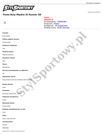 Informacje o produkcie Utworzono 03-03-2017 Puma Buty Męskie St Runner SD Cena : 169,99 zł Nr katalogowy : 35836302 Producent : Puma Dostępność : W magazynie Średnia ocena : brak recenzji Produkt: pl Buty Męskie Rodzaj zapięcia obuwia: y. Sznurowadła Podeszwa środkowa: Wnętrze butów: Materiał tekstylny Wysokość obcasa: brak Sezon: Jesień/Zima 42 Wskazówki użycia: lS p Rozmiar prezentowany na zdjęciach: buty przeznaczone do chodzenia rekreacyjnego Pełne Cholewka: St y Rodzaj obuwia: or to w EVA Elementy syntetyczne , Zamsz Podeszwa zewnętrzna: Guma Wysokość butów: Przed kostkę Kolekcja zaprojektowana na rok: 2015 Kolor: Szary i jego odcienie Przeznaczenie: Klasyka 35836302 Wygenerowano w programie www.oscGold.com Dostępne opcje Puma Buty Męskie St Runner SD St y lS p or to w y. pl Rozmiar: 39, 44.5, 44, 43, 42.5, 42, 41, 40.5, 40, 45.