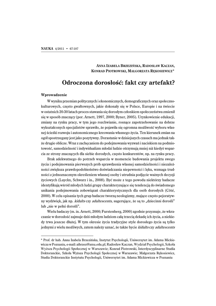 NAUKA 4/2011 • 67-107 ANNA IZABELA BRZEZIŃSKA, RADOSŁAW KACZAN, KONRAD PIOTROWSKI, MAŁGORZATA RĘKOSIEWICZ * Odroczona dorosłość: fakt czy artefakt? Wprowadzenie W wyniku przemian politycznych i ekonomicznych, demograficznych oraz społecznokulturowych, często gwałtownych, jakie dokonały się w Polsce, Europie i na świecie w ostatnich 20-30 latach proces stawania się dorosłym członkiem społeczeństwa zmienił się w sposób znaczący (por. Arnett, 1997, 2000; Byner, 2005). Urynkowienie edukacji, zmiany na rynku pracy, w tym jego rozchwianie, rosnące zapotrzebowanie na dobrze wykształconych specjalistów sprawiło, że pojawiła się ogromna możliwość wyboru własnej ścieżki rozwoju i autonomicznego kreowania własnego życia. Ten kierunek zmian na ogół spostrzegany jest jako pozytywny. Dorastanie w dzisiejszych czasach ma jednak także drugie oblicze. Wraz z zachęcaniem do podejmowania wyzwań i naciskiem na podmiotowość, samodzielność i indywidualizm młodzi ludzie otrzymują mniej niż kiedyś wsparcia ze strony znaczących dla siebie dorosłych, często konkurentów, np. na rynku pracy. Brak adekwatnego do potrzeb wsparcia w momencie budowania projektu swego życia i podejmowania pierwszych prób sprawdzenia własnej samodzielności i niezależności zwiększa prawdopodobieństwo doświadczania niepewności i lęku, wzmaga trudności z jednoznacznym określeniem własnej osoby i utrudnia podjęcie ważnych decyzji życiowych (Luyckx, Schwarz i in., 2008). Być może z tego powodu niektórzy badacze identyfikują wśród młodych ludzi grupy charakteryzujące się tendencją do świadomego unikania podejmowania zobowiązań charakterystycznych dla osób dorosłych (Côté, 2000). W celu opisania tych grup badacze tworzą neologizmy, mające często pejoratywny wydźwięk, jak np. kidults czy adultescents, sugerujące, że są to „dziecinni dorośli” lub „nie w pełni dorośli”. Wielu badaczy (m. in. Arnett, 2000; Furstenberg, 2000) zgodnie przyznaje, że wkraczanie w dorosłość zajmuje dziś młodym ludziom całą trzecią dekadę ich życia, a niekiedy trwa jeszcze dłużej. W tym okresie życia tradycyjne style dorosłego życia są tylko jednymi z wielu możliwych, zatem należy uznać, że także bycie kidults czy adultescents * Prof. dr hab. Anna Izabela Brzezińska, Instytut Psychologii, Uniwersytet im. Adama Mickiewicza w Poznaniu, e-mail: [email protected]; Radosław Kaczan, Wydział Psychologii, Szkoła Wyższa Psychologii Społecznej w Warszawie; Konrad Piotrowski, Interdyscyplinarne Studia Doktoranckie, Szkoła Wyższa Psychologii Społecznej w Warszawie; Małgorzata Rękosiewicz, Studia Doktoranckie Instytutu Psychologii, Uniwersytet im. Adama Mickiewicza w Poznaniu 68 Anna I. Brzezińska, Radosław Kaczan, Konrad Piotrowski, Małgorzata Rękosiewicz jest w pewnym sensie normatywne. Sposobów wkraczania w dorosłość może być wiele i trudno oceniać a priori ich adekwatność wobec społecznych oczekiwań. Możemy więc spotkać dwudziestosiedmiolatka mającego żonę, dziecko, stałą pracę i kredyt na mieszkanie oraz jego rówieśnika, który zamieszkuje w wynajętej kawalerce i wszystkie zarabiane pieniądze wydaje na utrzymanie motocykla. Pierwszą z tych osób prawdopodobnie nazwiemy dorosłą, w drugim przypadku możemy być bliżsi użycia pojęcia kidult. Niemniej warto pamiętać, że jedną z głównych cech coraz dłuższego obecnie okresu wkraczania w dorosłość jest to, że z punktu widzenia tak dzisiaj niestabilnych kryteriów społeczno-demograficznych nic nie jest bezwzględnie normatywne bądź nienormatywne (Arnett, 2000). Odraczanie wejścia w dorosłość i zmieniające się kryteria, zarówno zewnętrzne, jak i wewnętrzne, oceny tego, czy jednostka jest już dorosła, nie dotyczą w takim samym stopniu wszystkich młodych ludzi. Musimy zaznaczyć, zanim przejdziemy do głównego wątku naszego wywodu, że kształtowanie się poczucia dorosłości może wyglądać odmiennie w grupach różniących się przynależnością etniczną i statusem społeczno-ekonomicznym. Badania wskazują, iż młodzi ludzie z mniejszościowych grup etnicznych i o niższym statusie społecznym mają poczucie, że będą wchodzić w dorosłe role wcześniej. Co więcej, kiedy spojrzymy na wskaźnik obiektywny, jakim jest wiek rozpoczęcia pełnienia danej roli społecznej, faktycznie różnią się od swoich rówieśników pochodzących z grup bardziej uprzywilejowanych pod względem społeczno-ekonomicznym (Benson, Furstenberg, 2007). Analizując procesy odraczanego i czasami utrudnionego wchodzenia w dorosłość, koniecznie należy zauważyć, że opisywane przemiany dotknęły nie tylko ten okres przejściowy między dorastaniem a dorosłością, ale również okres przejściowy między wczesnym a środkowym etapem dorosłości, czyli wiek ok. 40/45 lat. Jak zauważają badacze (Freund, Nikitin, Ritter, 2009), postępujące procesy destandaryzacji i indywidualizacji ścieżek życiowych w nieco odmienny sposób dotyczą młodych dorosłych w porównaniu z osobami w wieku średnim czy w okresie późnej dorosłości. Słabnięcie normatywnych nacisków dotyczących zadań rozwojowych dorosłości i związane z tym pojawiające się możliwości indywidualnego wyboru co do ich kolejności i tempa realizacji nie spowodowały znacznego przesunięcia się tych zadań na kolejne, późniejsze okresy. Młodzi ludzie odczuwają jednak silną presję związaną z koniecznością zmagania się z wieloma zadaniami jednocześnie. W krótkim przecież okresie wczesnej i początków środkowej dorosłości (20-40/45 lat) mają zakończyć główny etap edukacji, usamodzielnić się pod względem rodzinnym, rozpocząć życie zawodowe i rodzinne, aby zaraz potem zacząć osiągać poważne sukcesy w każdym z tych obszarów. To zjawisko nagromadzenia zadań, wzmagane jeszcze przez odkładanie czy opóźnianie realizacji części z nich, nazy
