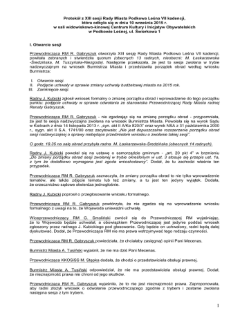 Protokół z XIII sesji Rady Miasta Podkowa Leśna VII kadencji, która odbyła się w dniu 10 września 2015 r. w sali widowiskowo-kinowej Centrum Kultury i Inicjatyw Obywatelskich w Podkowie Leśnej, ul. Świerkowa 1 I. Otwarcie sesji Przewodnicząca RM R. Gabryszuk otworzyła XIII sesję Rady Miasta Podkowa Leśna VII kadencji, powitała zebranych i stwierdziła quorum (obecnych 13 radnych, nieobecni: M. Łaskarzewska -Średzińska, M. Tuszyńska-Niezgoda). Następnie przekazała, Ŝe jest to sesja zwołana w trybie nadzwyczajnym na wniosek Burmistrza Miasta i przedstawiła porządek obrad według wniosku Burmistrza: I. Otwarcie sesji. II. Podjęcie uchwały w sprawie zmiany uchwały budŜetowej miasta na 2015 rok. III. Zamknięcie sesji. Radny J. Kubicki zgłosił wniosek formalny o zmianę porządku obrad i wprowadzenie do tego porządku punktu: podjęcie uchwały w sprawie odwołania ze stanowiska Przewodniczącej Rady Miasta radnej Renaty Gabryszuk. Przewodnicząca RM R. Gabryszuk - nie zgadzając się na zmianę porządku obrad - przypomniała, Ŝe jest to sesja nadzwyczajna zwołana na wniosek Burmistrza Miasta. Powołała się na wyrok Sądu w Kielcach z dnia 14 listopada 2013 r. „syn. akt II A/Ke 820/3” oraz wyrok NSA z 31 października 2000 r., sygn. akt II S.A. 1741/00 oraz zacytowała: „Nie jest dopuszczalne rozszerzenie porządku obrad sesji nadzwyczajnej o sprawy niebędące przedmiotem wniosku o zwołanie takiej sesji”. O godz. 18.35 na salę obrad przybyła radna M. Łaskarzewska-Średzińska (obecnych 14 radnych). Radny J. Kubicki powołał się na ustawę o samorządzie gminnym - „art. 20 pkt 4” w brzmieniu „Do zmiany porządku obrad sesji zwołanej w trybie określonym w ust. 3 stosuje się przepis ust. 1a, z tym Ŝe dodatkowo wymagana jest zgoda wnioskodawcy”. Dodał, Ŝe tu zachodzi właśnie ten przypadek. Przewodnicząca RM R. Gabryszuk zaznaczyła, Ŝe zmiany porządku obrad to nie tylko wprowadzenie tematów, ale takŜe zdjęcie tematu lub teŜ zmiany, a tu jest ten jedyny wyjątek. Dodała, Ŝe orzecznictwo sądowe stwierdza jednogłośnie. Radny J. Kubicki poprosił o przegłosowanie wniosku formalnego. Przewodnicząca RM R. Gabryszuk powtórzyła, Ŝe nie zgadza się na wprowadzenie wniosku formalnego z uwagi na to, Ŝe Wojewoda uniewaŜni uchwałę. Wiceprzewodniczący RM G. Smoliński zwrócił się do Przewodniczącej RM wyjaśniając, Ŝe to Wojewoda będzie uchwalał, a obowiązkiem Przewodniczącej jest jedynie poddać wniosek zgłoszony przez radnego J. Kubickiego pod głosowanie. Gdy będzie on uchwalony, radni będą dalej dyskutować. Dodał, Ŝe Przewodnicząca RM nie ma prawa wstrzymywać tego rodzaju czynności. Przewodnicząca RM R. Gabryszuk powiedziała, Ŝe chciałaby zasięgnąć opinii Pani Mecenas. Burmistrz Miasta A. Tusiński wyjaśnił, Ŝe nie ma dziś Pani Mecenas. Przewodnicząca KKOSiSS M. Stępka dodała, Ŝe chodzi o przedstawiciela obsługi prawnej. Burmistrz Miasta A. Tusiński odpowiedział, Ŝe nie ma przedstawiciela obsługi prawnej. Dodał, Ŝe nieznajomość prawa nie chroni od jego skutków. Przewodnicząca RM R. Gabryszuk wyjaśniła, Ŝe to nie jest nieznajomość prawa. Zaproponowała, aby radni złoŜyli wniosek o odwołanie przewodniczącego zgodnie z trybem i zostanie zwołana następna sesja z tym trybem. 1 Wiceprzewodniczący RM G. Smoliński ponowił wniosek o poddanie zgłoszonego wniosku pod głosowanie. Zaznaczył, Ŝe jest to wniosek formalny, a wniosek formalny kieruje się określonymi zasadami i powinien być bez zbędnej dyskusji poddany pod głosowanie. Przewodnicząca RM R. Gabryszuk przypomniała, Ŝe uchwała ta zostanie uniewaŜniona przez Wojewodę oraz Wojewódzki Sąd Administracyjny. Po tym stwierdzeniu poddała wniosek formalny pod głosowanie - zapytała kto jest za zmianą porządku obrad. Wiceprzewodniczący RM G. Smoliński zwrócił się do Przewodniczącej RM wyjaśniając, Ŝe zmiana porządku obrad w artykule, na który powołuje się dzisiejsze zawiadomienie skutkuje tym, Ŝe to nie radni zmieniają porządek obrad, lecz zgodę musi wyrazić zwołujący i wnoszący o zwołanie sesji, czyli Burmistrz. Przewodnicząca RM R. Gabryszuk odpowiedziała, Ŝe jest to nadinterpretacja, bo radni równieŜ głosują. Burmistrz Miasta A. Tusiński nawiązując do kwestii formalnych wyjaśnił, Ŝe Przewodnicząca RM w momencie, w którym poddaje wniosek formalny pod głosowanie powinna zapytać wnioskodawcę zwołującego sesję o to, czy wyraŜa zgodę na zmianę porządku obrad. Przewodnicząca RM R. Gabryszuk zgodziła się z tym i zapytała Burmistrza Miasta czy wyraŜa zgodę na zmianę porządku obrad. Burmistrz Miasta A. Tusiński odpowiedział, Ŝe wyraŜa zgodę. Przewodnicząca RM R. Gabryszuk poddała wniosek formalny o zgodę na zmianę porządku obrad pod głosowanie. Radni w głosowaniu: 9 głosów „za”, 5 głosów „przeciw”, 0 głosów „wstrzymuję się” przegłosowali zmianę porządku obrad. Przewodnicząca RM R. Gabryszuk ogłosiła, Ŝe nastąpiła zmiana porządku obrad - wniosek został przyjęty. Następnie radny J. Kubicki przekazał Przewodniczącej RM R. Gabryszuk „Wniosek o zmianę porządku obrad XIII sesji Rady Miasta Podkowa Leśna dniu 10.09.2015 roku i wprowadzenie do tego porządku punktu: 1. Podjęcie uchwały w sprawie odwołania ze stanowiska Przewodniczącej Rady Miasta radnej Renaty Gabryszuk” podpisany przez grupę radnych. Przewodnicząca RM R. Gabryszuk odczytała złoŜony wniosek (załącznik nr 1 do protokołu). Następnie Przewodnicząca RM R. Gabryszuk, powołując się na § 25 ust. 3 statutu miasta, powiedziała, Ŝe wniosek o odwołanie powinien zawierać parafowany projekt uchwały i uzasadnienie, poprosiła o przedłoŜenie uzasadnienia. Radni przekazali Przewodniczącej RM R. Gabryszuk projekt uchwały wraz z uzasadnieniem, a Przewodnicząca RM odczytała je zebranym (załącznik nr 2 do protokołu). Dodała, Ŝe wni
