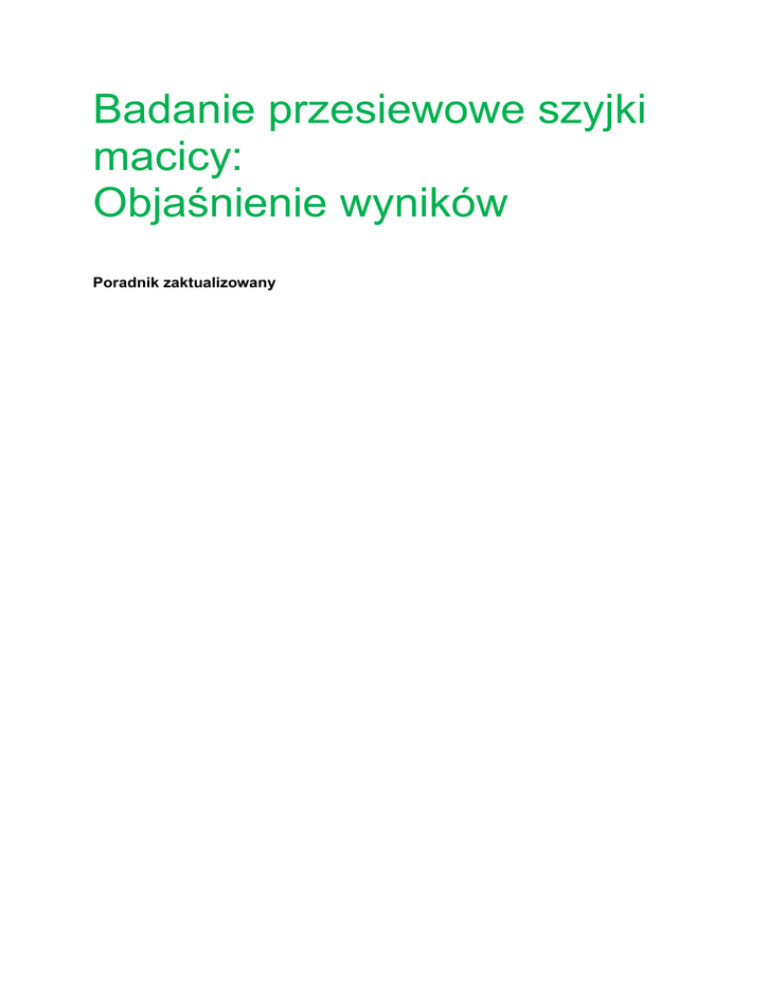 Badanie przesiewowe szyjki macicy: Objaśnienie wyników Poradnik zaktualizowany Page 2 Niniejsza ulotka zawiera objaśnienie wyników badania przesiewowego szyjki macicy, które ma na celu wykrywanie zmian szyjki (dolnej części) macicy, tak aby umożliwić ich skuteczną obserwację lub leczenie.N Co powoduje zmiany? Większość zmian jest spowodowana obecnością wirusa brodawczaka ludzkiego (HPV), który może uszkadzać komórki szyjki macicy. HPV przenosi się najczęściej przez kontakt skórny podczas stosunku seksualnego. Infekcji nie towarzyszą zazwyczaj żadne objawy, a osoby zakażone nie są świadome nosicielstwa. Istnieje ponad 100 typów tych wirusów. Większość z nich jest nieszkodliwa, jednak odkryto, że niewielka liczba typów podwyższonego ryzyka może powodować raka. Zazwyczaj układ odpornościowy jest w stanie naturalnie zwalczyć wirusa. Jeżeli jednak wirus przetrwa, może uszkodzić komórki szyjki macicy. Otrzymałam wyniki „w normie” - co to oznacza? Ponad 90 na każde 100 przebadanych kobiet uzyskuje wyniki w normie. Oznacza to, że w komórkach nie wykryto nieprawidłowych zmian. Jeżeli jest Pani w przedziale wiekowym 25 - 49 lat, zaprosimy Panią na badanie za trzy lata. Panie w wieku od 50 do 64 lat zostaną poproszone o powtórzenie badania za pięć lat. Page 3 Co oznacza wynik „niewystarczający”? Taki wynik oznacza, że w pobranej próbce znalazło się zbyt mało komórek. Taki wynik nie jest niczym niezwykłym i zdarza się w około 3 na każde 100 przeprowadzonych badań. W takiej sytuacji zostanie Pani poproszona o powtórzenie badania za trzy miesiące. Otrzymałam wynik „nieprawidłowy” - co to oznacza? Taki wynik oznacza, że w próbce komórek wykryto zmiany. Zdarza się to u około 7 na każde 100 przebadanych kobiet. Dalsze działania zależeć będą od tego, czy wykryte zostały zmiany łagodne, umiarkowane czy znaczne. Szczegółowych informacji na ten temat udzieli Pani lekarz lub pielęgniarka. Wykryto u mnie zmiany łagodne lub na granicy normy - co dalej? Taki wynik nie oznacza wykrycia raka i w większości przypadków nie prowadzi do rozwoju nowotworu. Próbka pobrana do badania przesiewowego szyjki macicy zostanie również zbadana na obecność wirusa HPV. Pobranie kolejnej próbki nie będzie konieczne. • W przypadku wykrycia wirusa HPV otrzyma Pani skierowanie na szczegółowe badanie szyjki macicy, czyli kolposkopię. • Jeżeli badanie nie wykryje obecności wirusa HPV, oznacza to, że ryzyko rozwoju raka jest bardzo niskie i w tej chwili nie ma potrzeby wykonywać kolejnych badań. Zostanie Pani zaproszona na kolejne rutynowe badanie przesiewowe za trzy lub pięć lat. Wykryto u mnie zmiany umiarkowane lub znaczne - co dalej? Prawdopodobieństwo nowotworu jest niskie. W celu określenia, czy konieczne jest leczenie, wykonana zostanie kolposkopia. Wszelkie ewentualne metody leczenia są zazwyczaj proste i przeprowadza się je z miejscowym znieczuleniem Page 4 w poradni w lokalnym szpitalu. Ważne jest, aby zmiany zostały zbadane i wyleczone natychmiast, tak aby nie mogły rozwinąć się z czasem w poważniejszy problem zdrowotny. Co to jest kolposkopia? Kolposkopia to proste badanie szyjki macicy za pomocą kolposkopu (rodzaj szkła powiększającego). Umożliwia ono lekarzowi lub wykwalifikowanej pielęgniarce dokładniejsze przyjrzenie się zmianom na szyjce macicy i określenie, czy zachodzi potrzeba leczenia. Badanie to przypomina badanie przesiewowe. Kolposkopię można wykonywać bezpiecznie w czasie ciąży. Badanie nie wpływa w żaden sposób na poród dziecka ani możliwość zajścia w kolejną ciążę. Na czym polega leczenie? Leczenie polega na usunięciu obszaru zmienionych komórek z szyjki macicy i niemal w każdym przypadku kończy się powodzeniem. Wybór sposobu leczenia i związane z nim zagrożenia zostaną Pani przedstawione szczegółowo w poradni. W niektórych przypadkach może zostać Pani zaproszona na kolejną kolposkopię. Około 6 miesięcy po zabiegu zaprosimy Panią na kolejne badanie przesiewowe szyjki macicy, aby sprawdzić, czy zabieg odniósł skutek. Jeżeli wynik badania będzie w normie lub wykaże zmiany łagodne lub na granicy normy, Pani próbka zostanie przebadana na obecność wirusa HPV. Jest to tak zwana ocena odsetka wyleczeń. Jeżeli badanie nie wykaże obecności wirusa HPV, ryzyko rozwoju choroby szyjki macicy w obecnej chwili jest bardzo niskie. Mimo to ważne jest, aby poddać się kolejnemu badaniu przesiewowemu za trzy lub pięć lat. Jeżeli badanie przesiewowe szyjki macicy wykaże zmiany umiarkowane lub znaczne lub wykryta zostanie obecność wirusa HPV, zostanie Pani skierowana na powtórną kolposkopię. Jeżeli jednak, co jest mało prawdopodobne, wykryty zostanie u Pani nowotwór szyjki macicy, zostanie Pani skierowana do odpowiednich specjalistów i poradni. Page 5 Co z seksem i ciążą? Hormony produkowane w okresie ciąży utrudniają leczenie. Jeżeli w chwili obecnej nie jest Pani w ciąży, zaleca się, aby nie zachodzić w ciążę do wyleczenia zmian komórek. Aktywność seksualna nie ma negatywnego wpływu na zmiany komórek, a nieprawidłowe komórki nie przenoszą się na partnera. Należy jednak pamiętać o stosowaniu skutecznej antykoncepcji. Page 6 Dodatkowe informacje W przypadku jakichkolwiek pytań lub obaw związanych z wynikami badań przesiewowych należy porozmawiać z lekarzem rodzinnym lub osobą, która przeprowadziła badanie. Proszę upewnić się, że lekarz rodzinny zawsze dysponuje Pani aktualnym adresem zamieszkania. www.cancerscreening.hscni.net Opracowanie: Public Health Agency, 12–22 Linenhall Street, Belfast BT2 8BS. Tel.: 0300 555 0114 (stawka za połączenie lokalne) www.publichealth.hscni.net