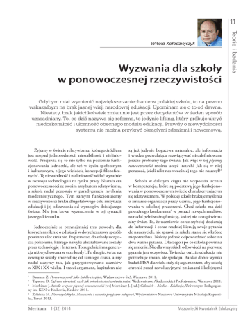 11 Wyzwania dla szkoły w ponowoczesnej rzeczywistości Teorie i badania :LWROG.RğRG]LHMF]\N Gdybym miał wymienić największe zaniechanie w polskiej szkole, to na pewno wskazałbym na brak jasnej wizji narodowej edukacji. Upominam się o to od dawna. Niestety, brak jakichkolwiek zmian nie jest przez decydentów w żaden sposób uzasadniany. To, co dziś nazywa się reformą, to jedynie lifting, który próbuje ukryć niedoskonałość i ułomność obecnego modelu edukacji. Prawdy o niewydolności systemu nie można przykryć okrągłymi zdaniami i nowomową. Żyjemy w świecie relatywizmu, którego źródłem jest rozpad jednorodności, niestabilność i nieliniowość. Przejawia się to nie tylko na poziomie funkcjonowania jednostki, ale też w życiu społecznym i kulturowym, z jego wielością koncepcji filozoficznych1. Tę niestabilność i nieliniowość widać wyraźnie w rozwoju technologii i na rynku pracy. Nastała era ponowoczesności ze swoim atrybutem relatywizmu, a szkoła nadal pozostaje w paradygmacie myślenia modernistycznego. Tym samym funkcjonujemy w rzeczywistości braku długofalowego celu instytucji edukacji i jej odstawania od wymogów dzisiejszego świata. Nie jest łatwe wyznaczenie w tej sytuacji jasnego kierunku. Jednocześnie są przynajmniej trzy powody, dla których myślenie o edukacji w dotychczasowy sposób powinno ulec zmianie. Po pierwsze, do szkoły uczęszcza pokolenie, którego nawyki ukształtowane zostały przez technologię i Internet. To zupełnie inna generacja niż wychowana w erze kredy2. Po drugie, świat na zewnątrz szkoły zmienił się od tamtego czasu, a my nadal uczymy tak, jak przygotowywano uczniów w XIX i XX wieku. I trzeci argument, kapitałem nie są już jedynie bogactwa naturalne, ale informacja i wiedza pozwalająca rozwiązywać niezdefiniowane jeszcze problemy tego świata. Jak więc w tej płynnej nowoczesności można uczyć innych? Jak się w niej poruszać, jeżeli nikt nas wcześniej tego nie nauczył?3 Szkoła w dalszym ciągu nie wyposaża ucznia w kompetencje, które są podstawą jego funkcjonowania w ponowoczesnym świecie charakteryzującym się relatywizmem. W polskiej szkole brakuje myślenia o zmianie organizacji pracy ucznia, jego funkcjonowaniu w szkolnej przestrzeni. Choć szkoła ma dziś poważnego konkurenta4 w postaci nowych mediów, to nadal pełni ważną funkcję, której nie zastąpi wirtualny świat. To, że uczniowie coraz szybciej docierają do informacji i coraz rzadziej kierują swoje pytania do nauczycieli, nie sprawi, że szkoła stanie się wkrótce niepotrzebna. Należy jednak odpowiedzieć sobie na dwa ważne pytania. Dlaczego i po co szkoła powinna się zmienić. Nie dla wszystkich odpowiedź na pierwsze pytanie jest oczywista. Twierdzą oni, że edukacja nie potrzebuje zmian, ale spokoju. Bardzo dobre wyniki badań PISA dla wielu stały się argumentem, aby szkołę chronić przed rewolucyjnymi zmianami i kolejnymi Bauman Z. Ponowoczesność jako źródło cierpień, Wydawnictwo Sic!, Warszawa 2011. Tapscott D. Cyfrowa dorosłość, czyli jak pokolenie sieci zmienia świat, Wydawnictwo Akademickie i Profesjonalne, Warszawa 2011. 3 Morbitzer J. Szkoła w epoce płynnej nowoczesności [w:] Morbitzer J. [red.] Człowiek – Media – Edukacja, Uniwersytet Pedagogiczny im. KEN w Krakowie, Kraków 2011. 4 Żylińska M. Neurodydaktyka. Nauczanie i uczenie przyjazne mózgowi, Wydawnictwo Naukowe Uniwersytetu Mikołaja Kopernika, Toruń 2013. 1 2 Meritum 1 (32) 2014 Mazowiecki Kwartalnik Edukacyjny :LWROG.RğRG]LHMF]\N 12 Teorie i badania reformatorami. Sukcesy polskich gimnazjalistów są usprawiedliwieniem braku podejmowania radykalnych decyzji. A przecież świat się nieustannie zmienia. To jego atrybut. Pojawiło się pokolenie, którego nawyki ukształtowała technologia. Mamy niemal nieograniczony dostęp do mobilnych technologii i informacji. Bezpowrotnie odebrano szkole monopol na ich przekazywanie. Dawny powód przychodzenia do szkoły przestał mieć znaczenie. Szkoła nie może być dziś definiowana jako miejsce zdobywania wiedzy. Stąd uzasadnione jest poszukiwanie nowego modelu edukacji. Jest jeszcze drugie pytanie, dużo ważniejsze od pierwszego, na które potrzebujemy odpowiedzi: po co szkoła? Bo powód budowania dwieście lat temu systemu jest już nieaktualny. To pytanie o jej ideologiczną rolę. Czy szkoła to miejsce, w którym kształtujemy pokolenie w ten sposób, aby pozostawiało po sobie lepszy świat, czy też miejsce przekazywania tożsamości, wartości, tradycji i postaw ważnych dla narodu. Profesor Tomasz Szkudlarek z Uniwersytetu Gdańskiego wymienia jeszcze trzecią funkcję szkoły – miejsce rozwijania i kształtowania jednostek, które będę potrafiły znaleźć się w zmieniającym się świecie, szanując swoją odrębność5. Jednocześnie twierdzi, że role te są nawzajem sprzeczne i że zawsze będą nam towarzyszyły polityczne konflikty. Może to jest powód, dla którego tak trudno jest określić podzielaną przez wszystkich misję narodowej edukacji? Niech szkoła stanie się dla uczniów miejscem, w którym przygotowuje się szczęśliwe społeczeństwo przyszłości Do tej pory szkołę traktowaliśmy jako najważniejsze źródło informacji. Dziś już tak nie jest. Aż 58% amerykańskich studentów poszukuje informacji w Internecie, 45% pyta swoich przyjaciół, 38% sięga do książek, a tylko 13% udaje się do biblioteki. Potwierdzają to również badania przeprowadzone na Uniwersytecie Warszawskim przez prof. Barbarę Fatygę6. Wynika z nich, że tylko kilka procent warszawskich uczniów zwraca się po informację do nauczycieli. Coraz powszechniejszy dostęp do cyfrowej literatury (e-booków), podręczników, poradników, a także literatury pięknej sprawia, że zmienia się rola nauczyciela we współczesnej szkole. Podczas licznych szkoleń utwierdziliśmy się w przekonaniu, że nauczyciele zdają sobie sprawę z wyzwania, jaki
