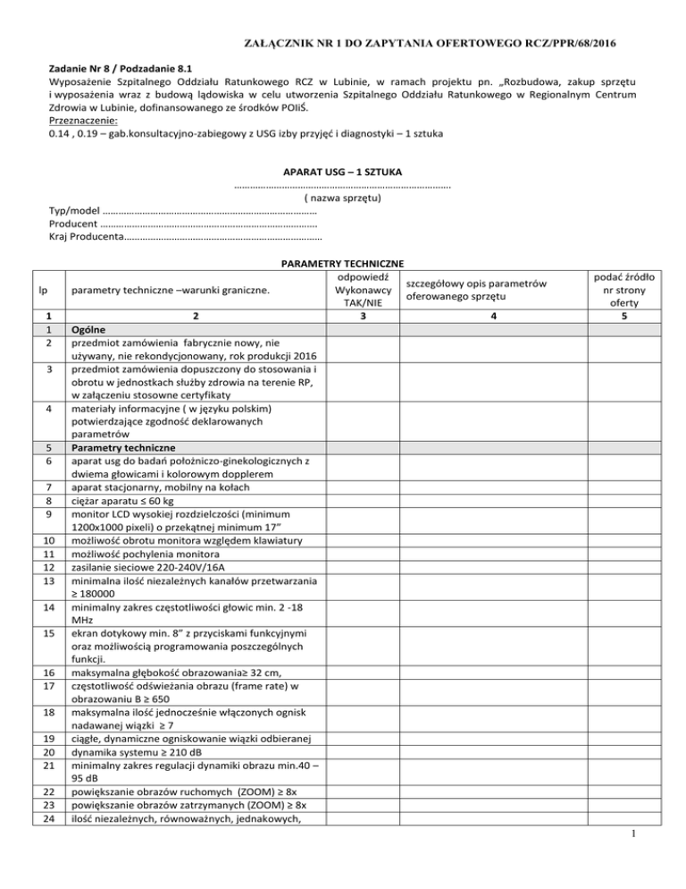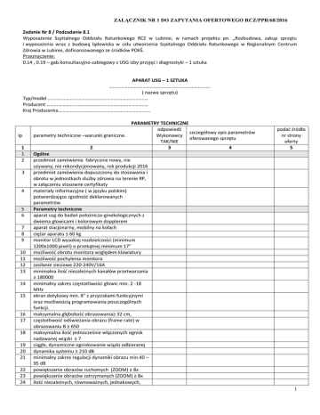 ZAŁĄCZNIK NR 1 DO ZAPYTANIA OFERTOWEGO RCZ/PPR/68/2016 Zadanie Nr 8 / Podzadanie 8.1 Wyposażenie Szpitalnego Oddziału Ratunkowego RCZ w Lubinie, w ramach projektu pn. „Rozbudowa, zakup sprzętu i wyposażenia wraz z budową lądowiska w celu utworzenia Szpitalnego Oddziału Ratunkowego w Regionalnym Centrum Zdrowia w Lubinie, dofinansowanego ze środków POIiŚ. Przeznaczenie: 0.14 , 0.19 – gab.konsultacyjno-zabiegowy z USG izby przyjęć i diagnostyki – 1 sztuka APARAT USG – 1 SZTUKA ………………………………………………………………………. ( nazwa sprzętu) Typ/model ……………………………………………………………………… Producent ………………………………………………………………………. Kraj Producenta………………………………………………………………… lp 1 1 2 3 4 5 6 7 8 9 10 11 12 13 14 15 16 17 18 19 20 21 22 23 24 PARAMETRY TECHNICZNE odpowiedź szczegółowy opis parametrów parametry techniczne –warunki graniczne. Wykonawcy oferowanego sprzętu TAK/NIE 2 3 4 Ogólne przedmiot zamówienia fabrycznie nowy, nie używany, nie rekondycjonowany, rok produkcji 2016 przedmiot zamówienia dopuszczony do stosowania i obrotu w jednostkach służby zdrowia na terenie RP, w załączeniu stosowne certyfikaty materiały informacyjne ( w języku polskim) potwierdzające zgodność deklarowanych parametrów Parametry techniczne aparat usg do badań położniczo-ginekologicznych z dwiema głowicami i kolorowym dopplerem aparat stacjonarny, mobilny na kołach ciężar aparatu ≤ 60 kg monitor LCD wysokiej rozdzielczości (minimum 1200x1000 pixeli) o przekątnej minimum 17” możliwość obrotu monitora względem klawiatury możliwość pochylenia monitora zasilanie sieciowe 220-240V/16A minimalna ilość niezależnych kanałów przetwarzania ≥ 180000 minimalny zakres częstotliwości głowic min. 2 -18 MHz ekran dotykowy min. 8” z przyciskami funkcyjnymi oraz możliwością programowania poszczególnych funkcji. maksymalna głębokość obrazowania≥ 32 cm, częstotliwość odświeżania obrazu (frame rate) w obrazowaniu B ≥ 650 maksymalna ilość jednocześnie włączonych ognisk nadawanej wiązki ≥ 7 ciągłe, dynamiczne ogniskowanie wiązki odbieranej dynamika systemu ≥ 210 dB minimalny zakres regulacji dynamiki obrazu min.40 – 95 dB powiększanie obrazów ruchomych (ZOOM) ≥ 8x powiększanie obrazów zatrzymanych (ZOOM) ≥ 8x ilość niezależnych, równoważnych, jednakowych, podać źródło nr strony oferty 5 1 25 26 27 28 29 30 31 32 33 34 35 36 37 38 39 40 41 42 43 44 45 46 47 48 49 50 51 52 53 54 55 ZAŁĄCZNIK NR 1 DO ZAPYTANIA OFERTOWEGO RCZ/PPR/68/2016 przełączanych z klawiatury gniazd do podłączenia głowic obrazowych ≥ 3 archiwizacja pojemność pamięci CINE dla obrazów B (2D) ≥2000 archiwizacja raportów z badań, obrazów i pętli obrazowych na wewnętrznym twardym dysku o pojemności min. 500 GB możliwość zapisu obrazów i pętli obrazowych na pamięciach typu USB PenDrive w formatach jpeg i avi. możliwość konfiguracji własnych raportów videoprinter czarno-biały sterowany z klawiatury aparatu możliwość bezpośredniego podłączenia drukarki komputerowej do wydruku raportów z badań. tryby obrazowania B (2D) podział ekranu na dwa obrazy obrazowanie w technice 2 harmonicznej z inwersją fazy automatyczna optymalizacja obrazu 2D za pomocą jednego przycisku w zależności od treści obrazu obrazowanie wielokierunkowe (compounding) – wysyłanie przez te same kryształy głowicy kilku wiązek ultradźwiękowych pod różnymi kątami (np SonoCT) – min. 7 różnych kątów regulacja wzmocnienia głębokościowego TGC – minimum 8 fizycznych suwaków regulacyjnych obrazowanie B z poprawą rozdzielczości kontrastowej poprzez eliminację szumów plamek obrazów (speckle reduction) obrazowanie trapezowe i rombowe na głowicy liniowej doppler spektralny z falą pulsacyjną (pw-D) funkcja HPRF maksymalna mierzona prędkość przepływu przy zerowym kącie ≥ 7,5 m/s zakres regulacji korekcji kąta min. 0 – 85° możliwość regulacji położenia linii bazowej i korekcji kąta na zatrzymanym obrazie i na obrazach odtwarzanych z dysku minimalny zakres regulacji wielkości bramki min. 1 – 15 mm kolor doppler możliwość ugięcia wiązki dopplera kolorowego możliwość niezależnej regulacji wzmocnienia B i wzmocnienia koloru na pętlach obrazowych odtwarzanych z pamięci power doppler power doppler z detekcją kierunku przepływu jednoczesna prezentacja na ekranie w czasie rzeczywistym ruchomych obrazów B (2D), dopplera kolorowego i dopplera spektralnego (triplex) jednoczesna prezentacja na podzielonym ekranie w czasie rzeczywistym ruchomych obrazów w trybie B (2D) i B+kolor doppler głowice głowica wieloczęstotliwościowa typu convex 2 56 57 58 59 60 61 62 63 64 65 66 67 68 69 70 71 72 73 74 75 76 77 78 79 ZAŁĄCZNIK NR 1 DO ZAPYTANIA OFERTOWEGO RCZ/PPR/68/2016 o zakresie częstotliwości obrazowania B (2D) obejmującym przedział min.2,5 – 5,0 MHz. głębokość obrazowania ≥ 32 cm obrazowanie w technice 2 harmonicznej na min 3 parach częstotliwości podać częstotliwości możliwość zmiany częstotliwości dopplera spektralnego, min. 2 różne częstotliwości (podać częstotliwości) promień czoła głowicy z zakresu 55-60 mmR, podać głowica endocavitarna, elektroniczna wieloczęstotliwościowa o zakresie częstotliwości obrazowania B (2D) obejmującym przedział 6,0 – 9,0 MHz szerokość kąta obrazowania min. 160 stopni obrazowanie w technice 2 harmonicznej na minimum 3 parach częstotliwości, podać częstotliwości możliwość zmiany częstotliwości dopplera spektralnego, minimum 2 różne częstotliwości, podać częstotliwości kompatybilność głowic z pozostałymi oferowanymi ultrasonografami oprogramowanie pomiarowe ogólne: odległości, powierzchni, objętości, % zwężenia z dwóch obrys
