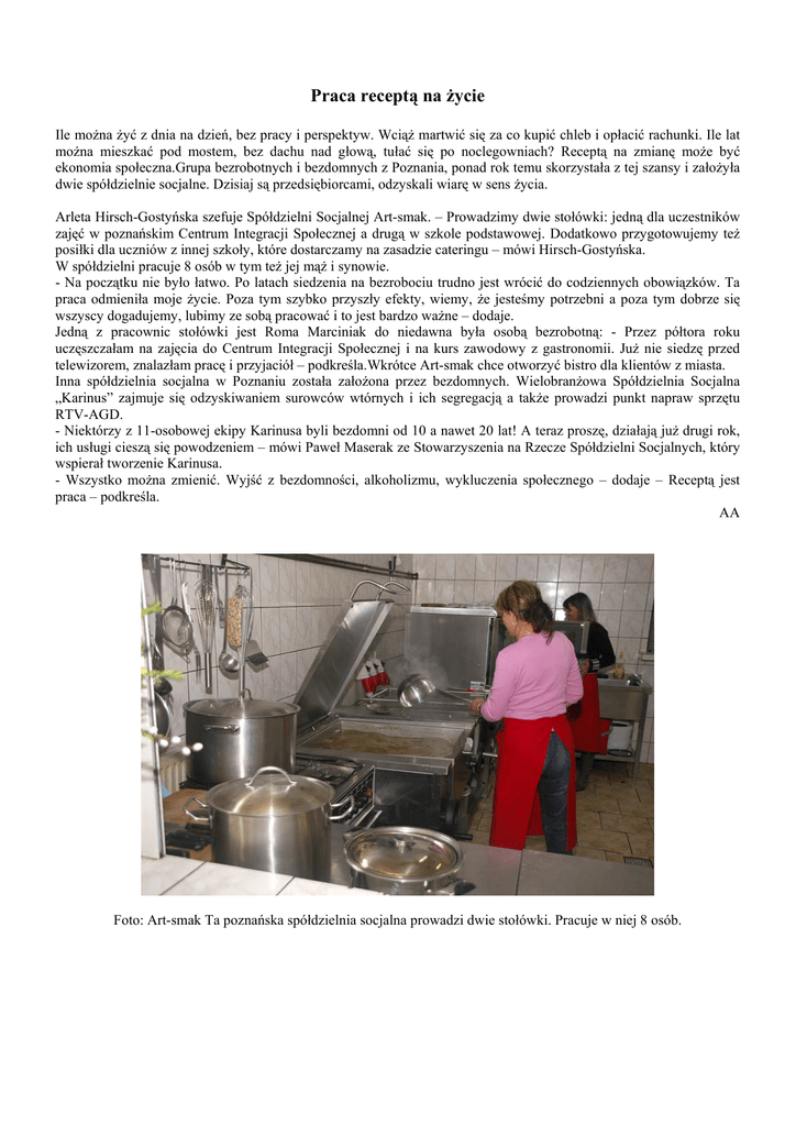 Praca receptą na życie Ile można żyć z dnia na dzień, bez pracy i perspektyw. Wciąż martwić się za co kupić chleb i opłacić rachunki. Ile lat można mieszkać pod mostem, bez dachu nad głową, tułać się po noclegowniach? Receptą na zmianę może być ekonomia społeczna.Grupa bezrobotnych i bezdomnych z Poznania, ponad rok temu skorzystała z tej szansy i założyła dwie spółdzielnie socjalne. Dzisiaj są przedsiębiorcami, odzyskali wiarę w sens życia. Arleta Hirsch-Gostyńska szefuje Spółdzielni Socjalnej Art-smak. – Prowadzimy dwie stołówki: jedną dla uczestników zajęć w poznańskim Centrum Integracji Społecznej a drugą w szkole podstawowej. Dodatkowo przygotowujemy też posiłki dla uczniów z innej szkoły, które dostarczamy na zasadzie cateringu – mówi Hirsch-Gostyńska. W spółdzielni pracuje 8 osób w tym też jej mąż i synowie. - Na początku nie było łatwo. Po latach siedzenia na bezrobociu trudno jest wrócić do codziennych obowiązków. Ta praca odmieniła moje życie. Poza tym szybko przyszły efekty, wiemy, że jesteśmy potrzebni a poza tym dobrze się wszyscy dogadujemy, lubimy ze sobą pracować i to jest bardzo ważne – dodaje. Jedną z pracownic stołówki jest Roma Marciniak do niedawna była osobą bezrobotną: - Przez półtora roku uczęszczałam na zajęcia do Centrum Integracji Społecznej i na kurs zawodowy z gastronomii. Już nie siedzę przed telewizorem, znalazłam pracę i przyjaciół – podkreśla.Wkrótce Art-smak chce otworzyć bistro dla klientów z miasta. Inna spółdzielnia socjalna w Poznaniu została założona przez bezdomnych. Wielobranżowa Spółdzielnia Socjalna „Karinus” zajmuje się odzyskiwaniem surowców wtórnych i ich segregacją a także prowadzi punkt napraw sprzętu RTV-AGD. - Niektórzy z 11-osobowej ekipy Karinusa byli bezdomni od 10 a nawet 20 lat! A teraz proszę, działają już drugi rok, ich usługi cieszą się powodzeniem – mówi Paweł Maserak ze Stowarzyszenia na Rzecze Spółdzielni Socjalnych, który wspierał tworzenie Karinusa. - Wszystko można zmienić. Wyjść z bezdomności, alkoholizmu, wykluczenia społecznego – dodaje – Receptą jest praca – podkreśla. AA Foto: Art-smak Ta poznańska spółdzielnia socjalna prowadzi dwie stołówki. Pracuje w niej 8 osób. Zaczęło się w Wielkopolsce Anna Augustowska: Poznańskie Stowarzyszenie na Rzecz Spółdzielni Socjalnych działa od zaledwie trzech lat a już można powiedzieć, że jest kolebką ekonomii społecznej. Skąd pomysł na tę działalność? Przemysław Piechocki prezes Stowarzyszenia na Rzecz Spółdzielni Socjalnych w Poznaniu:- Pomysł podsunęło nam samo życie. Od lat rośnie grupa osób wykluczonych i zmarginalizowanych, którym zwykle proponuje się życie na garnuszku pomocy społecznej. Tym czasem na świecie min. we Włoszech ludzie niepełnosprawni, bezrobotni, bezdomni itd. są aktywizowani zawodowo min. po przez ułatwianie im zakładania własnych przedsiębiorstw – bo tak można nazwać spółdzielnie socjalne. W Polsce też są tacy ludzie i to im właśnie postanowiliśmy pomóc. Nie wszyscy przecież chcą żyć tylko z zasiłku czy pracować dorywczo w szarej strefie. Do dziś udało się nam bezpośrednio pomóc w stworzeniu ponad 10 spółdzielni socjalnych, a przy co najmniej 10 kolejnych, służyliśmy radą i wsparciem formalno-prawnym, merytorycznym i finansowym. Obecnie w Wielkopolsce działa około 30 spółdzielni socjalnych, w których pracują przede wszystkim osoby długotrwale bezrobotne i bezdomne ale są też spółdzielnie w których część członków założycieli to osoby niepełnosprawne. Co jest najtrudniejsze w stworzeniu spółdzielni socjalnej? Przede wszystkim znalezienie pomysłu na działalność! Tak aby spełniał oczekiwania osób, które zakładają spółdzielnie a więc był zgodny z ich doświadczeniem zawodowym i możliwościami ale także wypełniał pewną lukę w lokalnym rynku bo tylko wtedy taka działalność będzie mogła się rozwijać. Właśnie wyszukiwaniem takich „wolnych pól” zajmuje się nasze stowarzyszenie. Szukamy nisz, w których małe firmy mogą rozwinąć skrzydła oraz staramy się budować świadomość w lokalnych społecznościach tworząc rynki zleceń i przyjazne środowisko dla powstawania tego typu podmiotów Jakiego rodzaju jest ta działalność? Bardzo różnorodna. Mamy np. spółdzielnię socjalną „Przystań”, którą utworzyły osoby bezdomne i bezrobotne. Jej członkowie opiekują się plażą publiczną nad jeziorem Kierskim w Poznaniu. Prowadzą wypożyczalnie sprzętu wodnego typu: rowery wodne, kajaki i leżaki, dbają o czystość, a po sezonie świadczą usługi porządkowe. Spółdzielnia „Maxstyl” prowadzi dwa sklepy z używaną odzieżą i meblami oraz stoiska targowe, inna ze spółdzielni „Sylka” ma parking strzeżony i prowadzi usługi budowlane. *Rozumiem, że do Stowarzyszenia można też przyjść z własnym pomysłem? -Oczywiście, przecież istota spółdzielczości socjalnej polega na tym, aby tworzyły ją osoby, które chcą coś razem robić. Jeśli zgłosi się do nas np. pięć krawcowych które będą chciały założyć spółdzielnie i szyć w niej pościel, to my postaramy się sprawdzić czy ta działalność ma szanse na powodzenie, później pomożemy napisać biznes plan, znaleźć lokal, doradzimy gdzie szukać pieniędzy, rynku zbytu itd. Po to zresztą stworzyliśmy przy stowarzyszeniu Centrum Ekonomii Społecznej, które świadczy tego typu kompleksową pomoc osobom zakładającym spółdzielnie. *Wydawałoby się, że spółdzielnie socjalne to idealne pole do popisu dla osób niepełnosprawnych często dobrze wykształconych i mających wiele pomysłów a jednak wciąż niewiele z nich decyduje się na tego typu działalność. Dlaczego? Myślę, że osoby niepełnosprawne nie mają jeszcze wiedzy na temat spółdzielni socjalnych, nie znają perspekty
