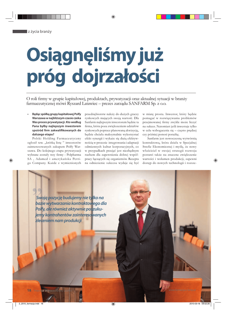 z życia branży Osiągnęliśmy już próg dojrzałości O roli firmy w grupie kapitałowej, produktach, prywatyzacji oraz aktualnej sytuacji w branży farmaceutycznej mówi Ryszard Latawiec – prezes zarządu SANFARM Sp. z o.o. • Będąc spółką grupy kapitałowej Polfy Warszawa w najbliższym czasie czeka Was proces prywatyzacji. Kto według Pana byłby najlepszym inwestorem spośród firm zakwalifikowanych do dalszego etapu? Polski Holding Far maceutyczny ogłosił tzw. „krótką listę ” inwestorów zainteresowanych zakupem Polfy Warszawa. Do kolejnego etapu prywatyzacji wybrane zostały trzy firmy : Polpharma SA , Adamed i amerykańska Perrigo Company. Każde z wymienionych przedsiębiorstw należy do dużych graczy rynkowych mających swoją wartość. Dla Sanfarm najlepszym inwestorem będzie ta firma, która poza zwiększeniem udziałów rynkowych poprzez planowaną akwizycję, będzie chciała maksymalnie wykorzystać efekt synergii i wykaże się dużą efektywnością w procesie integrowania i adaptacji odmiennych kultur korporacyjnych, co w przypadkach przejęć jest niezbędnym ruchem dla zapewnienia dobrej współpracy łączących się organizmów. Recepta na odniesienie sukcesu wydaje się być w miarę prosta. Inwestor, który będzie pomagać w rozwiązywaniu problemów przejmowanej firmy zwykle może liczyć na sukces. Natomiast jeśli inwestuje tylko w celu wzbogacenia się – często prędzej czy później ponosi porażkę. Sanfarm jest nowoczesną wytwórnią kontraktową, która działa w Specjalnej Strefie Ekonomicznej i myślę, że nowy właściciel w swojej strategii rozwoju postawi także na znaczne zwiększenie wartości i wolumen produkcji, zapewni dostęp do nowych technologii i rozsze- Swoją pozycję budujemy nie tylko na bazie wytwarzania kontraktowego dla Polfy, ale również aktywnie poszukujemy kontrahentów zainteresowanych zleceniem nam produkcji 18 Przemysł Farmaceutyczny 2/2010 2_2010_farmacja.indd 18 www.farmacja.e-bmp.pl 2010-03-18 09:52:26 z życia branży rzy linię produktów. Zwiększając skalę produkcji i sprzedaży, będzie można maksymalnie wykorzystać korzyści z tytułu zwolnień podatkowych, które posiada spółka. • Jaką rolę pełni Sanfarm w grupie kapitałowej? łości. Posiadamy bardzo nowoczesną infrastrukturę techniczną obejmująca system warunków wytwarzania (HVAC, pomieszczenia, media, woda oczyszczona, kontrola dostępu). Młoda załoga ze średnią wieku 36 lat jest dobrze wykształcona – ponad 50% pracowników ma wyższe wykształcenie i pomimo młodego Sanfar m jest spółką córką Polfy Warszawa, która znana jest z dobrze rozpoznawalnych preparatów leczniczych, zwłaszcza na rynku krajowym. W przedsiębiorstwie tym wytwarzane są wszystkie formy suche Polfy Warszawa i w związku z tym znaczenie spółki jest duże. Swoją pozycje budujemy nie tylko na bazie wytwarzania kontraktowego dla Polfy, ale również aktywnie poszukujemy kontrahentów zainteresowanych zleceniem nam produkcji, zarówno obejmującej pełen proces wytwarzania jak i poszczególne jego etapy, np. pakowanie i zwalnianie do obrotu. Wytwórnia została wybudowana z uwzględnieniem wszelkich wymogów wynikających z obowiązujących przepisów i coraz ostrzejszych kryteriów dla produkcji leków. Spółka posiada certyfikat GMP, potwierdzający zgodność warunków wytwarzania (całość produkcji) z zasadami Dobrej Praktyki Wytwarzania – (GMP). Od samego początku wszelkie działania były podporządkowane jednemu celowi: należało dostosować swoje działania do warunków rynkowych i zapewnić właścicielowi zysk. Już w drugim roku działalności firma stała się rentowna i od tamtej pory, pomimo zmieniających się warunków w kolejnych latach, ani razu nie odnotowała straty. Nawet duże spowolnienie gospodarcze, jakie dotknęło naszą gospodarkę w ubiegłym roku, nie zahamowało dobrej passy w rozwoju spółki. wieku posiada już duże doświadczenie zawodowe pozwalające na podejmowanie różnych trudnych projektów, zarówno tych związanych z wdrożeniem nowych preparatów jak i dotyczących zmian w technologii i usprawniania procesu produkcji. Wysoką jakość wytwórczą potwierdzają wyniki z przeprowadzanych audytów zewnętrznych oraz znikoma liczba reklamacji (w ostatnich 3 latach prowadziliśmy dwa postępowania wyjaśniające). • • Jesteście jedną z najmłodszych firm farmaceutycznych w Polsce. Czy w parze z młodością idzie doświadczenie, nowoczesność i wysoka jakość produktów? Rzeczywiście firma jest bardzo młoda, bo liczy dopiero 10 lat. Niemniej jednak posiadamy już ugruntowaną i sprawdzoną strukturę. Patrząc na aspekt wieku firmy z punktu widzenia cyklu życia i faz jej rozwoju można powiedzieć, że Sanfarm po okresie intensywnego inwestowania w fazie wzrostu osiągnął próg dojrza- www.farmacja.e-bmp.pl 2_2010_farmacja.indd 19 • Zajmujecie się również produkcją kontraktową. Dlaczego warto zlecić produkcję Waszej firmie? Jesteśmy wytwórnią i skupiamy się na zapewnieniu wysokiej produktywności pracy. Na rynku firm farmaceutycznych jest wiele podmiotów, które dysponują formami leków, lecz nie posiadają wystarczającego Wytwórnia została wybudowana z uwzględnieniem wszelkich wymogów wynikających z obowiązujących przepisów i coraz ostrzejszych kryteriów dla produkcji leków Jakie produkty są obecnie wytwarzane w Sanfarmie? Może to zabrzmi trochę przewrotnie, ale głównym produktem spółki jest produkcja kontraktowa na wytwarzanie i świadczenie usług zleconych przez kontrahentów. Jesteśmy wytwórnią kontraktową form suchych i dla Polfy Warszawa; rocznie wytwarzamy ok. 1 mld tabletek. Jeśli chodzi o linię wytwarzanych w naszej firmie preparatów leczniczych, to bez wątpienia najbardziej rozpoznawalnym naszym preparatem jest Acard 75 mg. potencjału do ich wytwarzania w skali produkcyjnej. Dla wielu firm lepsze jest wykorzystanie własnych 