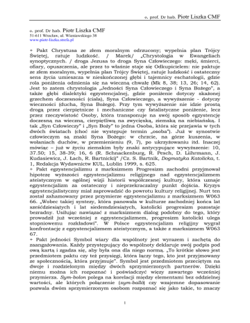 o. prof. Dr hab. Piotr Liszka CMF o. prof. Dr hab. Piotr Liszka CMF 51-611 Wrocław, ul. Wieniawskiego 38 www.piotr-liszka.strefa.pl + Pakt Chrystusa ze złem moralnym odrzucony; wypełnia plan Trójcy Świętej, ratuje ludzkość. / Marek/ „Chrystologia w Ewangeliach synoptycznych. / droga Jezusa to droga Syna Człowieczego: męki, śmierci, ofiary, opuszczenia, ale przez to właśnie staje się Odkupicielem: nie paktuje ze złem moralnym, wypełnia plan Trójcy Świętej, ratuje ludzkość i ostateczny sens życia umieszcza w nieskończonej głębi i tajemnicy eschatologii, gdzie rola poniżenia odmienia się na wieczną chwałę (Mk 8, 38; 13, 26; 14, 62). Jest to zatem chrystologia „Jedności Syna Człowieczego i Syna Bożego”, a także głębi dialektyki egzystencjalnej, gdzie poniżenie dotyczy skażonej grzechem doczesności (ciała), Syna Człowieczego, a wywyższenie - dotyczy wieczności (ducha, Syna Bożego). Przy tym wywyższenie nie idzie prostą drogą przez cierpiętnicze i mechaniczne czy fatalistyczne poniżenie, lecz przez rzeczywistość Osoby, która transponuje na swój sposób egzystencję doczesną na wieczną, cierpiętliwą na zwycięską, ziemską na niebiańską. I tak „Syn Człowieczy” i „Syn Boży” to jedna Osoba, która się przejawia w tych dwóch światach (choć nie występuje termin „osoba”). Już w synostwie człowieczym są znaki Syna Bożego: w chrzcie, na górze kuszenia, w wołaniach duchów, w przemienieniu (9, 7), po ukrzyżowaniu itd. Inaczej mówiąc – już w życiu ziemskim były znaki antycypujące wywyższenie: 10, 37.50; 15, 38-39; 16, 6 (R. Schnackenburg, R. Pesch, D. Liihrmann, J. Kudasiewicz, J. Łach, R. Bartnicki)” /Cz. S. Bartnik, Dogmatyka Katolicka, t. 1, Redakcja Wydawnictw KUL, Lublin 1999, s. 625. + Pakt egzystencjalizmu z marksizmem Progresizm zachodni przyjmował hipotezę wyższości egzystencjalizmu religijnego nad egzystencjalizmem ateistycznym w ogólnej wizji historii współczesnej kultury, która uznaje egzystencjalizm za ostateczny i nieprzekraczalny punkt dojścia. Kryzys egzystencjalistyczny miał zaprowadzić do powrotu kultury religijnej. Nurt ten został zahamowany przez przymierze egzystencjalizmu z marksizmem W063 66. „Wobec takiej syntezy, która panowała w kulturze zachodniej końca lat sześćdziesiątych i lat siedemdziesiątych, katolicki progresizm pozostaje bezradny. Usiłując nawiązać z marksizmem dialog podobny do tego, który prowadził już wcześniej z egzystencjalizmem, progresizm katolicki ulega stopniowemu rozkładowi”. W Polsce egzystencjalizm religijny wygrał konfrontację z egzystencjalizmem ateistycznym, a także z marksizmem W063 67. + Pakt jedności Symbol wiary dla wspólnoty jest wyrazem i zachętą do zaangażowania. Każdy przystępujący do wspólnoty deklaruje swój podpis pod ową kartą i zgadza się, aby była ona dla niego normą. „To krótkie słowo jest przedmiotem paktu czy też przysięgi, która łączy tego, kto jest przyjmowany ze społecznością, która przyjmuje”. Symbol jest przedmiotem przeciętym na dwoje i rozdzielonym między dwóch sprzymierzonych partnerów. Dzięki niemu można ich rozpoznać i poświadczyć więzy zawartego wcześniej przymierza. Sym-bolon polega na korelacji między elementami bez oddzielnej wartości, ale których połączenie (sym-ballô) czy wzajemne dopasowanie pozwala dwóm sprzymierzonym osobom rozpoznać się jako takie, to znaczy 1 o. prof. Dr hab. Piotr Liszka CMF jako powiązane ze sobą (sym-bollontes, kontrahenci). Ważna jest zasada symbolizowania: wzajemne powiązanie pomiędzy dwoma różniącymi się elementami, których połączenie jest znaczące; oraz skutek symbolizowania: wzajemny związek między dwoma podmiotami, które uznają się za zaangażowane jeden wobec drugiego C1.2 65. + Pakt księstw włoskich z mocarstwami. „Począwszy od roku 1494 i przez długie lata potem, półwysep włoski pokawałkowany był na małe księstwa, które bezustannie wojowały między sobą. Granice stale się zmieniały. Podczas tych wojen państewka włoskie wchodziły w alianse z ówczesnymi super-mocarstwami: Niderlandami, Anglią, Francją, Hiszpanią i Niemcami. Duża część Włoch, podobnie jak Niderlandy, Hiszpania i większość Niemiec, znajdowała się pod rządami Świętego Cesarza Rzymskiego i dynastii Habsburgów w Wiedniu, jednak, jak to określa James McGregor, Włochy w XVI wieku „niczym [dzisiejszy] Liban były polem, na którym super-mocarstwa staczały swoje bitwy” /L. Guicciardini, The Sack of Rome, wyd. i tłum. J. H. McGregor, New York:Italica Press 1993, s. xiii, xvi-xvii/. W roku 1527, kiedy Karol V był Świętym Cesarzem Rzymskim, Francja i Anglia, aby powstrzymać wzrost potęgi Karola a także by zwiększyć własne bezpieczeństwo, związały się sojuszem militarnym z papiestwem. To co nastąpiło potem Henryk VIII nazwał „sprawą kryminalną” przeciwko chrześcijaństwu, ponieważ to przez zepsucie moralne jego członków, w szczególności kleru, Rzym miał być plądrowany przez osiem miesięcy i w dużej części zniszczony /H. Belloc, How the Reformation Happened, Rockford, III-: Tan Books and Publishers Inc., 1975, s. 83, przyp. 6/. Pustoszenie Rzymu pomaga zrozumieć dlaczego tak powoli papiestwo reagowało na reformację protestancką. Wydarzenie to poważnie nadszarpnęło siły papiestwa, które następnie zostały jeszcze bardziej osłabione za sprawą buntu króla angielskiego Henryka VIII przeciwko autorytetowi Kościoła” P. A. Redpath, Odyseja mądrości. Od filozofii do transcendentalnej sofistyki, (Wisdom's Odyssey. From Philosophy to Transcendental Sophistry, Copyright by Editions Rodopi B. V., Amsterdam-Atlanta, 1997), Lublin 2003, s. 225. + Pakt ludzi z Bogiem Reguła monastyczna była fundamentem „Paktu” między ludźmi a Bogiem. Był to akt świadomego odnowienia Przymierza Nowego Testamentu. Św. Izydor z Sewilii zdefiniował profesję m