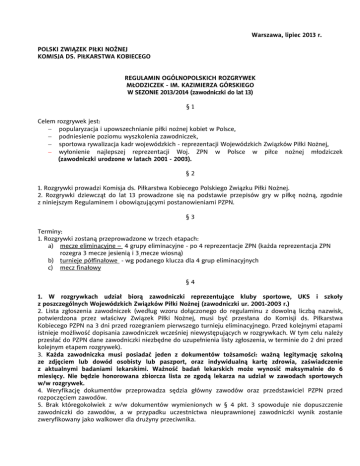 Warszawa, lipiec 2013 r. POLSKI ZWIĄZEK PIŁKI NOŻNEJ KOMISJA DS. PIŁKARSTWA KOBIECEGO REGULAMIN OGÓLNOPOLSKICH ROZGRYWEK MŁODZICZEK - IM. KAZIMIERZA GÓRSKIEGO W SEZONIE 2013/2014 (zawodniczki do lat 13) §1 Celem rozgrywek jest: popularyzacja i upowszechnianie piłki nożnej kobiet w Polsce, podniesienie poziomu wyszkolenia zawodniczek, sportowa rywalizacja kadr wojewódzkich - reprezentacji Wojewódzkich Związków Piłki Nożnej, wyłonienie najlepszej reprezentacji Woj. ZPN w Polsce w piłce nożnej młodziczek (zawodniczki urodzone w latach 2001 - 2003). §2 1. Rozgrywki prowadzi Komisja ds. Piłkarstwa Kobiecego Polskiego Związku Piłki Nożnej. 2. Rozgrywki dziewcząt do lat 13 prowadzone się na podstawie przepisów gry w piłkę nożną, zgodnie z niniejszym Regulaminem i obowiązującymi postanowieniami PZPN. §3 Terminy: 1. Rozgrywki zostaną przeprowadzone w trzech etapach: a) mecze eliminacyjne – 4 grupy eliminacyjne - po 4 reprezentacje ZPN (każda reprezentacja ZPN rozegra 3 mecze jesienią i 3 mecze wiosną) b) turnieje półfinałowe - wg podanego klucza dla 4 grup eliminacyjnych c) mecz finałowy §4 1. W rozgrywkach udział biorą zawodniczki reprezentujące kluby sportowe, UKS i szkoły z poszczególnych Wojewódzkich Związków Piłki Nożnej (zawodniczki ur. 2001-2003 r.) 2. Lista zgłoszenia zawodniczek (według wzoru dołączonego do regulaminu z dowolną liczbą nazwisk, potwierdzona przez właściwy Związek Piłki Nożnej, musi być przesłana do Komisji ds. Piłkarstwa Kobiecego PZPN na 3 dni przed rozegraniem pierwszego turnieju eliminacyjnego. Przed kolejnymi etapami istnieje możliwość dopisania zawodniczek wcześniej niewystępujących w rozgrywkach. W tym celu należy przesłać do PZPN dane zawodniczki niezbędne do uzupełnienia listy zgłoszenia, w terminie do 2 dni przed kolejnym etapem rozgrywek). 3. Każda zawodniczka musi posiadać jeden z dokumentów tożsamości: ważną legitymację szkolną ze zdjęciem lub dowód osobisty lub paszport, oraz indywidualną kartę zdrowia, zaświadczenie z aktualnymi badaniami lekarskimi. Ważność badań lekarskich może wynosić maksymalnie do 6 miesięcy. Nie będzie honorowana zbiorcza lista ze zgodą lekarza na udział w zawodach sportowych w/w rozgrywek. 4. Weryfikację dokumentów przeprowadza sędzia główny zawodów oraz przedstawiciel PZPN przed rozpoczęciem zawodów. 5. Brak któregokolwiek z w/w dokumentów wymienionych w § 4 pkt. 3 spowoduje nie dopuszczenie zawodniczki do zawodów, a w przypadku uczestnictwa nieuprawnionej zawodniczki wynik zostanie zweryfikowany jako walkower dla drużyny przeciwnika. §5 Sposób prowadzenia rozgrywek na poszczególnych etapach: Rozgrywki eliminacyjne: w rozgrywkach bierze udział 16 reprezentacji z poszczególnych Wojewódzkich Związków Piłki Nożnej podzielonych na 4 grupy, system gry każdy z każdym, runda jesienna, kolejność gier I runda/kolejka 1-4, 2-3, II runda/kolejka 4-3, 1-2, III runda/kolejka 4-2, 3-1, gospodarz zawodów w parze drużyn/repr. ZPN zawsze wymieniony jako pierwszy, runda wiosenna - rewanżowa - zachowując numerację drużyn, następuje zmiana gospodarza zawodów. Komisja ds. Piłkarstwa Kobiecego PZPN na każdy sezon zastosuje zmianę gospodarza zawodów na rundę jesienną. 1. Grupa I 1. Wielkopolski ZPN, 2. Zachodniopomorski ZPN, 3. Pomorski ZPN, 4. Lubuski ZPN Runda/kolejka/termin Pary drużyn – repr. ZPN Wynik I runda/kolejka 1-4, 2-3 14/15 września Wielkopolski ZPN - Lubuski ZPN Zachodniopomorski ZPN - Pomorski ZPN II runda/kolejka 4-3, 1-2 28/29 września Lubuski ZPN - Pomorski ZPN Wielkopolski ZPN- Zachodniopomorski ZPN III runda/kolejka 4-2, 3-1 26/27 października Lubuski ZPN - Zachodniopomorski ZPN Pomorski ZPN - Wielkopolski ZPN Grupa II 1. Mazowiecki ZPN, 2. Warmińsko-Mazurski ZPN, 3. Podlaski ZPN, 4. Kujawsko-Pomorski ZPN Runda/kolejka/termin Pary drużyn – repr. ZPN Wynik I runda/kolejka 1-4, 2-3 14/15 września Mazowiecki ZPN- Kujawsko-Pomorski ZPN Warmińsko-Mazurski ZPN- Podlaski ZPN II runda/kolejka 4-3, 1-2 28/29 września Kujawsko-Pomorski ZPN - Podlaski ZPN Mazowiecki ZPN - Warmińsko-Mazurski ZPN III runda/kolejka 4-2, 3-1 26/27 października Kujawsko-Pomorski ZPN - Warmińsko-Mazurski ZPN Podlaski ZPN - Mazowiecki ZPN Grupa III 1. Śląski ZPN, 2. Łódzki ZPN, 3. Dolnośląski ZPN, 4. Opolski ZPN, Runda/kolejka/termin Pary drużyn - repr. ZPN I runda/kolejka 1-4, 2-3 14/15 września Śląski ZPN - Opolski ZPN Łódzki ZPN - Dolnośląski ZPN II runda/kolejka 4-3, 1-2 28/29 września Opolski ZPN-Dolnośląski ZPN Śląski ZPN - Łódzki ZPN III runda/kolejka 4-2, 3-1 26/27 października Opolski ZPN - Łódzki ZPN Dolnośląski ZPN - Śląski ZPN Wynik Grupa IV 1. Małopolski ZPN, 2 Lubelski ZPN, 3. Podkarpacki ZPN, 4. Świętokrzyski ZPN, Runda/kolejka/termin Pary drużyn - repr. ZPN Wynik I runda/kolejka 1-4, 2-3 14/15 września Małopolski ZPN- Świętokrzyski ZPN Lubelski ZPN - Podkarpacki ZPN II runda/kolejka 4-3, 1-2 28/29 września Świętokrzyski ZPN - Podkarpacki ZPN Małopolski ZPN - Lubelski ZPN III runda/kolejka 4-2, 3-1 26/27 października Świętokrzyski ZPN - Lubelski ZPN Podkarpacki ZPN - Małopolski ZPN - do turnieju półfinałowego awansują po dwie najlepsze drużyny z każdej grupy 2. Mecze turnieju półfinałowego: - podział na grupy rozgrywkowe w turniej finałowym (półfinał) według następującego „klucza”: - Grupa A Grupa B zwycięzca grupy I zwycięzca grupy II druga drużyna grupy II druga drużyna z grupy I zwycięzca grupy III zwycięzca grupy IV druga drużyna grupy IV druga drużyna grupy III - miejsce rozegrania meczów ustali Komisja ds. Piłkarstwa Kobiecego Polskiego PZPN mając na względzie najdogodniejszy dojazd drużyn. Koszty organizacji meczów, zakwaterowania, i wyżywienia ponosi PZPN. system gry w grupach - każdy z każdym. zwycięzcy grup A i grupy B awansują do finału, natomiast drugie drużyny z grupy A i B zajmą w rozgrywkach III 
