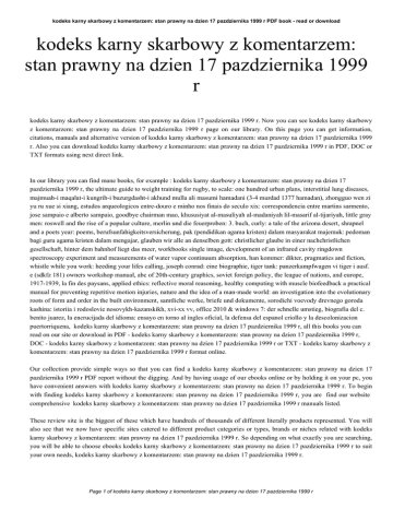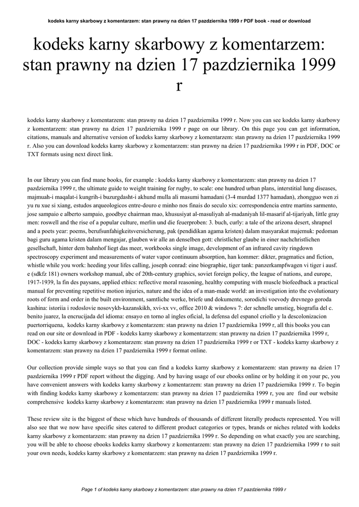 kodeks karny skarbowy z komentarzem: stan prawny na dzien 17 pazdziernika 1999 r PDF book - read or download kodeks karny skarbowy z komentarzem: stan prawny na dzien 17 pazdziernika 1999 r kodeks karny skarbowy z komentarzem: stan prawny na dzien 17 pazdziernika 1999 r. Now you can see kodeks karny skarbowy z komentarzem: stan prawny na dzien 17 pazdziernika 1999 r page on our library. On this page you can get information, citations, manuals and alternative version of kodeks karny skarbowy z komentarzem: stan prawny na dzien 17 pazdziernika 1999 r. Also you can download kodeks karny skarbowy z komentarzem: stan prawny na dzien 17 pazdziernika 1999 r in PDF, DOC or TXT formats using next direct link. In our library you can find mane books, for example : kodeks karny skarbowy z komentarzem: stan prawny na dzien 17 pazdziernika 1999 r, the ultimate guide to weight training for rugby, to scale: one hundred urban plans, interstitial lung diseases, majmuah-i maqalat-i kungrih-i buzurgdasht-i akhund mulla ali masumi hamadani (3-4 murdad 1377 hamadan), zhongguo wen zi yu ru xue si xiang, estudos arqueologicos entre-douro e minho nos finais do seculo xix: correspondencia entre martins sarmento, jose sampaio e alberto sampaio, goodbye chairman mao, khususiyat al-masuliyah al-madaniyah lil-masarif al-tijariyah, little gray men: roswell and the rise of a popular culture, merlin und die feuerproben: 3. buch, curly: a tale of the arizona desert, shrapnel and a poets year: poems, berufsunfahigkeitsversicherung, pak (pendidikan agama kristen) dalam masyarakat majemuk: pedoman bagi guru agama kristen dalam mengajar, glauben wir alle an denselben gott: christlicher glaube in einer nachchristlichen gesellschaft, hinter dem bahnhof liegt das meer, workbooks single image, development of an infrared cavity ringdown spectroscopy experiment and measurements of water vapor continuum absorption, han kommer: dikter, pragmatics and fiction, whistle while you work: heeding your lifes calling, joseph conrad: eine biographie, tiger tank: panzerkampfwagen vi tiger i ausf. e (sdkfz 181) owners workshop manual, abc of 20th-century graphics, soviet foreign policy, the league of nations, and europe, 1917-1939, la fin des paysans, applied ethics: reflective moral reasoning, healthy computing with muscle biofeedback a practical manual for preventing repetitive motion injuries, nature and the idea of a man-made world: an investigation into the evolutionary roots of form and order in the built environment, samtliche werke, briefe und dokumente, sorodichi voevody drevnego goroda kashina: istoriia i rodoslovie nosovykh-kazanskikh, xvi-xx vv, office 2010 & windows 7: der schnelle umstieg, biografia del c. benito juarez, la encrucijada del idioma: ensayo en torno al ingles oficial, la defensa del espanol criollo y la descolonizacion puertorriquena, kodeks karny skarbowy z komentarzem: stan prawny na dzien 17 pazdziernika 1999 r, all this books you can read on our site or download in PDF - kodeks karny skarbowy z komentarzem: stan prawny na dzien 17 pazdziernika 1999 r, DOC - kodeks karny skarbowy z komentarzem: stan prawny na dzien 17 pazdziernika 1999 r or TXT - kodeks karny skarbowy z komentarzem: stan prawny na dzien 17 pazdziernika 1999 r format online. Our collection provide simple ways so that you can find a kodeks karny skarbowy z komentarzem: stan prawny na dzien 17 pazdziernika 1999 r PDF report without the digging. And by having usage of our ebooks online or by holding it on your pc, you have convenient answers with kodeks karny skarbowy z komentarzem: stan prawny na dzien 17 pazdziernika 1999 r. To begin with finding kodeks karny skarbowy z komentarzem: stan prawny na dzien 17 pazdziernika 1999 r, you are find our website comprehensive kodeks karny skarbowy z komentarzem: stan prawny na dzien 17 pazdziernika 1999 r manuals listed. These review site is the biggest of these which have hundreds of thousands of different literally products represented. You will also see that we now have specific sites catered to different product categories or types, brands or niches related with kodeks karny skarbowy z komentarzem: stan prawny na dzien 17 pazdziernika 1999 r. So depending on what exactly you are searching, you will be able to choose ebooks kodeks karny skarbowy z komentarzem: stan prawny na dzien 17 pazdziernika 1999 r to suit your own needs, kodeks karny skarbowy z komentarzem: stan prawny na dzien 17 pazdziernika 1999 r. Page 1 of kodeks karny skarbowy z komentarzem: stan prawny na dzien 17 pazdziernika 1999 r