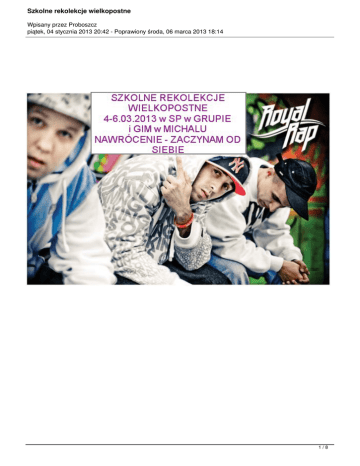 Szkolne rekolekcje wielkopostne Wpisany przez Proboszcz piątek, 04 stycznia 2013 20:42 - Poprawiony środa, 06 marca 2013 18:14 1/8 Szkolne rekolekcje wielkopostne Wpisany przez Proboszcz piątek, 04 stycznia 2013 20:42 - Poprawiony środa, 06 marca 2013 18:14 PROGRAM SZKOLNYCH REKOLEKCJI WIELKOPOSTNYCH „NAWRÓCENIE – ZACZYNAM OD SIEBIE” 2/8 Szkolne rekolekcje wielkopostne Wpisany przez Proboszcz piątek, 04 stycznia 2013 20:42 - Poprawiony środa, 06 marca 2013 18:14 SZKOLNE REKOLEKCJE WIELKOPOSTNE 4 marca poniedziałek 5 marca wtorek 6 marca środa SP w Grupie godz. 9:00 – 10:00 kl. IV – VI sala gimnastyczna godz. 9:00 – 10:00 kl. IV – VI sala gimnastyczna godz. 9:00 – 10:00 Przedszkole G. Grupa, 3/8 Szkolne rekolekcje wielkopostne Wpisany przez Proboszcz piątek, 04 stycznia 2013 20:42 - Poprawiony środa, 06 marca 2013 18:14 Oddziały Przedszkolne kl. I – II Bratwin kl. I-III SP Grupa sala gimnastyczna godz. 10: 15 – 11:15 kl. IV – VI SP Grupa sala gimnastyczna Gimnazjum w Michalu godz. 11:30 – 12:30 kl. I – III sala gimnastyczna 4/8 Szkolne rekolekcje wielkopostne Wpisany przez Proboszcz piątek, 04 stycznia 2013 20:42 - Poprawiony środa, 06 marca 2013 18:14 godz. 11:30 – 12:30 kl. I – III sala gimnastyczna godz. 12:15 – 13:15 kl. I – III sala gimnastyczna 5/8 Szkolne rekolekcje wielkopostne Wpisany przez Proboszcz piątek, 04 stycznia 2013 20:42 - Poprawiony środa, 06 marca 2013 18:14 Poprowadzi je Raper ze składów Royal Rap, Trzecia Godzina Dnia, Kawa - Kolah MIREK KOLAH KOLCZYK. 6/8 Szkolne rekolekcje wielkopostne Wpisany przez Proboszcz piątek, 04 stycznia 2013 20:42 - Poprawiony środa, 06 marca 2013 18:14 Obejrzyj kilka wykonów Kolaha i sam/a się przekonaj czy warto wziąć udział w tych swoistych REKOLEKCJACH reGeneration feat Kolah - "Conqeror" (kliknij ten link by posłuchać i obejrzeć klip) Kolah feat Poison - "Chory świat" (kliknij ten link by posłuchać i obejrzeć klip) ELOHIM feat. Kolah - "Słowo Twe" (kliknij ten link by posłuchać i obejrzeć klip) 7/8 Szkolne rekolekcje wielkopostne Wpisany przez Proboszcz piątek, 04 stycznia 2013 20:42 - Poprawiony środa, 06 marca 2013 18:14 Kolah feat Yuro - "Nie Chcę Być Sam" [RMX] (kliknij ten link by posłuchać utworu) 8/8