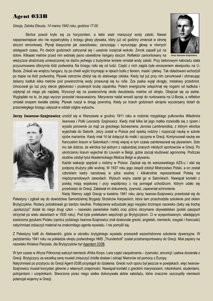 Agent 033B Grecja, Zatoka Eleusis, 14 marca 1942 roku, godzina 17:00. Słońce powoli kryło się za horyzontem, a lekki wiatr marszczył wody zatoki. Nawet najwprawniejsze oko nie wypatrzyłoby z brzegu głowy pływaka, który już od godziny zmierzał w stronę stoczni remontowej. Płynął klasycznie jak zawodowiec, zanurzając i wynurzając głowę w równych odstępach czasu. Po dwóch godzinach zatrzymał się i uważnie rozejrzał wokoło. Zmrok zapadł już na dobre. Kilkaset metrów przed nim widniały jasno oświetlone hangary stoczni. Reflektor zamontowany na Jerzy Iwanow-Szajnowicz wieżyczce strażniczej umieszczonej na dachu jednego z budynków leniwie omiatał wody zatoki. Przy betonowym nabrzeżu stała przycumowana olbrzymia łódź podwodna. Na brzegu roiło się od ludzi. Część z nich zajęta była wnoszeniem ekwipunku na UBoota. Znikali we wnętrzu hangaru, by po chwili wyjść trzymając w rękach butle z tlenem, maski i płetwy. Tak obładowani wchodzili po trapie na łódź podwodną. Pływak ostrożnie zbliżył się do stalowego cielska. Kiedy był już przy nim zanurkował i obmacując żelazny kadłub kilka metrów pod powierzchnią wody przesunął się ku rufie. Zza paska wyjął okrągły, metalowy przedmiot. Umocował go tuż przy sterze głębokości i przekręcił śrubę zapalnika. Potem energicznie odepchnął się nogami od kadłuba i odpłynął od niego jak najdalej. Wynurzył się na powierzchnię około dwudziestu metrów od okrętu. Obejrzał się za siebie. Wyglądało na to, że jego wyczyn pozostał niezauważony. Marynarze nadal wnosili sprzęt do nurkowania na U-Boota, a reflektor omiatał snopem światła zatokę. Pływak ruszył w drogę powrotną. Kiedy po trzech godzinach skrajnie wyczerpany dotarł do przeciwległego brzegu usłyszał w oddali odgłos wybuchu. Jerzy Iwanow-Szajnowicz urodził się w Warszawie w grudniu 1911 roku w rodzinie rosyjskiego pułkownika Władimira Iwanowa i Polki Leonardy Szajnowicz. Kiedy miał kilka lat jego matka rozwiodła się z ojcem i wyszła ponownie za mąż za greckiego biznesmena Jannisa Lambrianidisa, z którym wkrótce wyjechała do Salonik. Jerzy został w Polsce pod opieką rodziny i rozpoczął naukę w szkole ojców marianów. Kiedy miał 14 lat dołączył do matki i ojczyma w Grecji. Kontynuował naukę we francuskim liceum w Salonikach i mniej więcej w tym czasie zainteresował się pływaniem. Szło mu tak dobrze, że wkrótce był jednym z najbardziej znanych młodych sportowców w Grecji. Po ukończeniu liceum wyjechał do Louvain w Belgii, gdzie zaczął studiować agronomię. Podczas studiów zdobył tytuł Akademickiego Mistrza Belgii w pływaniu. Każde wakacje spędzał u rodziny w Polsce. Zapisał się do warszawskiego AZS-u i stał się podporą drużyny piłki wodnej. W 1937 roku jego zespół zdobył Mistrzostwo Polski, a on został członkiem kadry narodowej w piłce wodnej i kilkakrotnie reprezentował Polskę na międzynarodowych zawodach. Wybuch wojny zastał go w Salonikach. Nawiązał kontakt z polską misją wojskową i przy współpracy z nią pomagał uchodźcom, którym udało się przedostać do Grecji. Załatwiał im dokumenty, żywność, zapewniał schronienie. Kiedy Niemcy zajęli Grecję w kwietniu 1941 roku Jerzy Iwanow-Szajnowicz przedostał się do Palestyny i zgłosił się do dowództwa Samodzielnej Brygady Strzelców Karpackich, która tam przechodziła szkolenie pod okiem Brytyjczyków. Rodacy potraktowali go bardzo nieufnie. Podejrzenia wzbudzało jego rosyjsko brzmiące nazwisko (żeby się trochę „spolszczyć” dodał do niego drugi człon – nazwisko panieńskie matki) oraz późno otrzymane obywatelstwo (polski paszport otrzymał po wielu staraniach w 1935 roku). Pod byle pretekstem wepchnęli go Brytyjczykom. Ci w wysportowanym, władającym sześcioma językami Polaku (oprócz polskiego Iwanow-Szajnowicz znał doskonale grecki, angielski, niemiecki, rosyjski i francuski) natychmiast zobaczyli materiał na znakomitego agenta wywiadu. I nie pomylili się. Z Palestyny trafił do Aleksandrii, gdzie w ośrodku brytyjskiego wywiadu przeszedł wszechstronne szkolenie dywersyjne. W październiku 1941 roku na pokładzie okrętu podwodnego HMS „Thunderbolt” został przetransportowany do Grecji. Miał papiery na nazwisko Kiriakos Paryssis, dla Brytyjczyków był Agentem 033B. W tym czasie w Afryce Północnej walczył niemiecki Afrika Korps. Lwia część zaopatrzenia – żywności, amunicji i paliwa docierała z Grecji. Brytyjczycy za wszelką cenę musieli zniszczyć źródła dostaw i odciąć Niemców od pomocy z Europy. Natychmiast po przybyciu do Grecji Agent 033B przystąpił do działania. Grecki ruch oporu był jeszcze w powijakach, więc IwanowSzajnowicz musiał korzystać głównie z własnych znajomości. Nawiązał kontakt z greckimi marynarzami, robotnikami, studentami, policjantami i urzędnikami. Stworzona przez niego siatka dokonywała aktów sabotażu, które znacznie uszczupliły niemiecki potencjał wojenny w Grecji. Jego ludzie pracujący w zakładach lotniczych Malziniotti w Nowym Faleronie umieszczali w samolotowych zbiornikach paliwa niewielkie pastylki będące mieszanką różnych tłuszczów i olejów, które powodowały dekompozycję paliwa. Samolot startował i po przeleceniu kilku kilometrów gwałtownie pikował, rozbijając się na ziemi, bądź wpadając do morza. Niemcy stracili wskutek tego sabotażu około 400 maszyn. Kolejarze zwerbowani przez Polaka niszczyli lokomotywy ciągnące składy z bronią i amunicją. Wrzucali do ich kotłów niewielkie pakunki dostarczone przez agenta zwane „mydełkami”. Powodowały one gwałtowne wydzielanie pary i eksplozję kotła. Za pomocą przywiezionej z Aleksandrii radiostacji polski agent informował Brytyjczyków o rozmieszczeniu jednostek niemieckich i włoskich, składów paliwowych i magazynów z amunicją. Po otrzymaniu tych informacji brytyjskie bombowce równały