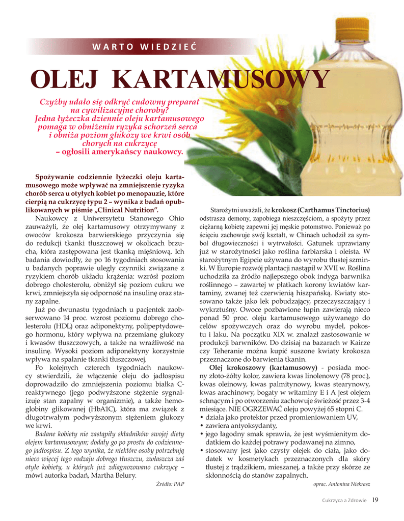 WARTO WIEDZIEĆ OLEJ KARTAMUSOWY Czyżby udało się odkryć cudowny preparat na cywilizacyjne choroby? Jedna łyżeczka dziennie oleju kartamusowego pomaga w obniżeniu ryzyka schorzeń serca i obniża poziom glukozy we krwi osób chorych na cukrzycę – ogłosili amerykańscy naukowcy. Spożywanie codziennie łyżeczki oleju kartamusowego może wpływać na zmniejszenie ryzyka chorób serca u otyłych kobiet po menopauzie, które cierpią na cukrzycę typu 2 – wynika z badań opublikowanych w piśmie „Clinical Nutrition”. Naukowcy z Uniwersytetu Stanowego Ohio zauważyli, że olej kartamusowy otrzymywany z owoców krokosza barwierskiego przyczynia się do redukcji tkanki tłuszczowej w okolicach brzucha, która zastępowana jest tkanką mięśniową. Ich badania dowiodły, że po 16 tygodniach stosowania u badanych poprawie uległy czynniki związane z ryzykiem chorób układu krążenia: wzrósł poziom dobrego cholesterolu, obniżył się poziom cukru we krwi, zmniejszyła się odporność na insulinę oraz stany zapalne. Już po dwunastu tygodniach u pacjentek zaobserwowano 14 proc. wzrost poziomu dobrego cholesterolu (HDL) oraz adiponektyny, polipeptydowego hormonu, który wpływa na przemianę glukozy i kwasów tłuszczowych, a także na wrażliwość na insulinę. Wysoki poziom adiponektyny korzystnie wpływa na spalanie tkanki tłuszczowej. Po kolejnych czterech tygodniach naukowcy stwierdzili, że włączenie oleju do jadłospisu doprowadziło do zmniejszenia poziomu białka Creaktywnego (jego podwyższone stężenie sygnalizuje stan zapalny w organizmie), a także hemoglobiny glikowanej (HbA1C), która ma związek z długotrwałym podwyższonym stężeniem glukozy we krwi. Badane kobiety nie zastąpiły składników swojej diety olejem kartamusowym; dodały go po prostu do codziennego jadłospisu. Z tego wynika, że niektóre osoby potrzebują nieco więcej tego rodzaju dobrego tłuszczu, zwłaszcza zaś otyłe kobiety, u których już zdiagnozowano cukrzycę – mówi autorka badań, Martha Belury. Starożytni uważali, że krokosz (Carthamus Tinctorius) odstrasza demony, zapobiega nieszczęściom, a spożyty przez ciężarną kobietę zapewni jej męskie potomstwo. Ponieważ po ścięciu zachowuje swój kształt, w Chinach uchodził za symbol długowieczności i wytrwałości. Gatunek uprawiany już w starożytności jako roślina farbiarska i oleista. W starożytnym Egipcie używana do wyrobu tłustej szminki. W Europie rozwój plantacji nastąpił w XVII w. Roślina uchodziła za źródło najlepszego obok indyga barwnika roślinnego – zawartej w płatkach korony kwiatów kartaminy, zwanej też czerwienią hiszpańską. Kwiaty stosowano także jako lek pobudzający, przeczyszczający i wykrztuśny. Owoce pozbawione łupin zawierają nieco ponad 50 proc. oleju kartamusowego używanego do celów spożywczych oraz do wyrobu mydeł, pokostu i laku. Na początku XIX w. znalazł zastosowanie w produkcji barwników. Do dzisiaj na bazarach w Kairze czy Teheranie można kupić suszone kwiaty krokosza przeznaczone do barwienia tkanin. Olej krokoszowy (kartamusowy) - posiada mocny złoto-żółty kolor, zawiera kwas linolenowy (78 proc.), kwas oleinowy, kwas palmitynowy, kwas stearynowy, kwas arachinowy, bogaty w witaminy E i A jest olejem schnącym i po otworzeniu zachowuje świeżość przez 3-4 miesiące. NIE OGRZEWAĆ oleju powyżej 65 stopni C. •działa jako protektor przed promieniowaniem UV, •zawiera antyoksydanty, •jego łagodny smak sprawia, że jest wyśmienitym dodatkiem do każdej potrawy podawanej na zimno, •stosowany jest jako czysty olejek do ciała, jako dodatek w kosmetykach przeznaczonych dla skóry tłustej z trądzikiem, mieszanej, a także przy skórze ze skłonnością do stanów zapalnych. Żródło: PAP oprac. Antonina Niekrasz Cukrzyca a Zdrowie 19