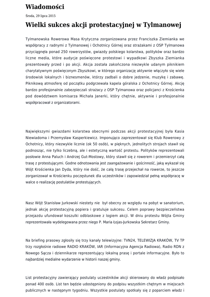 Wiadomości Środa, 29 lipca 2015 Wielki sukces akcji protestacyjnej w Tylmanowej Tylmanowska Rowerowa Masa Krytyczna zorganizowana przez Franciszka Ziemianka we współpracy z radnymi z Tylmanowej i Ochotnicy Górnej oraz strażakami z OSP Tylmanowa przyciągnęła ponad 250 rowerzystów, gwiazdy polskiego kolarstwa, polityków oraz bardzo liczne media, które audycje poświęcone protestowi i wypadkowi Zbyszka Ziemianka prezentowały przed i po akcji. Akcja została zakończona niezwykle udanym piknikiem charytatywnym poświęconym Zbyszkowi, w którego organizację aktywnie włączyło się wiele środowisk lokalnych i biznesmenów, którzy zadbali o dobre jedzenie, muzykę i zabawę. Piknikową atmosferę od początku podgrzewała kapela góralska z Ochotnicy Górnej. Akcję bardzo profesjonalnie zabezpieczali strażacy z OSP Tylmanowa oraz policjanci z Krościenka pod dowództwem komisarza Michała Janerki, który chętnie, aktywnie i profesjonalnie współpracował z organizatorami. Największymi gwiazdami kolarstwa obecnymi podczas akcji protestacyjnej była Kasia Niewiadoma i Przemysław Kasperkiewicz. Imponująco zaprezentował się Klub Rowerowy z Ochotnicy, który niezwykle licznie (ok 50 osób), w pięknych, jednolitych strojach stawił się podnosząc, nie tylko liczebną, ale i estetyczną wartość protestu. Polityków reprezentowali posłowie Anna Paluch i Andrzej Gut-Mostowy, który stawił się z rowerem i przemierzył całą trasę z protestującymi. Godne odnotowania jest zaangażowanie i gościnność, jaką wykazał się Wójt Krościenka Jan Dyda, który nie dość, że całą trasę przejechał na rowerze, to jeszcze zorganizował w Krościenku poczęstunek dla uczestników i zapowiedział pełną współpracę w walce o realizację postulatów protestujących. Nasz Wójt Stanisław Jurkowski niestety nie był obecny ze względu na pobyt w sanatorium, jednak akcję protestacyjną popiera i gratuluje sukcesu. Celem poprawy bezpieczeństwa przejazdu ufundował koszulki odblaskowe z logiem akcji. W dniu protestu Wójta Gminy reprezentowała wydelegowana przez niego P. Maria Łojas-Jurkowska Sekretarz Gminy. Na briefing prasowy zgłosiły się trzy kanały telewizyjne: TVN24, TELEWIZJA KRAKÓW, TV TP trzy rozgłośnie radiowe RADIO KRAKÓW, IAR (Informacyjna Agencja Radiowa), Radio RDN z Nowego Sącza i dziennikarze reprezentujący lokalną prasę i portale informacyjne. Było to najbardziej medialne wydarzenie w historii naszej gminy. List protestacyjny zawierający postulaty uczestników akcji skierowany do władz podpisało ponad 400 osób. List ten będzie udostępniony do podpisu wszystkim chętnym w miejscach publicznych w następnym tygodniu. Wszystkie postulaty spotkały się z poparciem władz i polityków. Ta akcja protestacyjna zapoczątkowała stanowcze działania na rzecz przyspieszenia budowy ścieżek rowerowych w ramach projektu "VeloDunajec" oraz budowy ścieżki edukacyjnej pieszo-rowerowej przez Rezerwat Przyrody Kłodne. Gratulujemy organizatorom, OSP Tylmanowa i wszystkim uczestnikom Tylmanowskiej Rowerowej Masy Krytycznej bardzo udanej i profesjonalnie przeprowadzonej akcji. Życzymy powodzenia w dalszych działaniach zmierzających do realizacji postulatu. Link do filmu z Kroniki Krakowskiej: http://krakow.tvp.pl/20984650/rowerowy-protest-w-kroscienku-nad-dunajcem GALERIA ZDJĘĆ