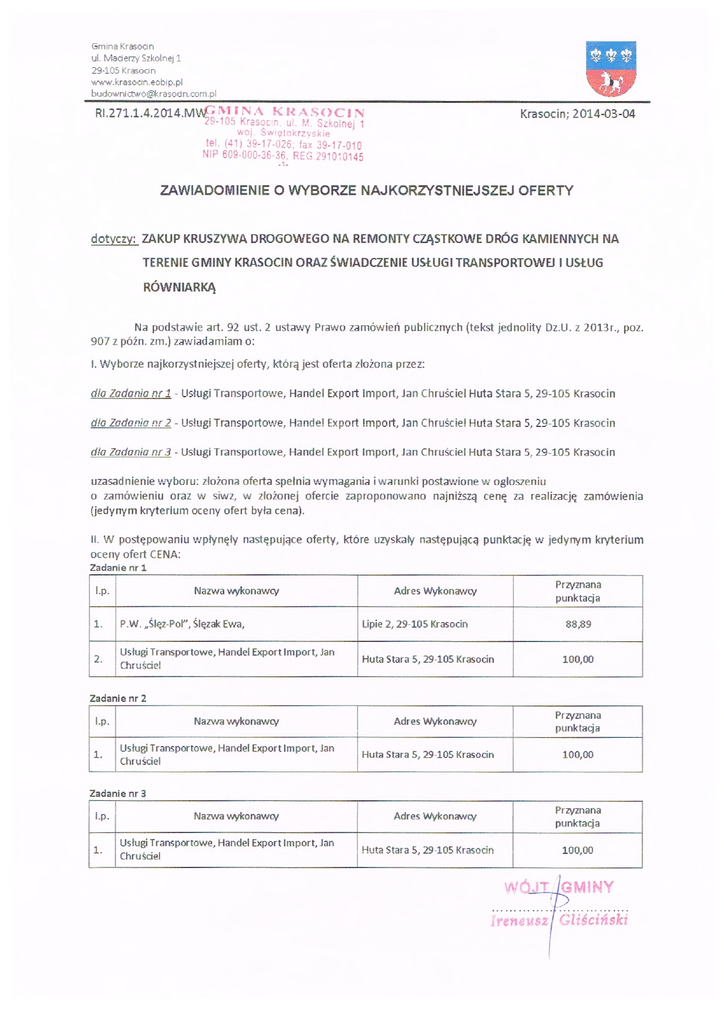 Gmina Krasoan ul. Macierzy Szkolnej 1 29-105 Krasocin www.krasocin.eobip.pl budowni [email protected] pl Rl.271.1.4.2014.M\AP H A K R A :()c Krasocin; 2014-03-04 IN 29-105 Krasocin, ul. M. Szkolnej 1 woi. Sw ę tokrzyske te ł . (41) 39-17-026: fax 39-17-010 NIP 609-000-35-36, REG291010145 ZAWIADOMIENIE O WYBORZE NAJKORZYSTNIEJSZEJ OFERTY dotyczy: ZAKUP KRUSZYWA DROGOWEGO NA REMONTY CZĄSTKOWE DRÓG KAMIENNYCH NA TERENIE GMINY KRASOCIN ORAZ ŚWIADCZENIE USŁUGI TRANSPORTOWEJ I USŁUG RÓWNIARKĄ Na podstawie art. 92 ust. 2 ustawy Prawo zamówie ń publicznych (tekst jednolity Dz.U. z 2013r., poz. 907 z póź n. zm .) zawiadamiam 0: I. Wyborze najkorzystniejszej oferty, któr ą jest oferta zło żona przez: dla Zadania nr 1 - Usł ugi Transportowe, Handel Export Import, Jan Chru ściel Huta Stara 5, 29-105 Krasocin dla Zadania nr 2 - Usł ugi Transportowe, Handel Export Import, Jan Chru ście! Huta Stara 5, 29-105 Krasocin dla Zadania nr3 - Usł ugi Transportowe, Handel Export Import, Jan Chru ściel Huta Stara 5, 29-105 Krasocin uzasadnienie wyboru: 71oona oferta spe ł nia wymagania iwarunki postawione w 0g107eniu o zamówieniu oraz w siwz, w z ło żonej ofercie zaproponowano najni ższą cenę za realizacj ę zamówienia (jedynym kryterium oceny ofert by ła cena). II. W post ę powaniu wp łynęły nast ę puj ą ce oferty, które uzyska ły nast ę pują c ą punktacj ę w jedynym kryterium oceny ofert CENA: Zadanie nr 1 l.p. 1 Nazwa wykonawcy Przyznana punktacja Adres Wykonawcy 1. P.W. „ Ś l ęz-Pol", Ś lęzak Ewa, Lipie 2, 29-105 Krasocin 2. Us ługi Transportowe, Handel Export Import, Jan Chr ście! Huta Stara 5, 29-105 Krasocin 88,89 100,00 Zadanie nr 2 l.p. 1. Nazwa wykonawcy Us ługi Transportowe, Handel Export Import, Jan Chru ściel 1 Adres Wykonawcy Huta Stara 5, 29-105 Krasocin Przyznana punktacja 100,00 Zadanie nr 3 I.p. Nazwa wykonawcy Us ługi Transportowe, Handel Export Import, Jan Chru ściel Przyznana punktacja Adres Wykonawcy Huta Stara 5, 29-105 Krasocin 100,00 WÓJLjGMNY : 1eZtii ski ń Sk"